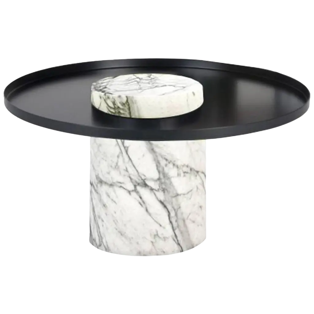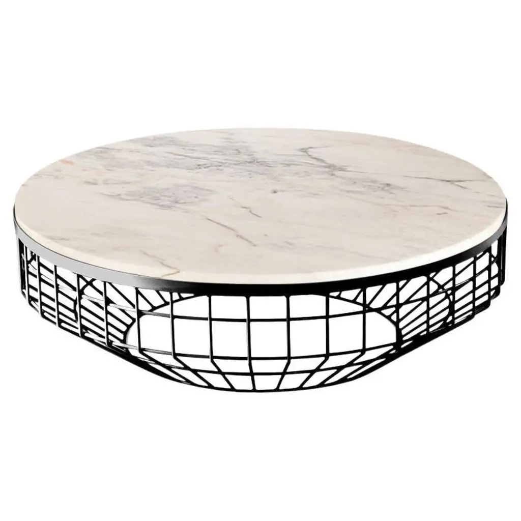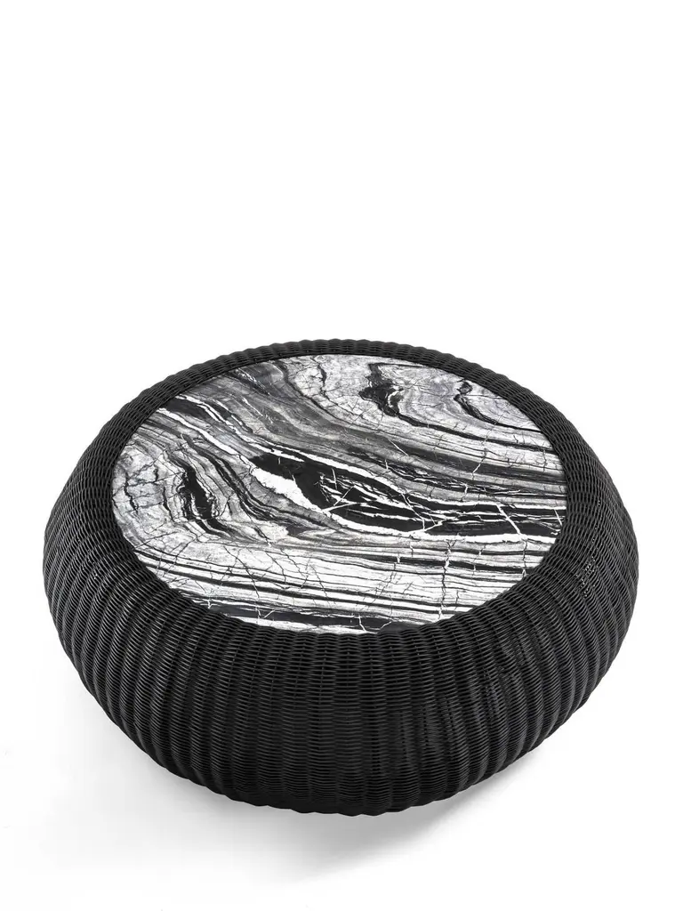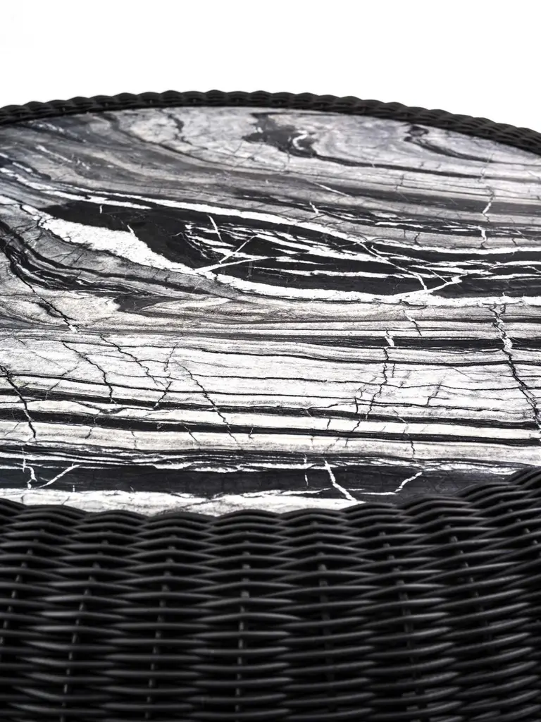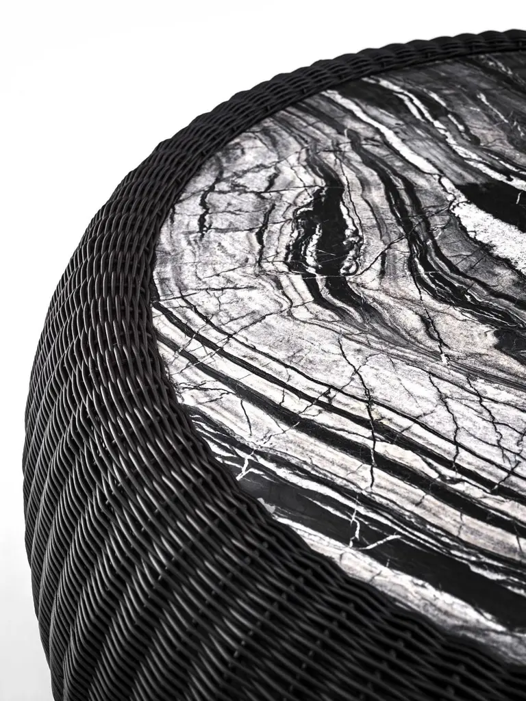 Silver wave "Amazonas" coffee table, Giorgio BonaguroDimensions: 40 height x 110 diameterMaterials: polished silver wave, natural wicker The "Amazonas" collection designed by Giorgio Bonaguro represents the debut of Morfosi in the Outdoor area. Characterized by the use of marble combined with wicker, it is inspired by the luxuriant and exuberant nature of Brazil. As the vegetation of rainforest flows and spreads from the earth to the light, so the wicker is born from the marble and creates sinuous and elegant shapes that incorporate and support the stone. Two natural materials that are not simply combined but intertwine to create new furnishing elements.The collection is characterized by: dining tables, coffee tables, side tables, lamps.Giorgio Bonaguro studied mechanical engineering in Modena and then graduated at Scuola Politecnica di Design in Milan, in the double Master of Industrial and Interior Design. He has worked in several design studios in Milan, first at Lorenzo Palmeri's, then with Francesco Faccin, at Michele De Lucchi's Studio. And then with the designer and critic MarCo Romanelli. He collaborates with several companies and develops limited editions presented at some international fairs such as Salone del Mobile, Design Miami, London Design Festival, Maison et Objet, Design Days Dubay, etc. He works between Italy and Brazil in the field of product design, interior design, exhibition and lighting, trying to combine a linear style with research and contamination between materials.