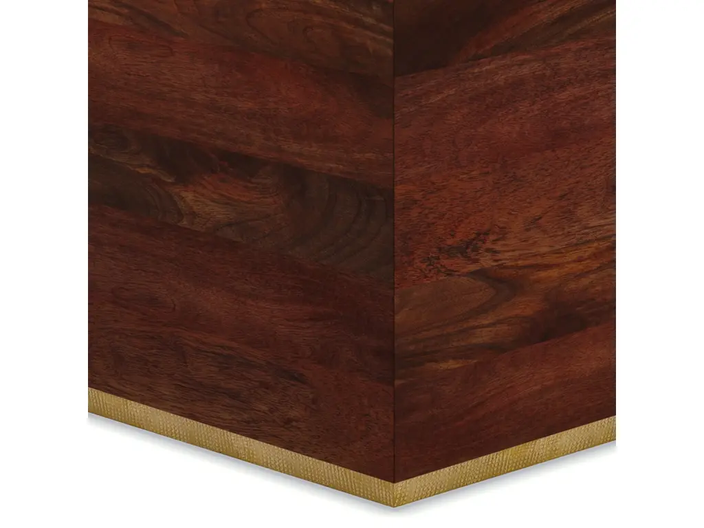 Make a statement with the Abba Coffee Table. Crafted from solid mango featuring a large square table top with angled geometric lines and brass accent trim. This simple yet dramatic coffee table has a striking presence in any modern living space.