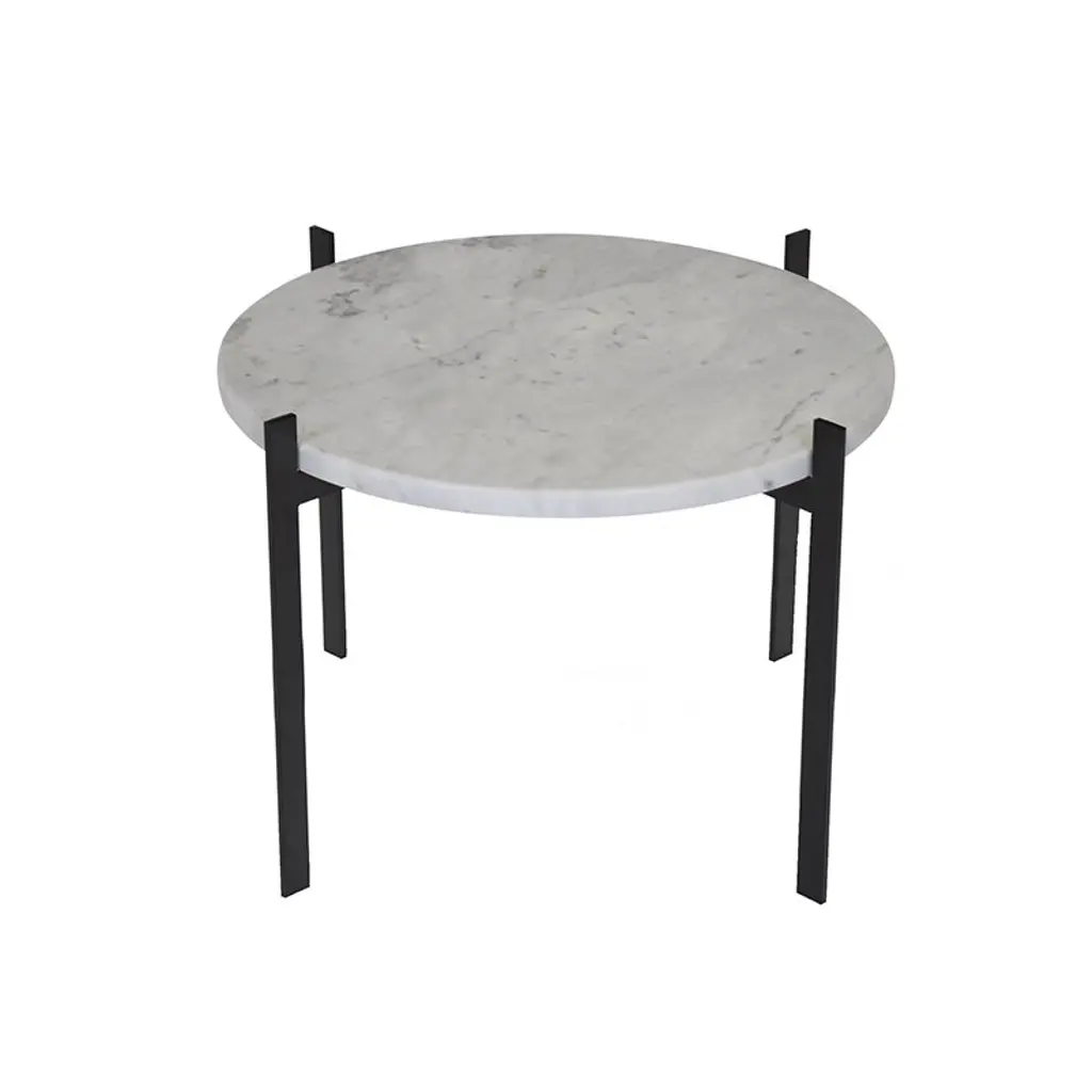 A bold combination of marble and metal, the Single Deck Table was designed by Dennis Marquart, a co-founder of the Danish design company OX Denmarq. Made of a round and vivid marble top and an angular, simplistic steel frame, the Single Deck Table is a striking choice as a coffee table for a living room or an extra table for various different decors. The Carrara marble from Italy gets its classic look from gray veins crossing the white stone, and small details such as cracks are also part of its natural character. The marble top is attached to the metal frame with screws.