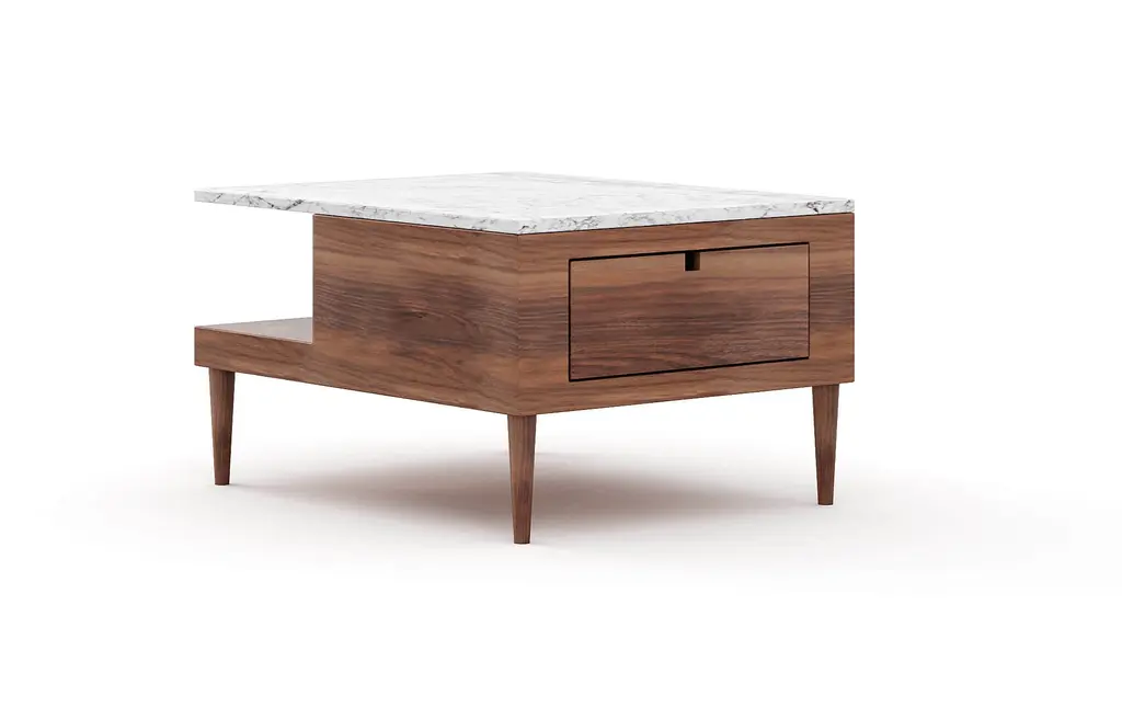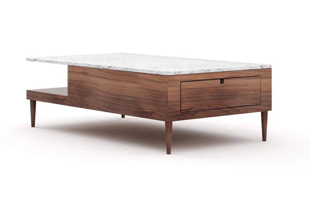Sino Large Rectangular Coffee Table features a cantilever in stone, creating an overhang over an open shelf. Bring the timeless beauty of marble into your space with both hidden and open storage to display all your living room essentials.Expertly crafted by hand in your choice of domestically sourced, FSC-certified Hard White Maple or American Walnut.