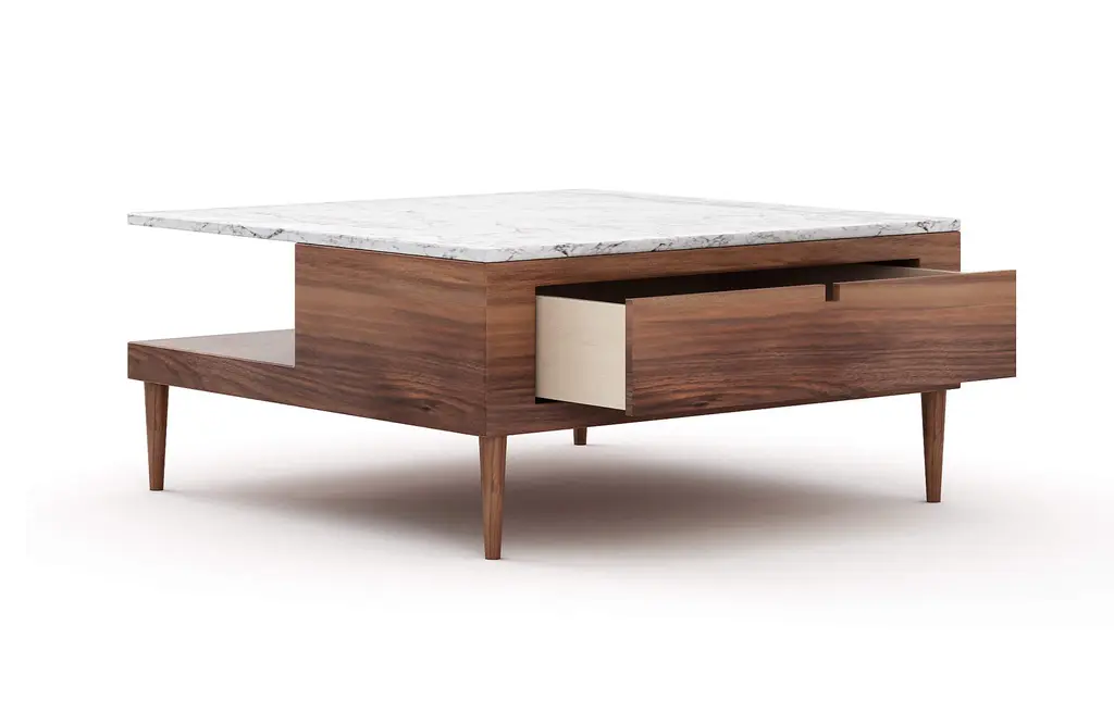 Sino Square Coffee Table features a cantilever in stone, creating an overhang over an open shelf. Bring the timeless beauty of marble into your space with both hidden and open storage to display all your living room essentials.Expertly crafted by hand in your choice of domestically sourced, FSC-certified Hard White Maple or American Walnut.