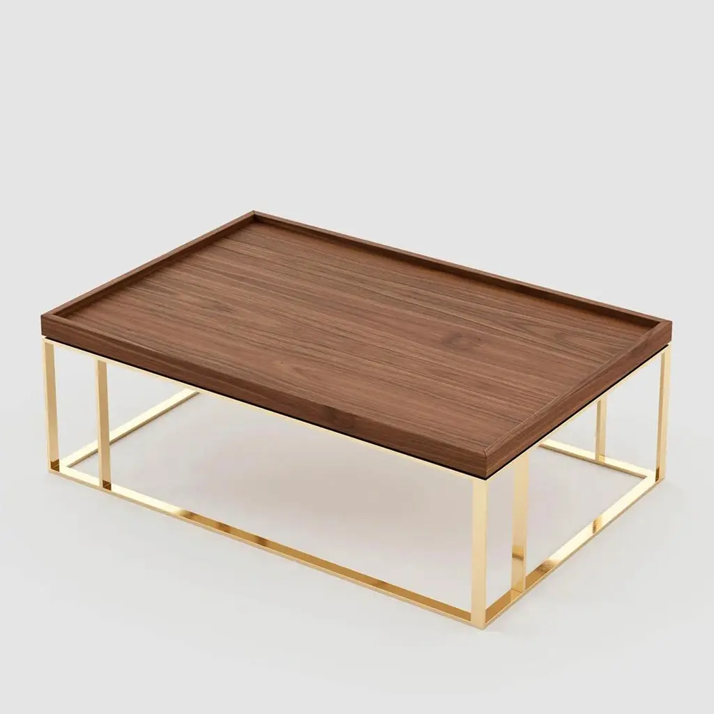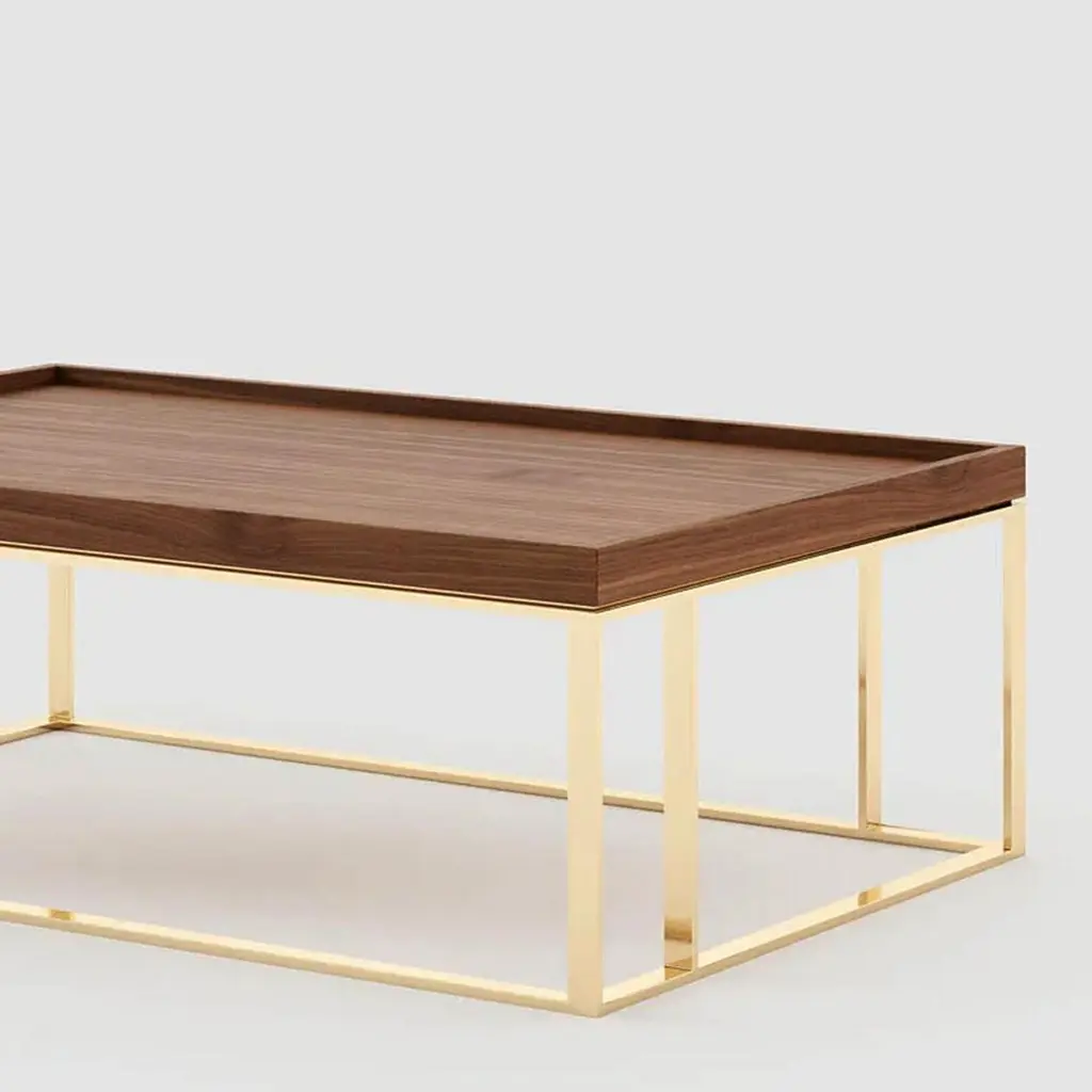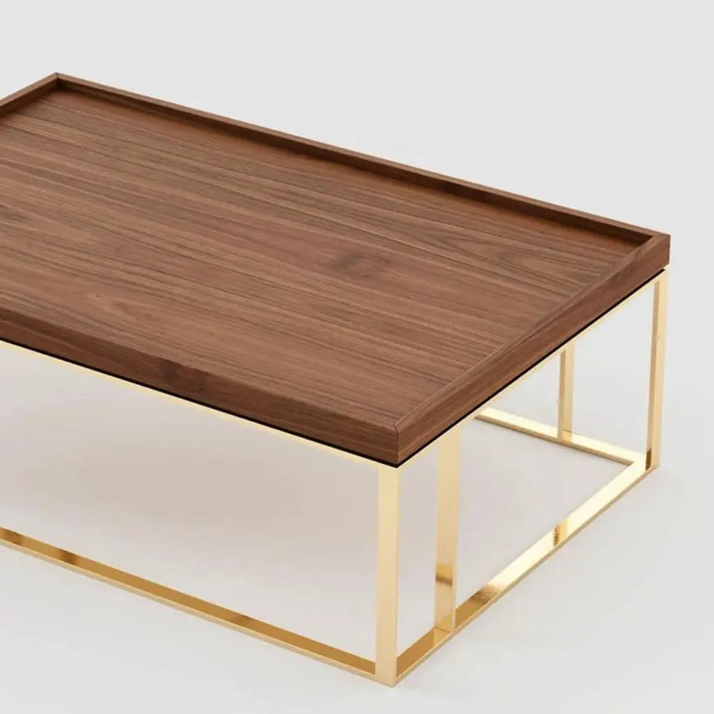 Coffee table slater with solid walnut top andwith polished stainless steel base in gold finish.Also available with other wooden finishes for topand other stainless steel finishes, on request includingup-charge.