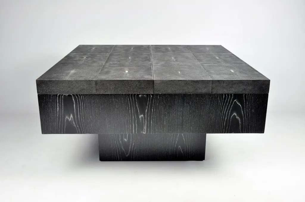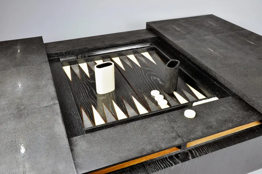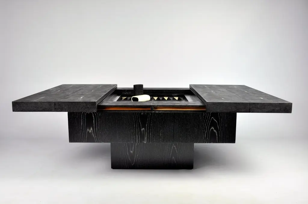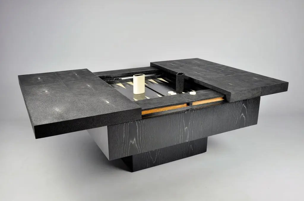 This coffee table is made for gamers.It has a sliding top. When it's closed your can play cards and when it's opened you can play backgammon.The table is made of shagreen and black and silver wood.This piece when it's closed hide totally the backgammon game board and can be used as any coffee table.Dimensions:Closed: 80x80x40cm (31.5" x 31.5" x 15.7")Opened: 130x80x40cm (51" x 31.5" x 15.7")Care instructions:To clean, simply wipe with a dry clean clothDo not use any cleaning agent on the surfaceKeep the shagreen dry and protected from direct sunlight and heat surfacesThis piece is 100% handmade by our talented team of master craftsmen.