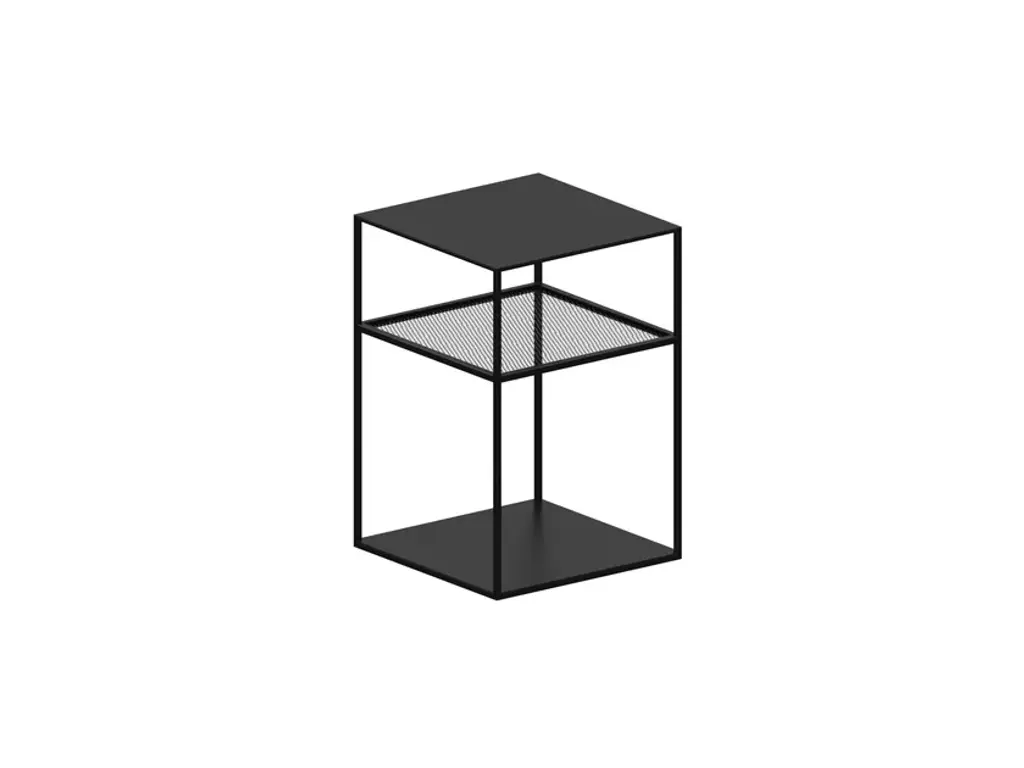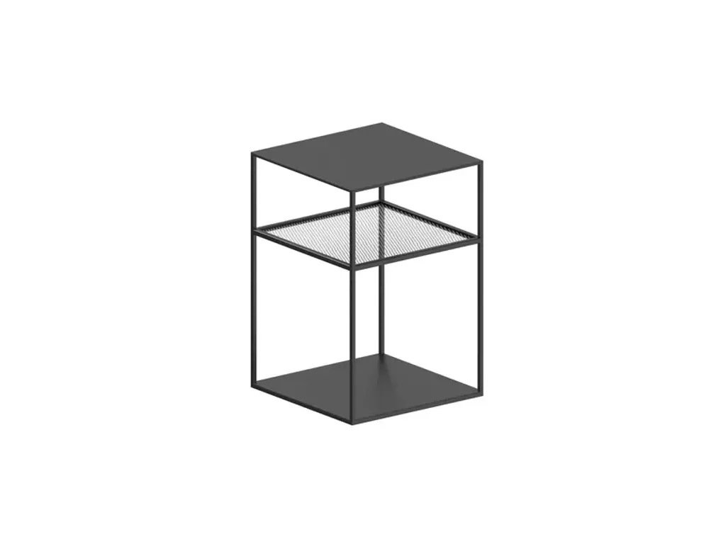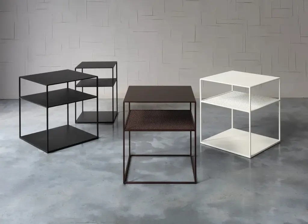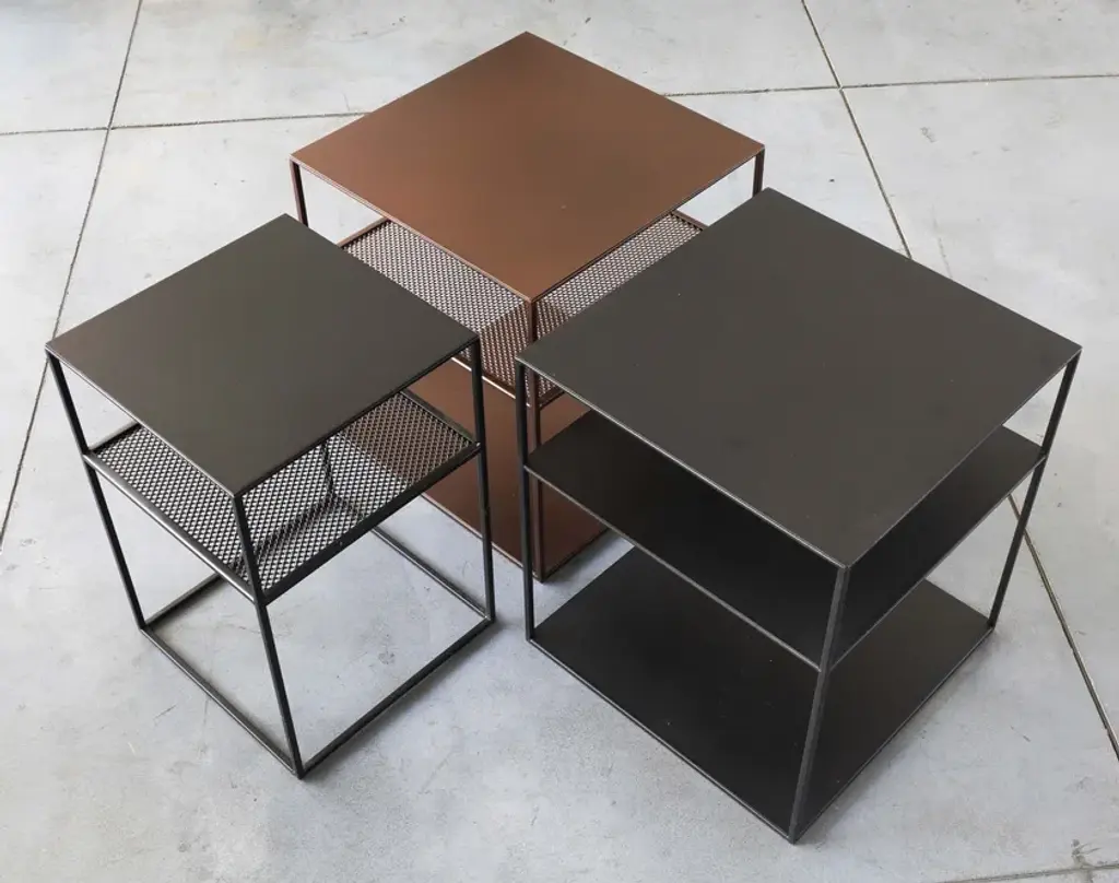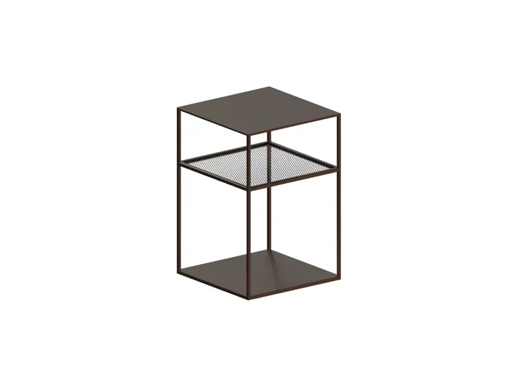SLIM IRONY TRIPLET is a low table with three shelves in two sizes. Structure made of solid drawn steel 8 x 8 mm. Shelves made of sheet metal. Intermediate shelf 15 cm below the top shelf. Base shelf not welded, removable. Powder coating in black copper sablé, embossed white or metallic brown."