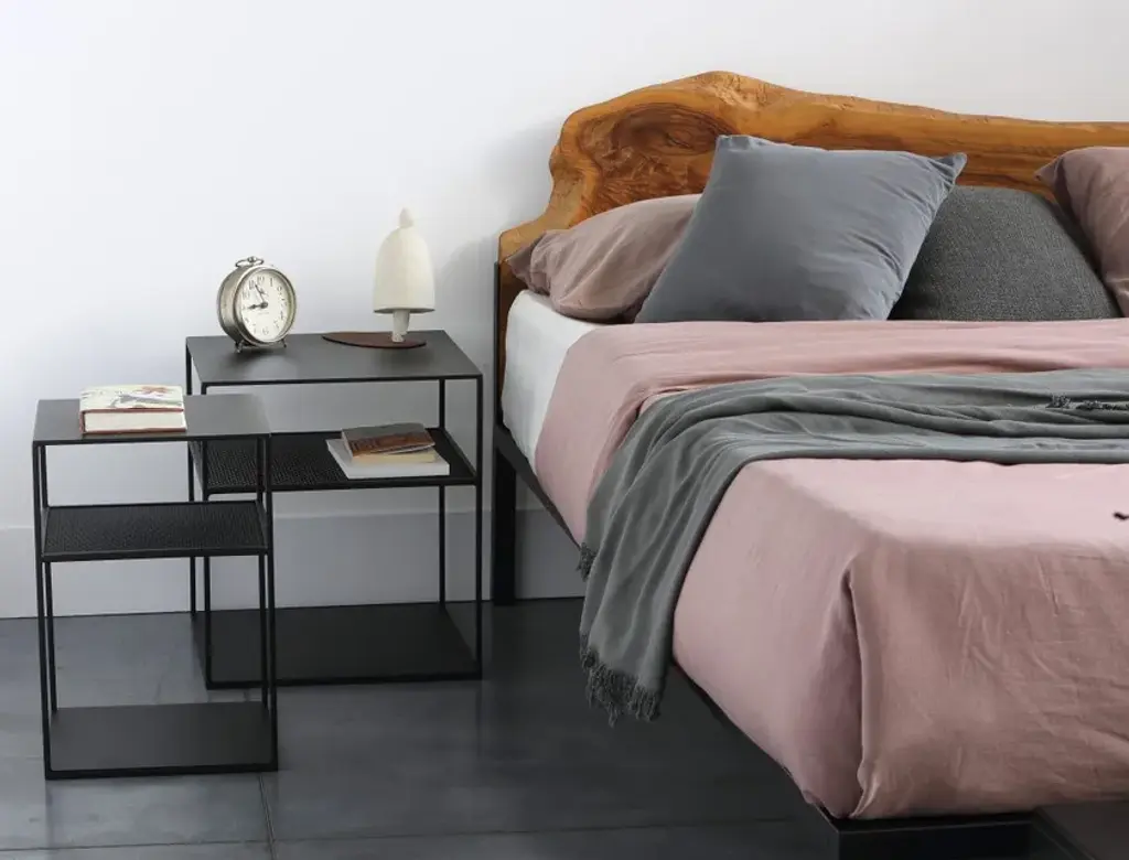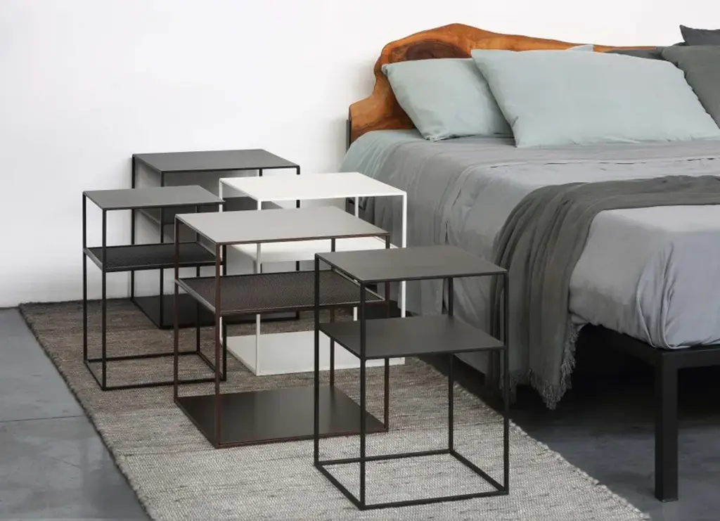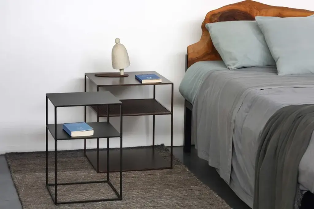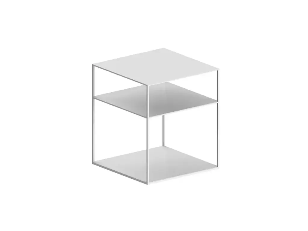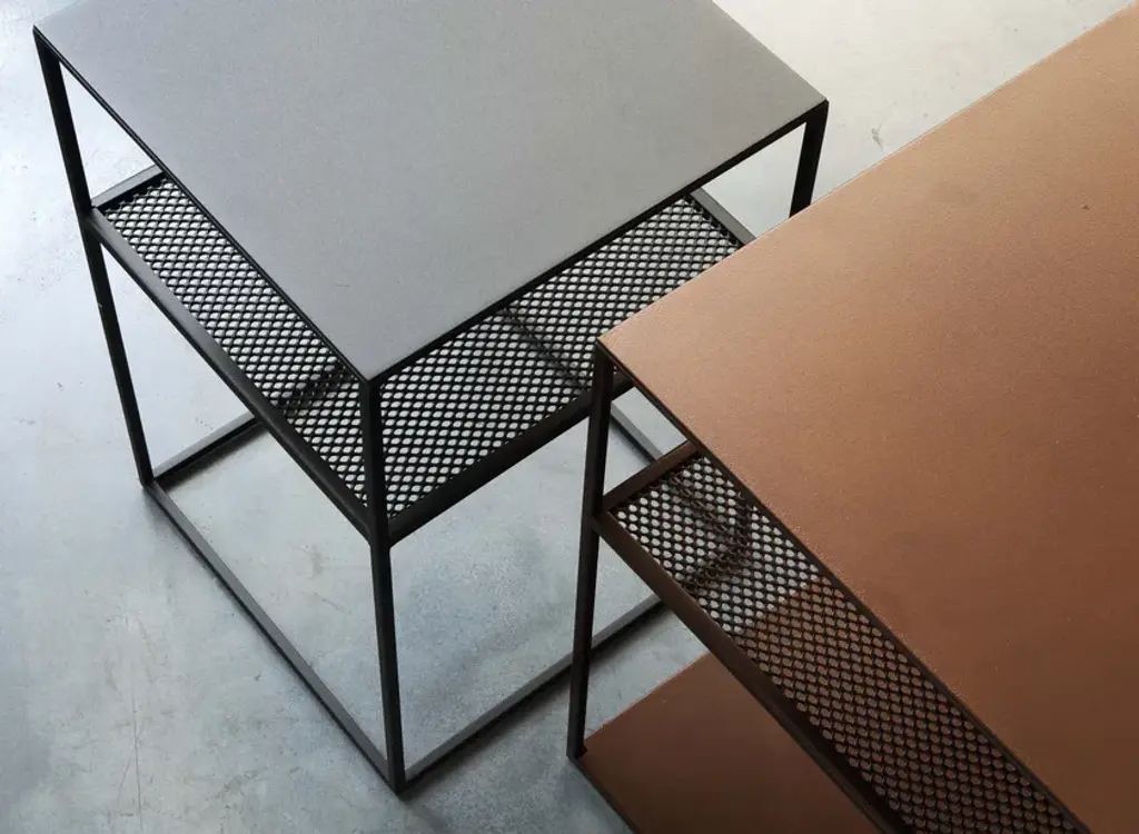 SLIM IRONY TRIPLET is a low table with three shelves in two sizes. Structure made of solid drawn steel 8 x 8 mm. Shelves made of sheet metal. Intermediate shelf 15 cm below the top shelf. Base shelf not welded, removable. Powder coating in black copper sablé, embossed white or metallic brown."