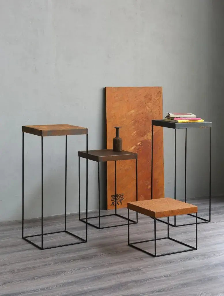 Slim Up is a square painted metal coffee table.Frame: Copper black sand-touch / Embossed whiteTop: Copper black sand-touch / Artistic rusty treatment / Semiopaque whiteCharacteristics:Products of Slim Irony collection in the ART version – both with sheet steel and glass top – are intentionally irregular and not homogenous. These are all made by hand and are therefore all unique pieces, no one the same as the others. It is not possible to foresee the final result of the ART treatment.