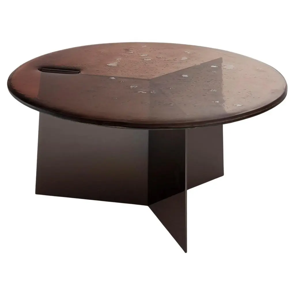 Distinguished by its sleek black glass top and burnished bronze base, this table blends modern elegance with timeless appeal. The smooth, reflective glass contrasts with the rich warmth of the bronze, creating a striking piece. Its compact size yet bold design make it an ideal addition to both contemporary living spaces and refined office settings, offering both functionality and artistic flair.