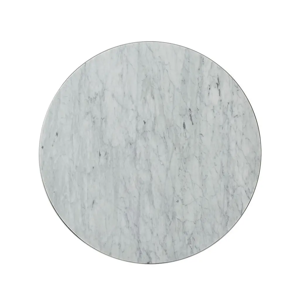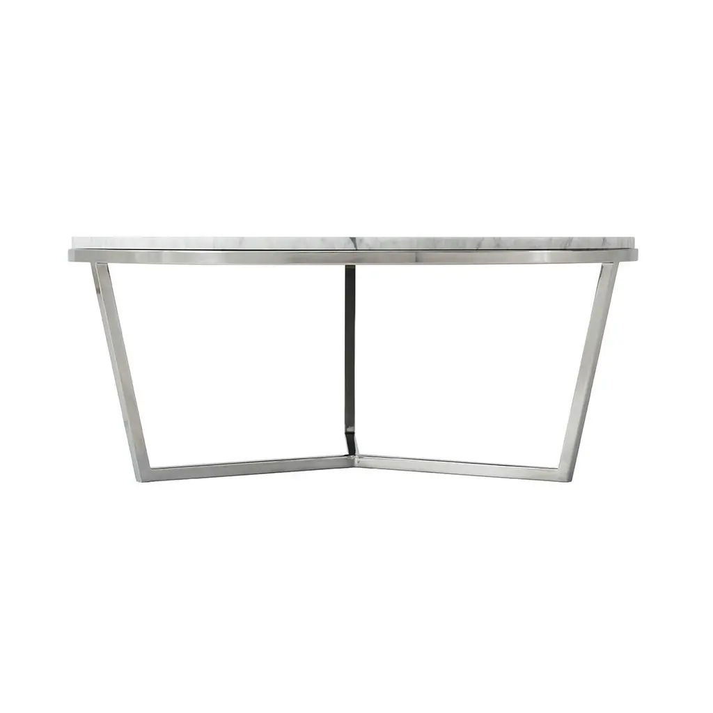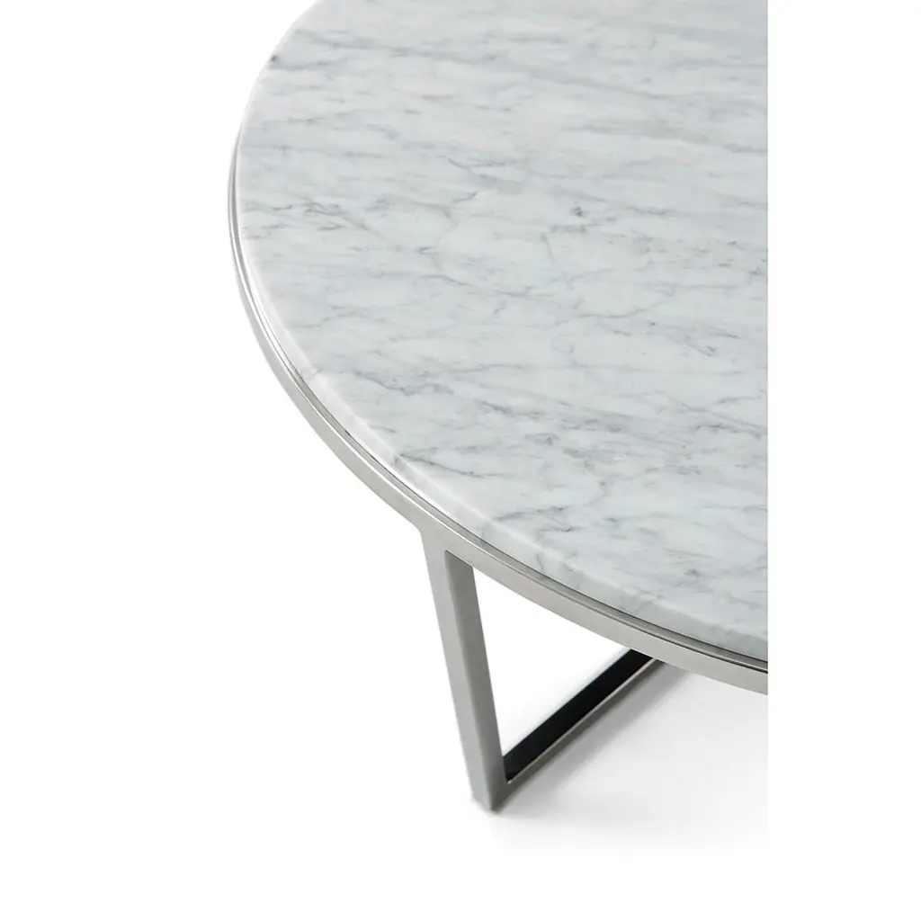 A small marble top coffee table on a polished nickel base with a stepped edge. The circular Bianco Carrara marble top sits on a modern polished three leg base.Dimensions: 35.5" W x 35.5" D x 14.5" H