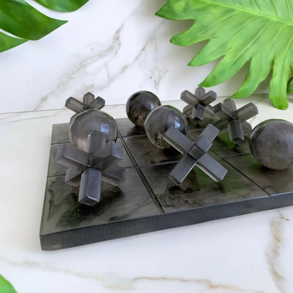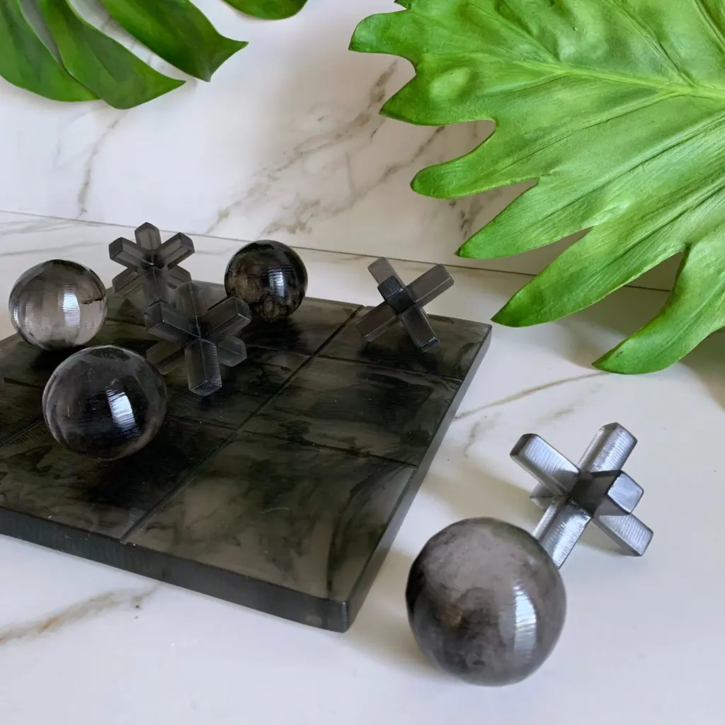 Our Tic Tac Toe is a beautiful, modern and fun take on the classic game. The three dimensional pieces and board are handmade in smoke resin with black marbled texture. It will be the coolest statement piece on any coffee table.Materials: Resin It contains 9 three dimensional pieces and 1 resin board.Designed by Paola Valle and manufactured in Mexico City by extraordinary artisans. Our goal is to work hand by hand to create outstanding pieces that will represent our passion.Please avoid placing your resin pieces in direct sunlight to avoid discoloration. All resin items are strong and durable but should be treated with care as they can break if dropped or knocked against a hard surface. Colors may vary slightly to the item shown in previous photos, as everything is handmade.Due to the nature of the material every piece will be unique and aesthetically different.