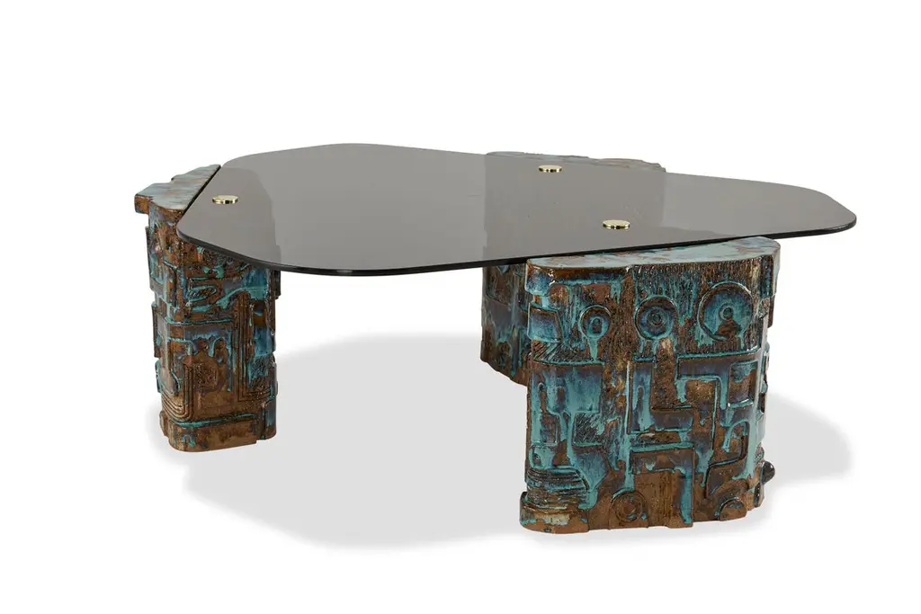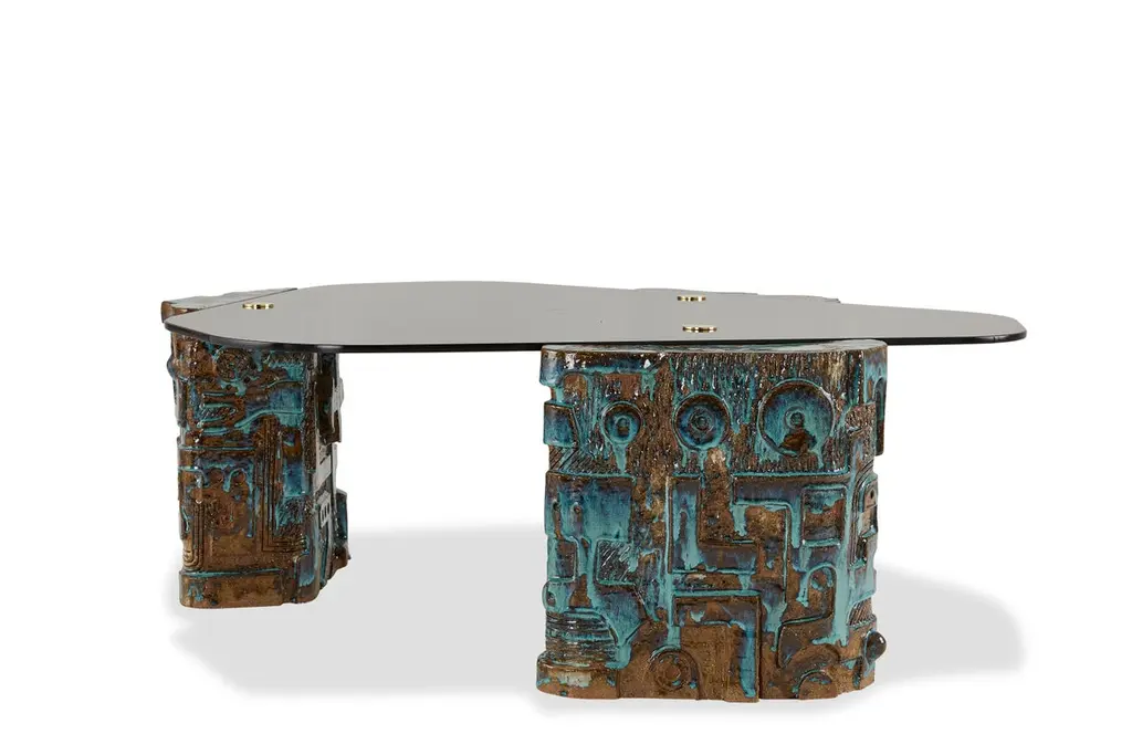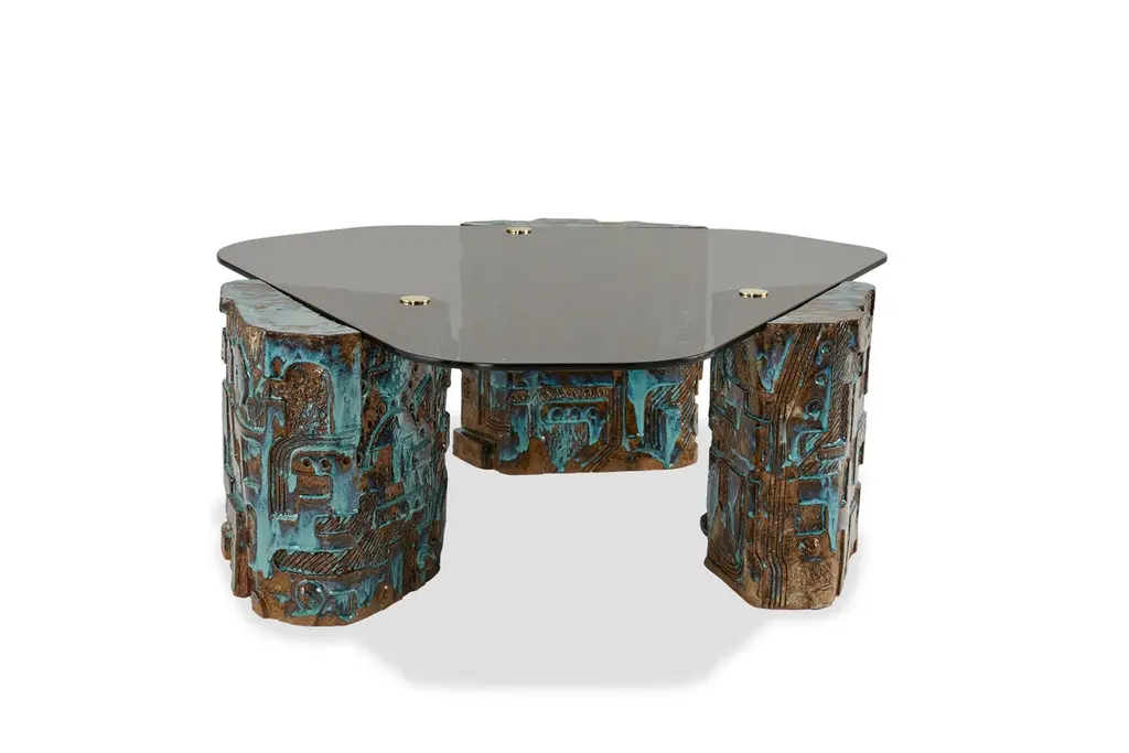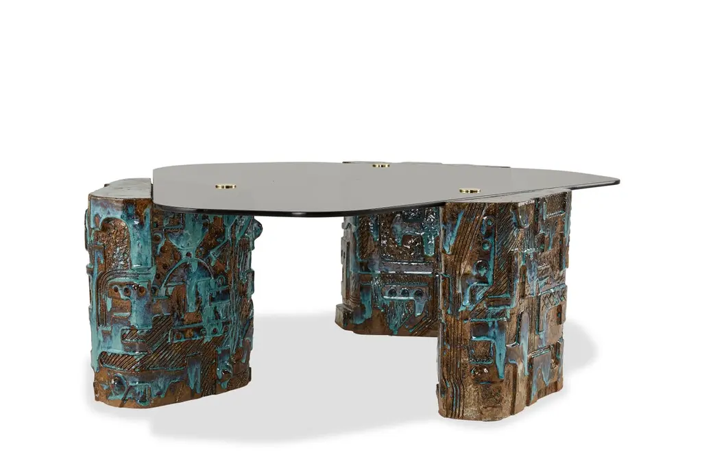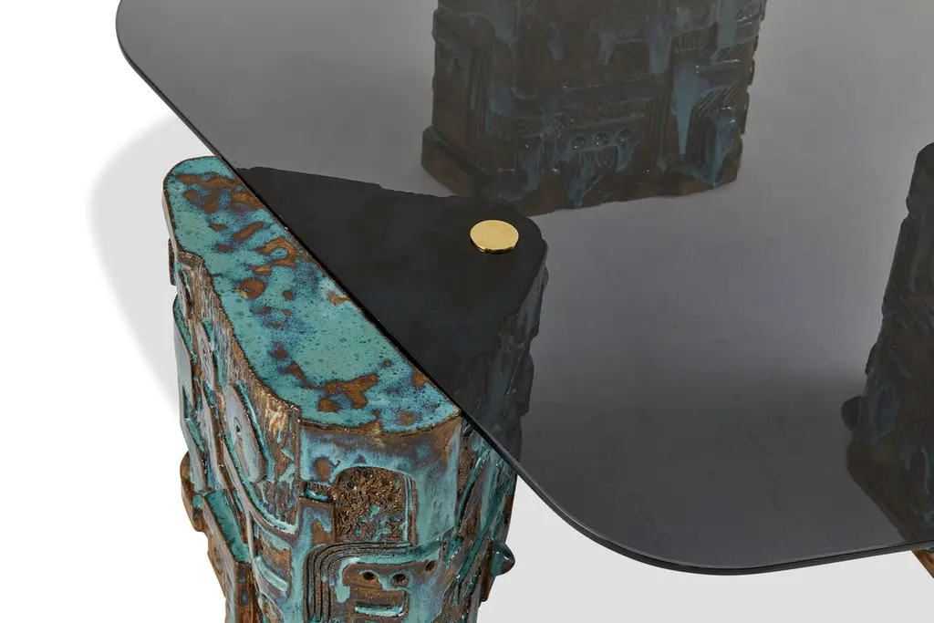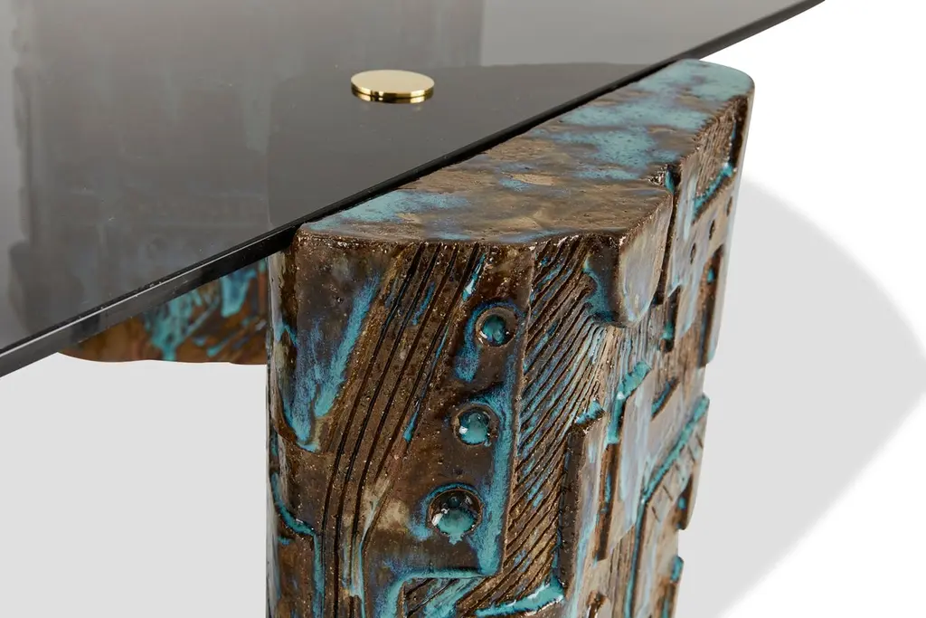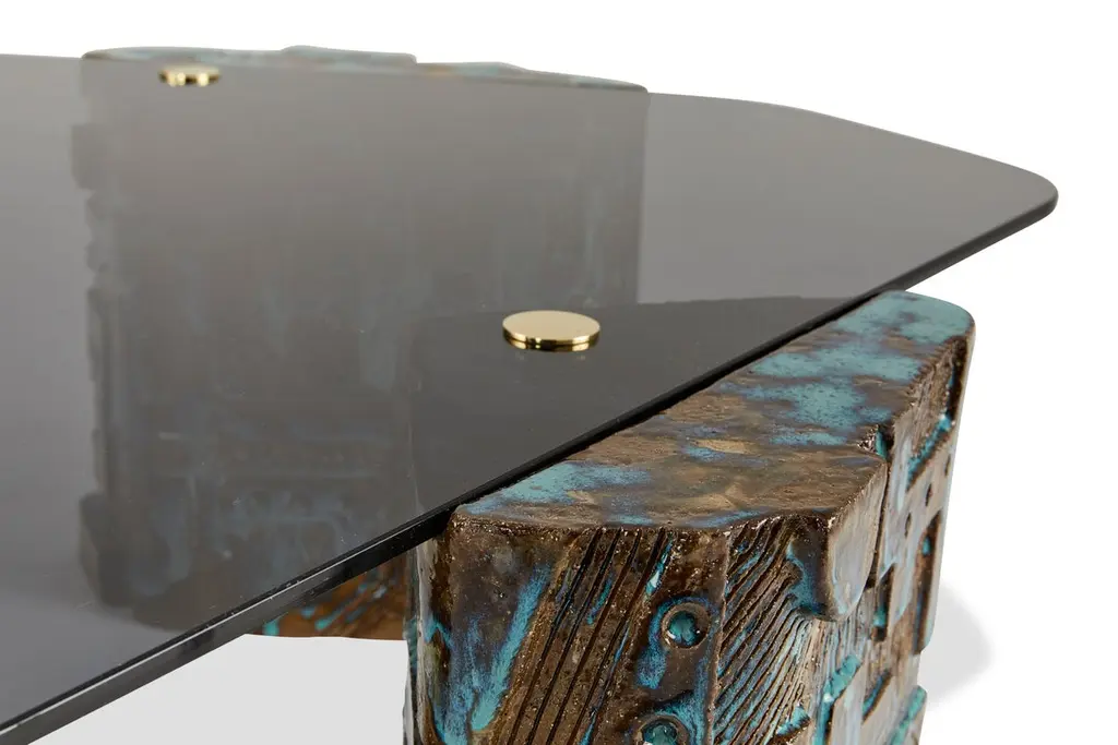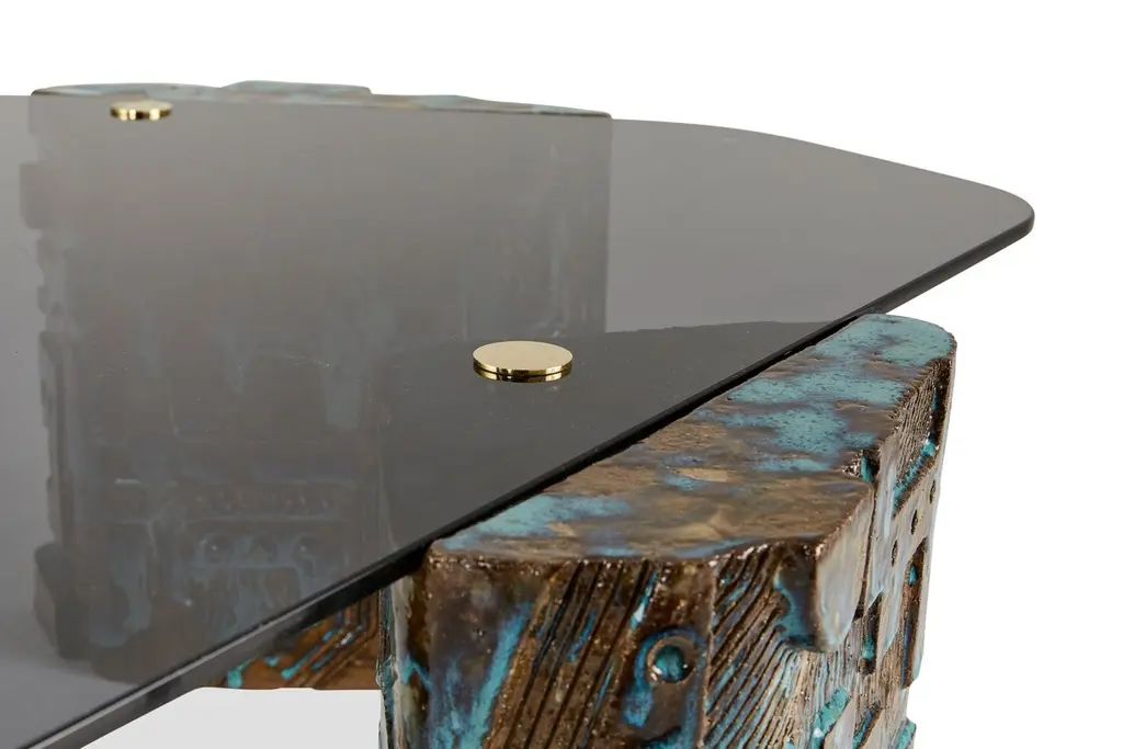 So Disco coffee table by Egg DesignsDimensions: 107. 7L x 107. 9D x 39 H cmMaterials: Smokey glass, walnut timber, brass, handmade ceramicFounded by South Africans and life partners, Greg and Roche Dry - Egg is a unique perspective in contemporary furniture inspired with a soul that’s deeply rooted in the African continent.We believe Egg has a distinctive African design dialect.We dream that our products will not only be judged by their function and form, but by the beauty of their eternal narrative.In everything we create we must answer the question, “Is it Egg enough?”Egg, is a spirited blend of heritage, passion, meaning and African soul. It stands the test of time. It’s curiosities that make you smile. It’s love and truth that can be seen from afar and equally found in the minutest details. That’s why every piece we craft comes from Africa and carries within it a part of the African soul. We’re a melting pot of tribal craft, African heritage and modern luxurious expression.“If it’s not Egg enough, it’s not worth doing!”We have widened the prism of contemporary African design in Modern Antiques, high-end Furniture, lighting and custom interiors inspired by an African provenance for a modern, international customer.