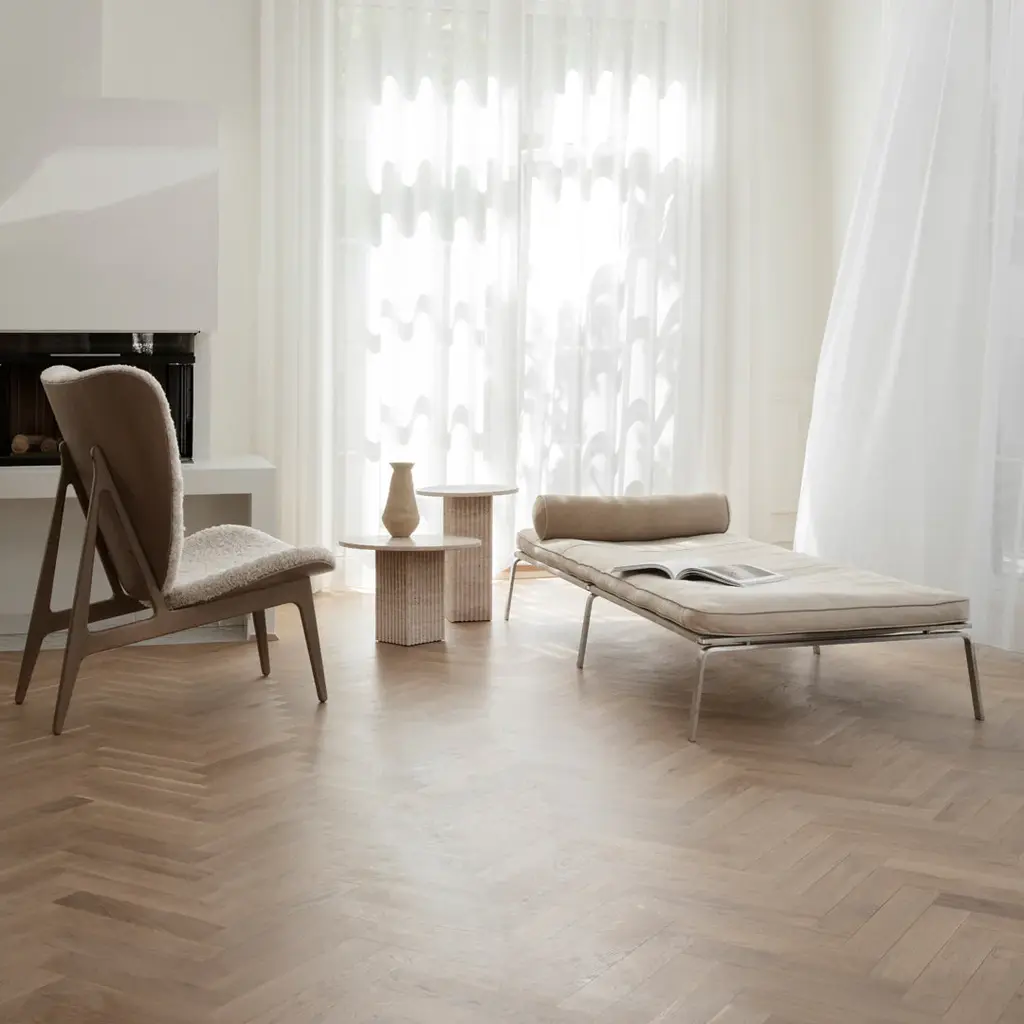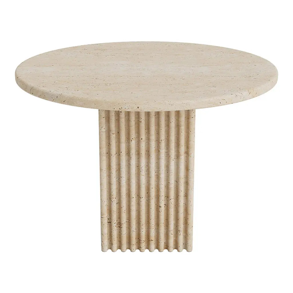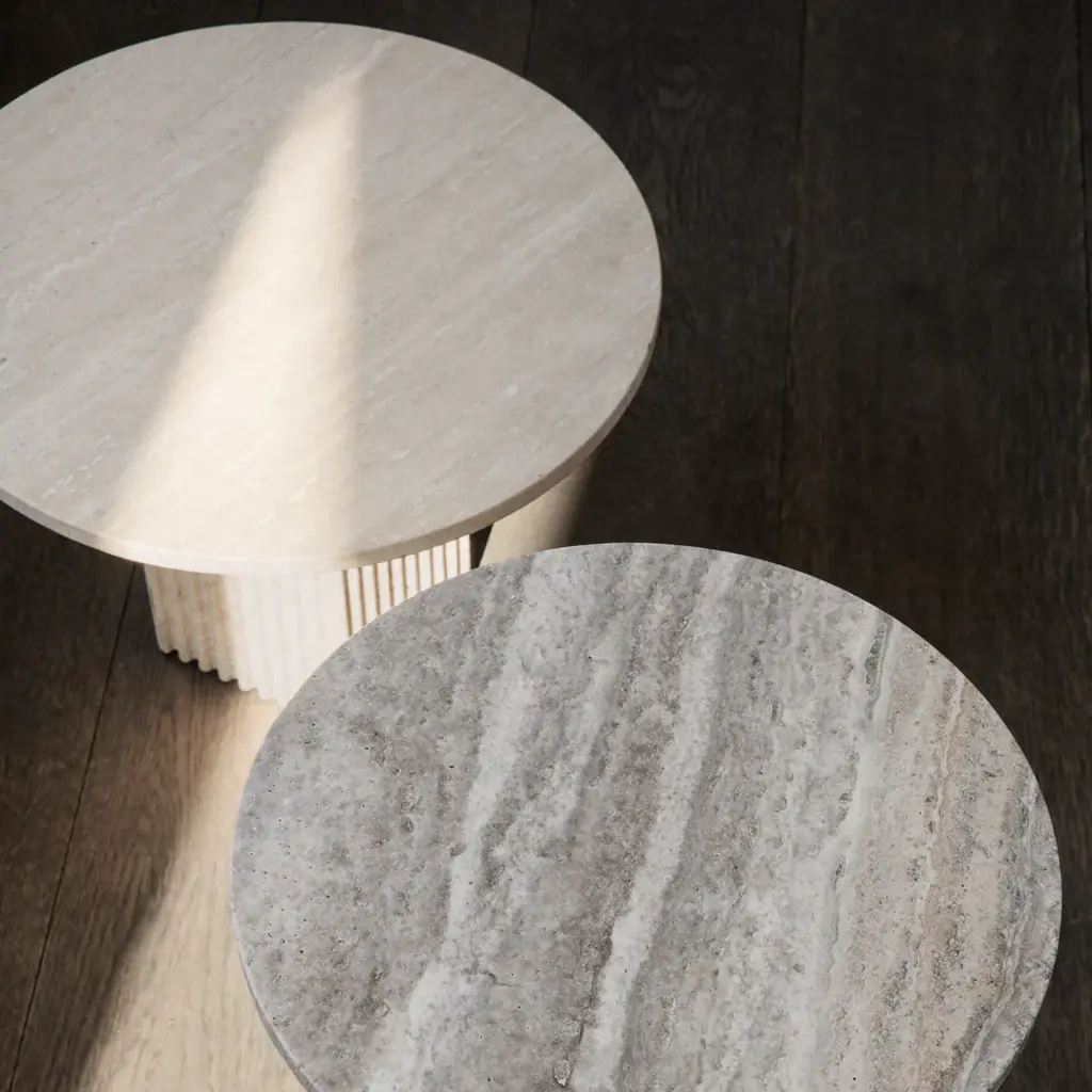Rich on architectural references, the Soho collection reminisces architectural building facades to create a vertical and slim table design. The fluted surface of natural stone adds a tactile feeling, while shadows changes depth and character of the stone surface throughout the day. Soho is made from travertine with a beautiful natural surface of small holes and incorrections. Made from travertine plates, the table is still lightweight and easy to move around.