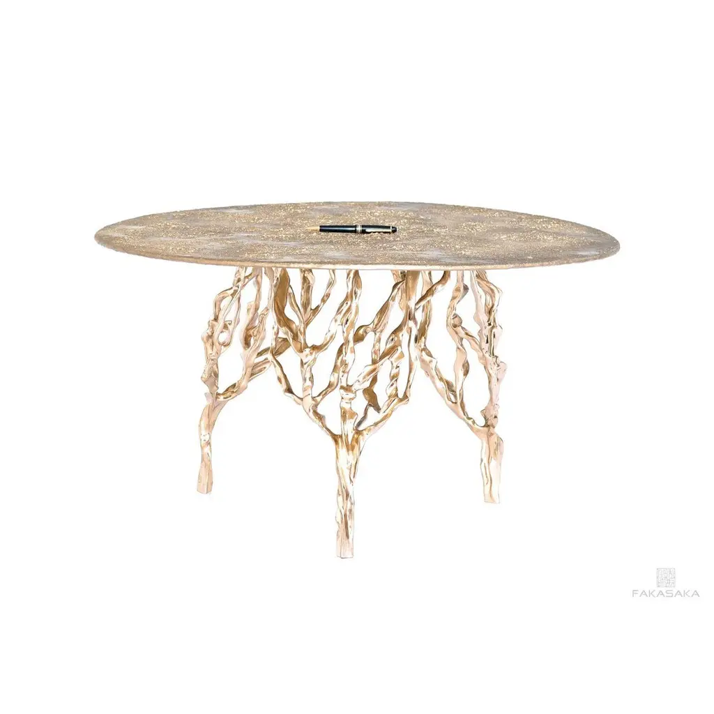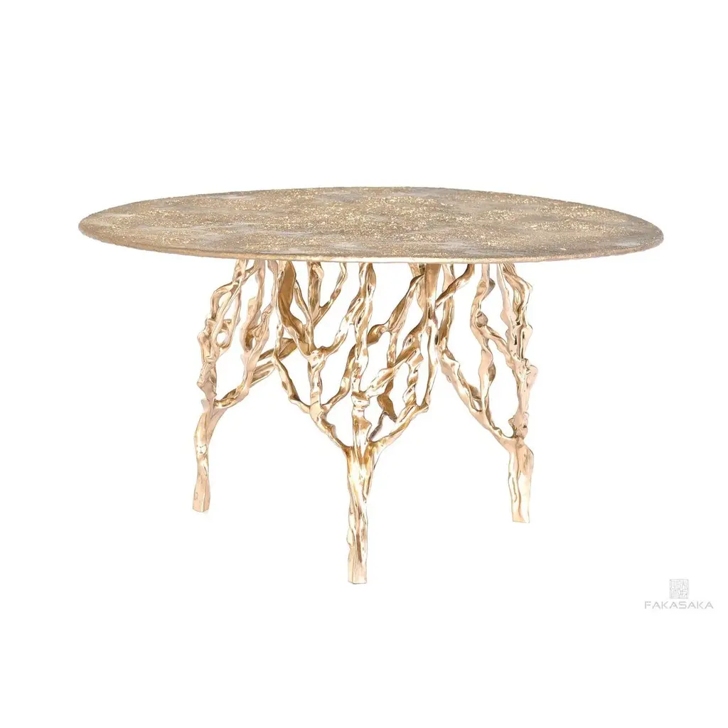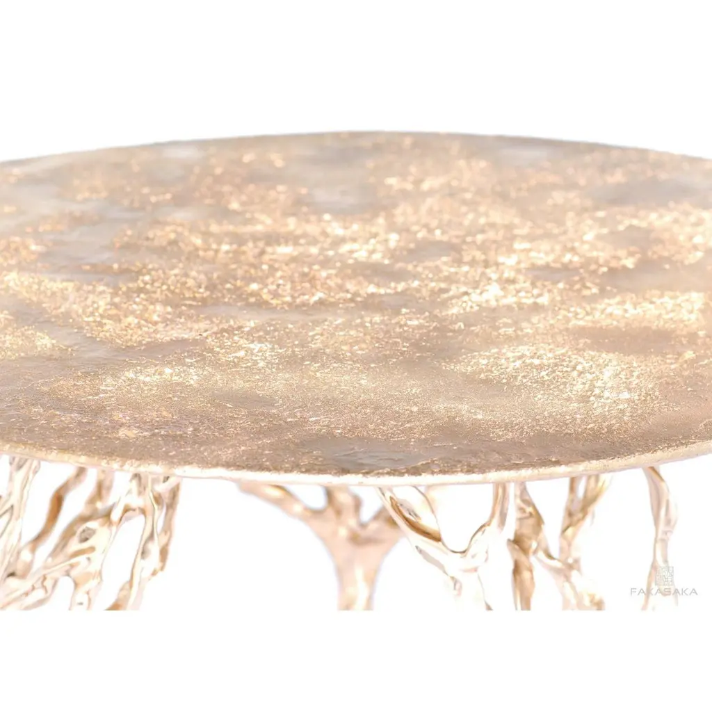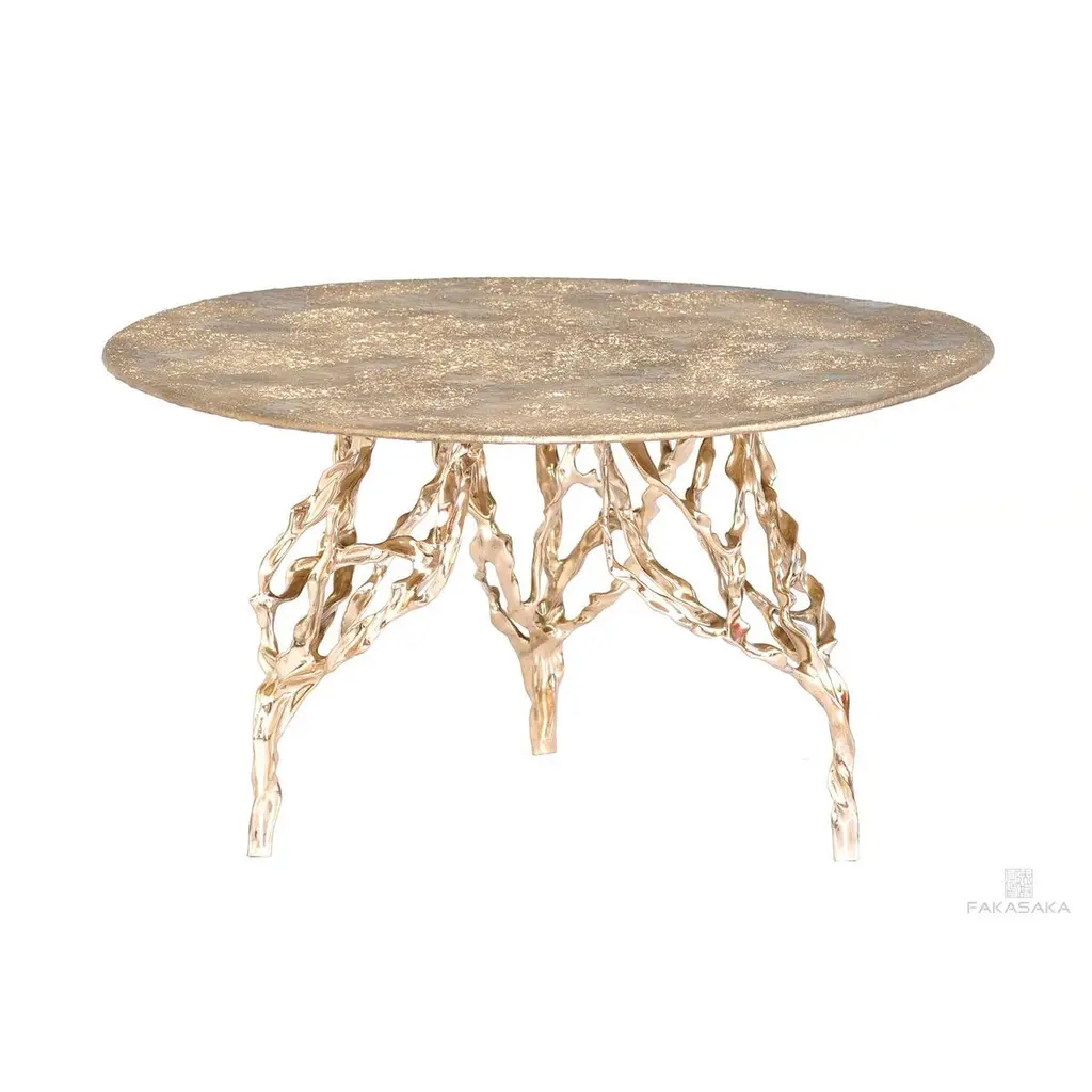 Sol cocktail table by Fakasaka Design.Dimensions: W 84 cm D 84 cm H 46.5 cm.Materials: polished bronze. FAKASAKA is a design company focused on production of high-end furniture, lighting, decorative objects, jewels, and accessories. Established in 2007, Fakasaka is the eponymous design company by Brazilian artist Fernando Akasaka distinguished by a penchant for producing intricate detailed cast bronze collectible design objects, furniture and jewelries. Fakasaka explores the contrast between the manmade and the natural through shapes and finishes that create a clear aesthetic. The constant challenge to balance elements is met with an outcome that is a striking assortment of bronze furniture and objects in oxidised and polished finishes, accented with precious regional stones, granites and rich prehistoric reptilian motifs.