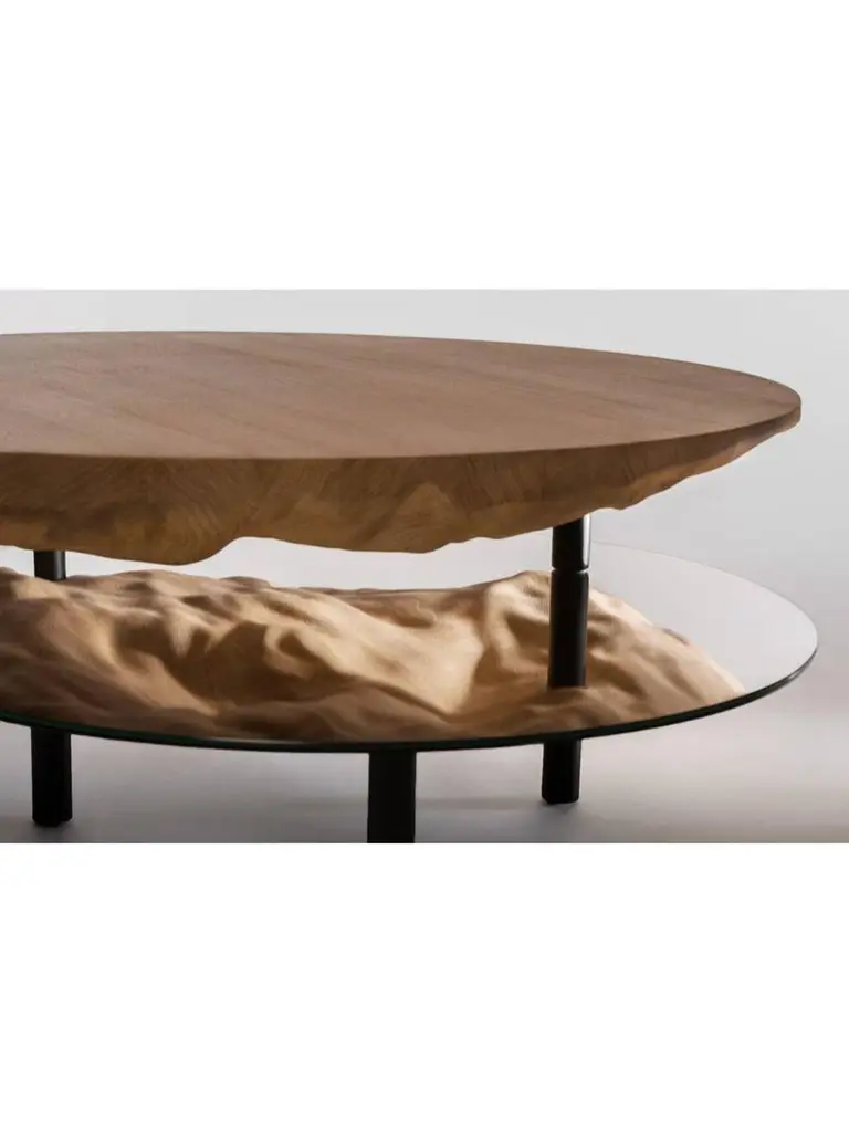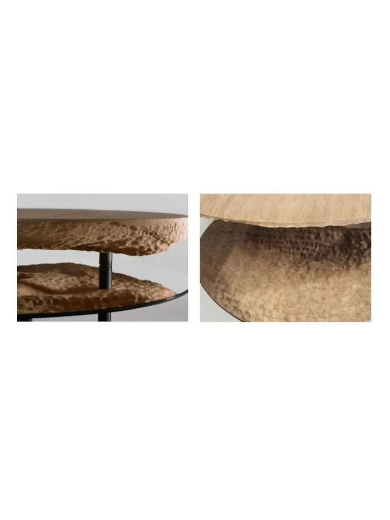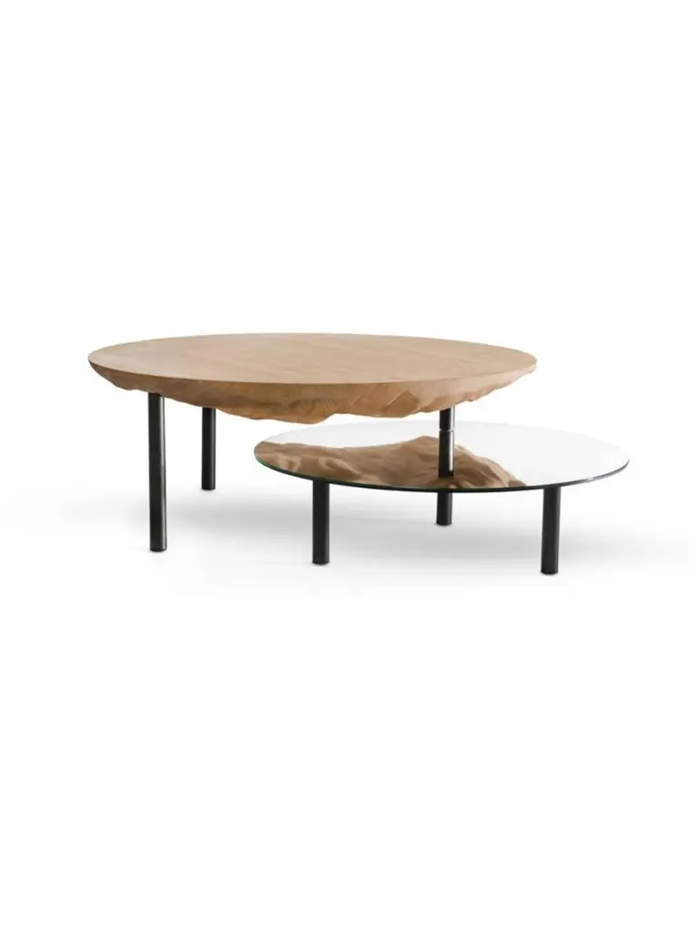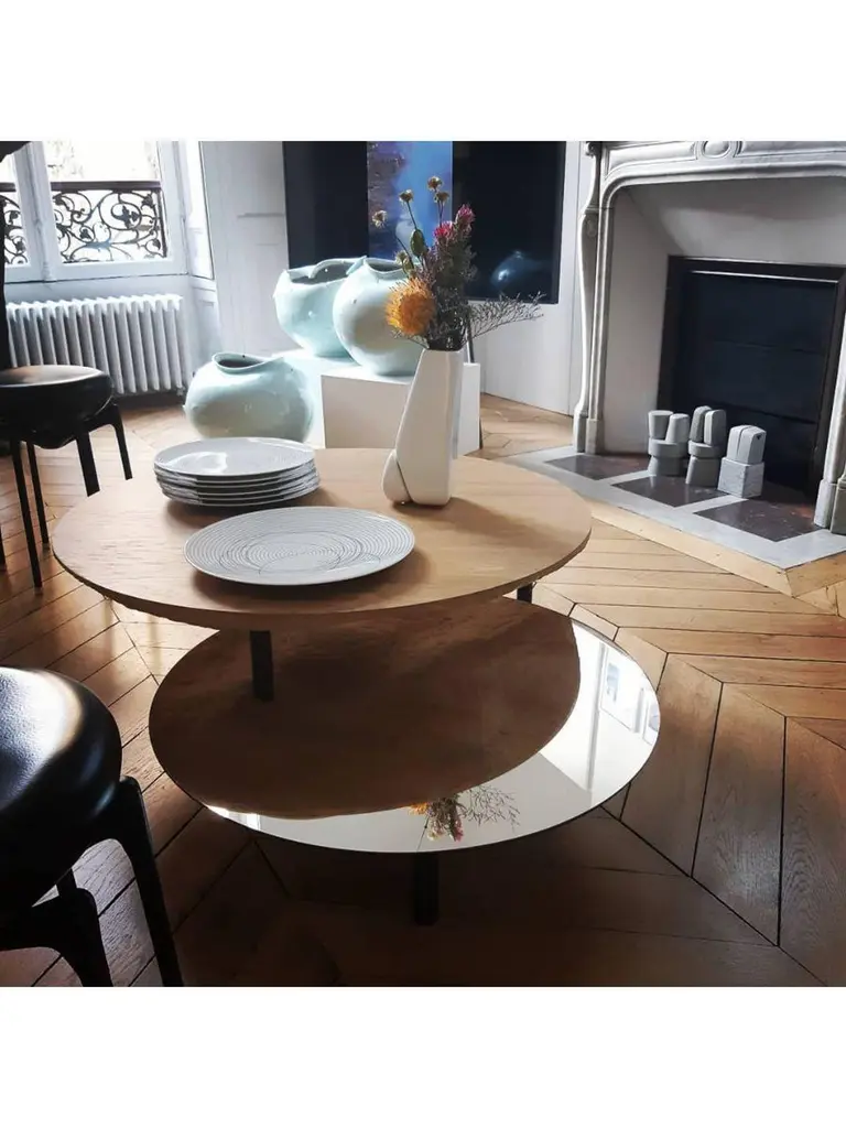 Solco coffee table by Plumbum Dimensions: Top table: Diameter 220" x height 94"Bottom table: Diameter 172" x height 45"Materials: Draped oak plate and rotary mirror.Also available in goushed oak.Solco is a playful coffee table. The simplicity of the object hides a sculptural surprise. Composed of two tops, the table reveals its hidden side with the help of the mirror sliding along the foot. Total or partial eclipse.At a time when we are forced to slow down, crafts appear as a way forward, where we create less but better. This trend is cultivated by Plumbum with an emphasis on pieces with a high density of soul, poetic, high-quality craftsmanship, and noble materials. By inspiring and using the wealth of heritage and local craftsmanship, Plumbum designs original pieces in innovative materials, from furniture to objects, in collaboration with contemporary designers.Art of living and art of doing together to offer customizable numbered signed collections and bespoke pieces between territorial heritage and delicacy of styles.Our carpentry & granite terrazzo workshops based near Toulouse are complemented by a solid network of South of France craftsmen with multiple skills to meet your needs while maintaining a single contact (upholstery, EPVart foundry, locksmithing, .).