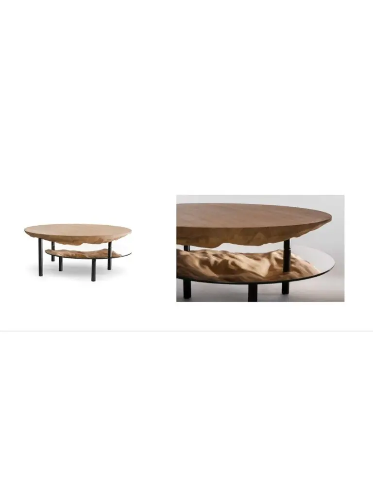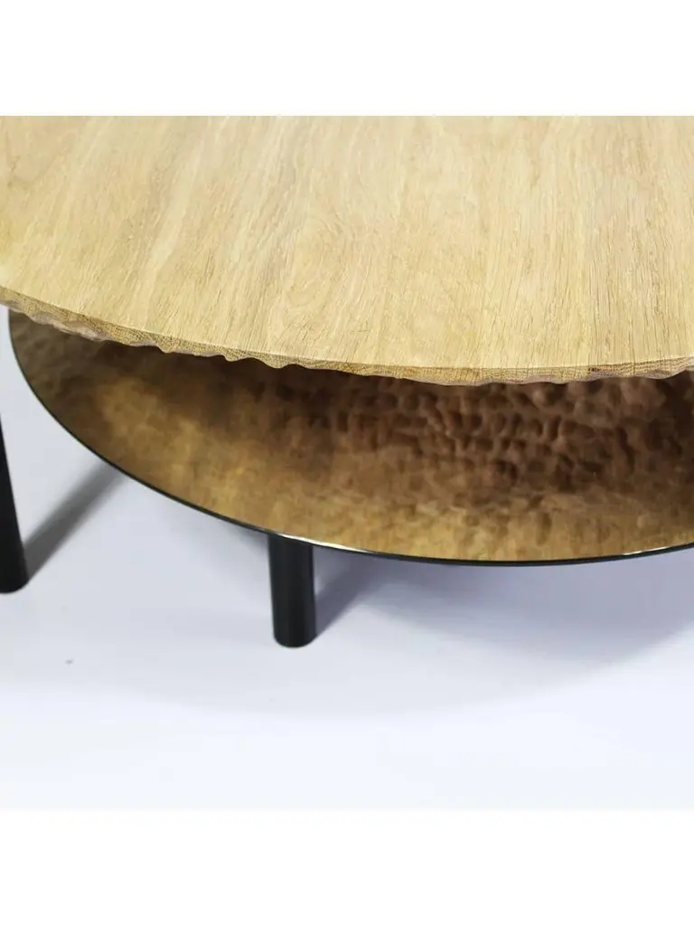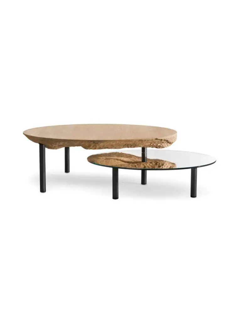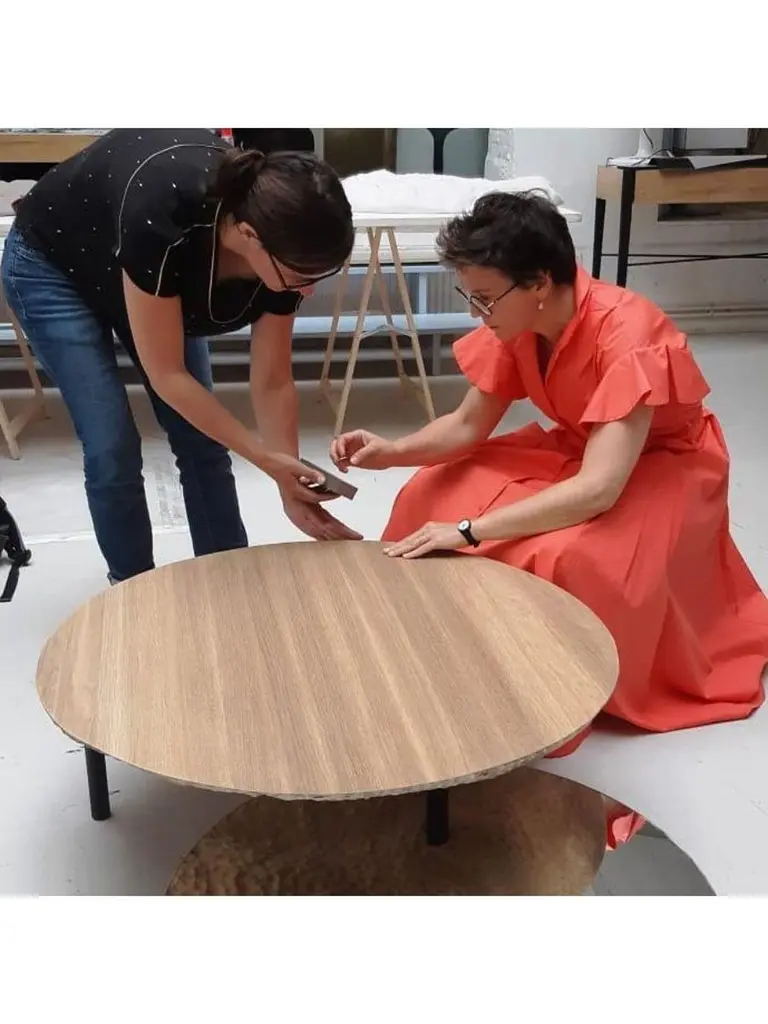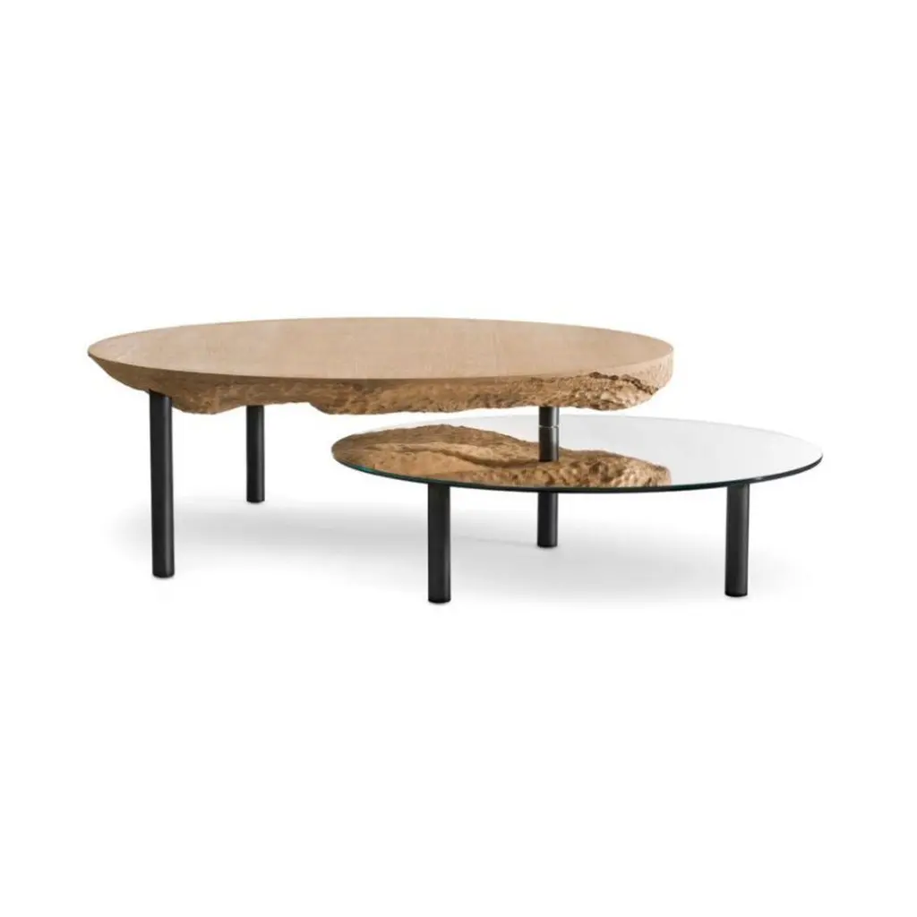 Solco coffee table by Plumbum Dimensions: Top table: Diameter 220" x height 94"Bottom table: Diameter 172" x height 45"Materials: Draped oak plate and rotary mirror.Also available in goushed oak.Solco is a playful coffee table. The simplicity of the object hides a sculptural surprise. Composed of two tops, the table reveals its hidden side with the help of the mirror sliding along the foot. Total or partial eclipse.At a time when we are forced to slow down, crafts appear as a way forward, where we create less but better. This trend is cultivated by Plumbum with an emphasis on pieces with a high density of soul, poetic, high-quality craftsmanship, and noble materials. By inspiring and using the wealth of heritage and local craftsmanship, Plumbum designs original pieces in innovative materials, from furniture to objects, in collaboration with contemporary designers.Art of living and art of doing together to offer customizable numbered signed collections and bespoke pieces between territorial heritage and delicacy of styles.Our carpentry & granite terrazzo workshops based near Toulouse are complemented by a solid network of South of France craftsmen with multiple skills to meet your needs while maintaining a single contact (upholstery, EPVart foundry, locksmithing, .).