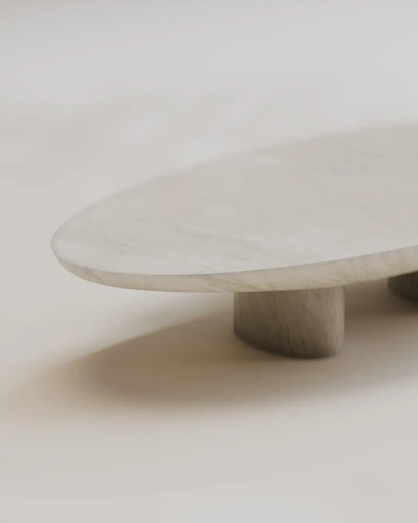 Introducing the "Abraccio" Collection or translated "embrace" Collection unites the enduring beauty of solid carved marble with a language of form that pays homage to primitive structures. Two primal shaped columns support a commanding horizontal solid slab. It becomes a conversation between classical and contemporary, nature and craftsmanship, geometric precision and organic shapes. Yet, it's the ellipsoid embrace that truly defines the collection's character. These graceful curves, meticulously carved into the stone, encircle the columns like an enigmatic story waiting to be deciphered. This ellipsoidal motif not only adds a layer of visual allure but also imparts a sense of unity and balance, bridging the gap between the geometric precision of the columns and the softer lines of the surrounding space.Hand crafted solid marble by Serafini. Each stone will be selected together with the client to create the desired effect. Custom stones/marbles are possible upon request. We can also do different sizes.