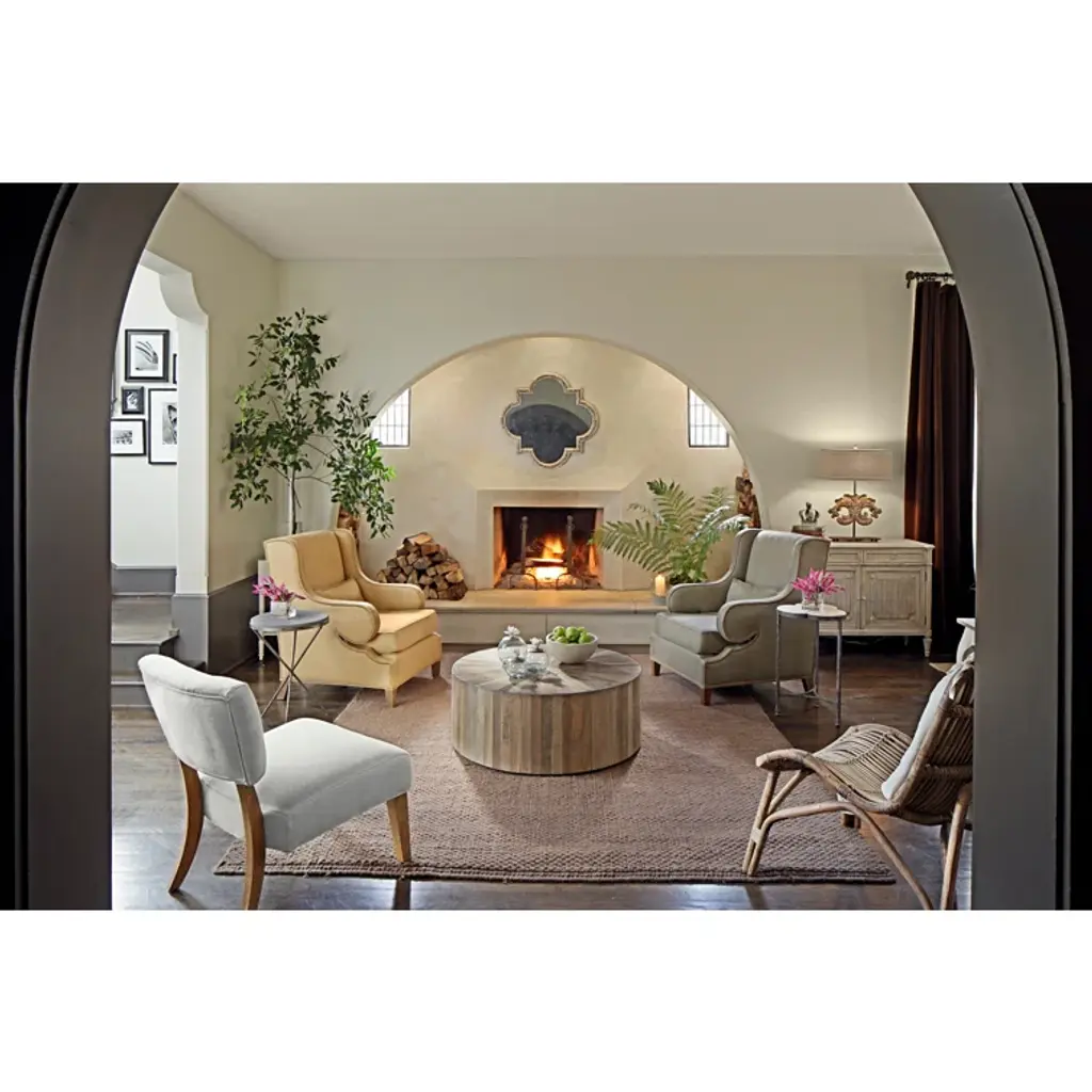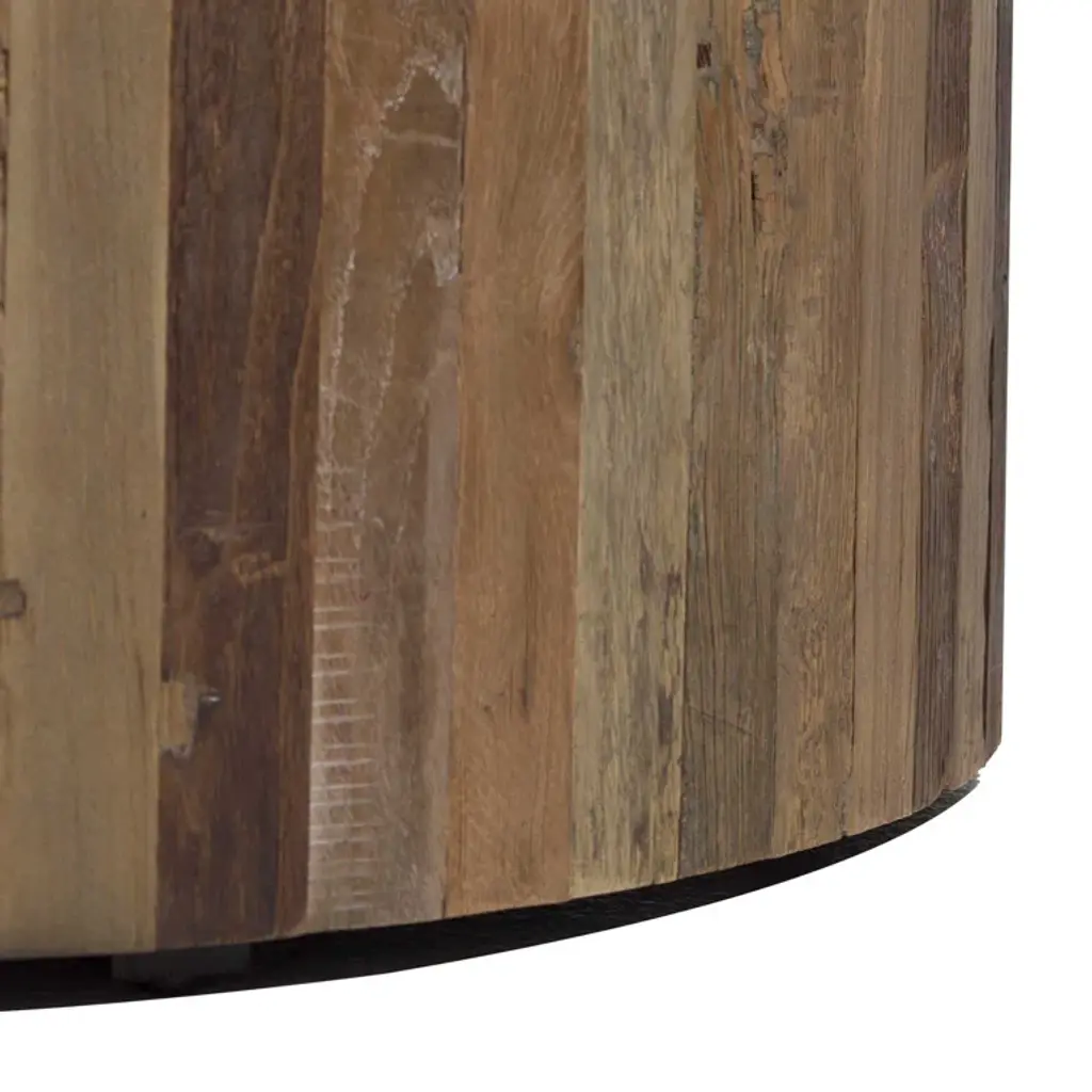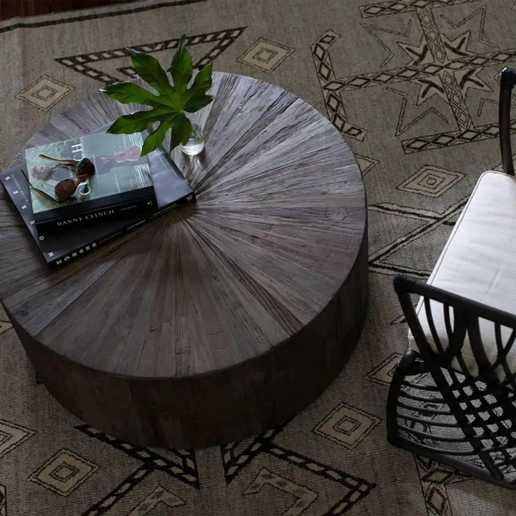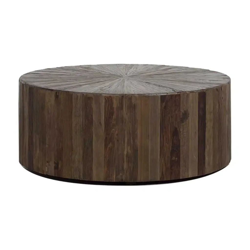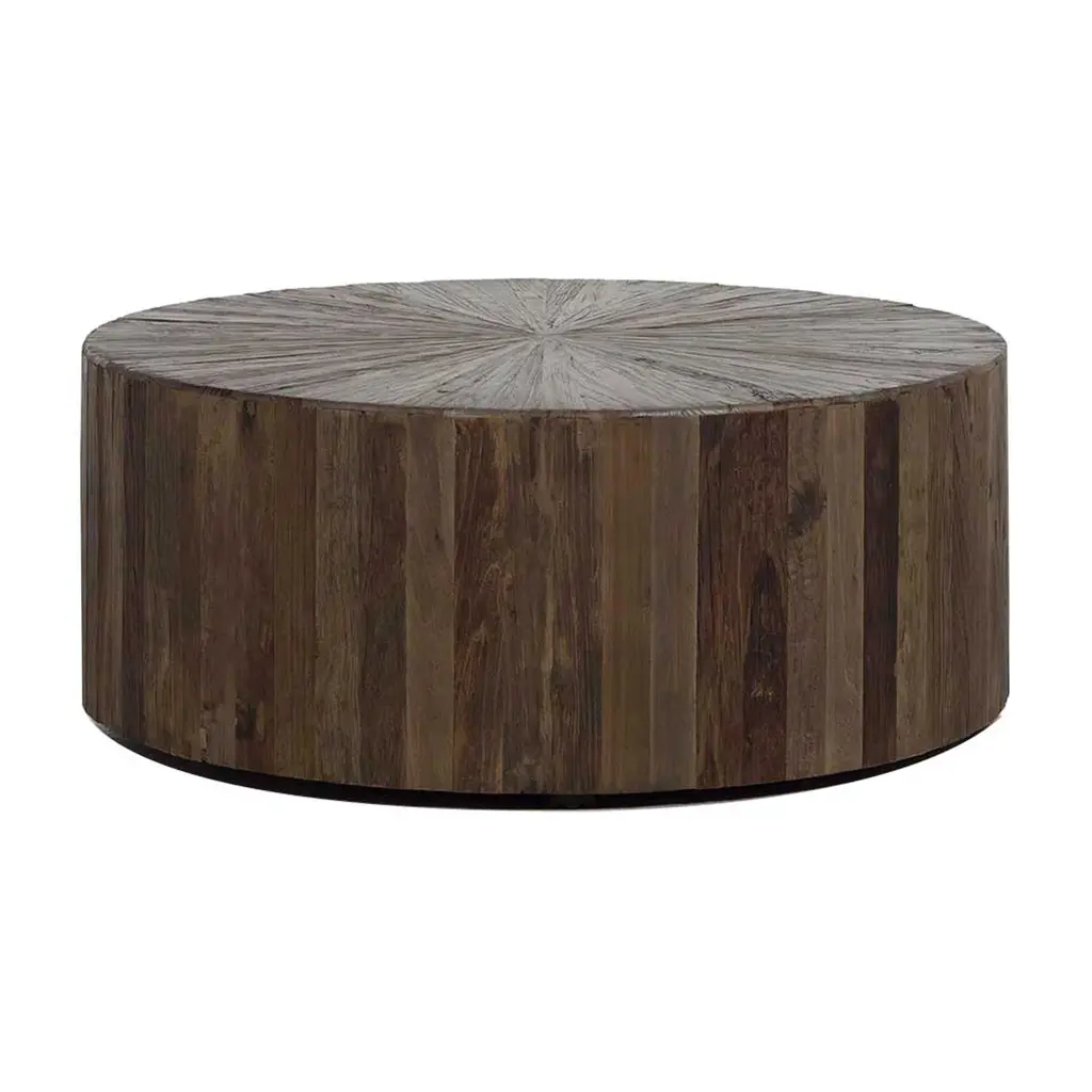 The circular Cyrano coffee table is inlaid with differing shades of reclaimed wood. The table is slightly elevated off the floor for a chic and minimalistic option. Finished with a water-based sealer for the ultimate spill-proof piece.