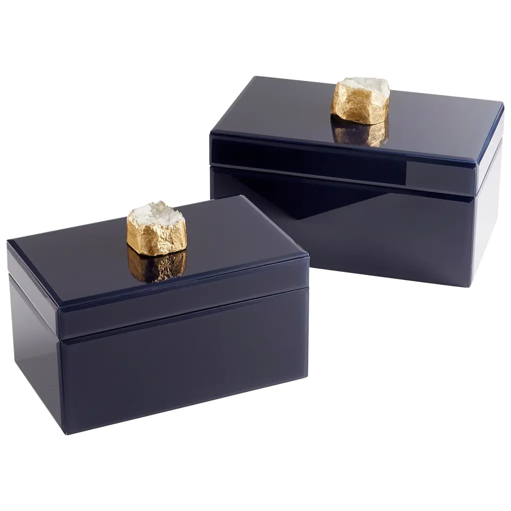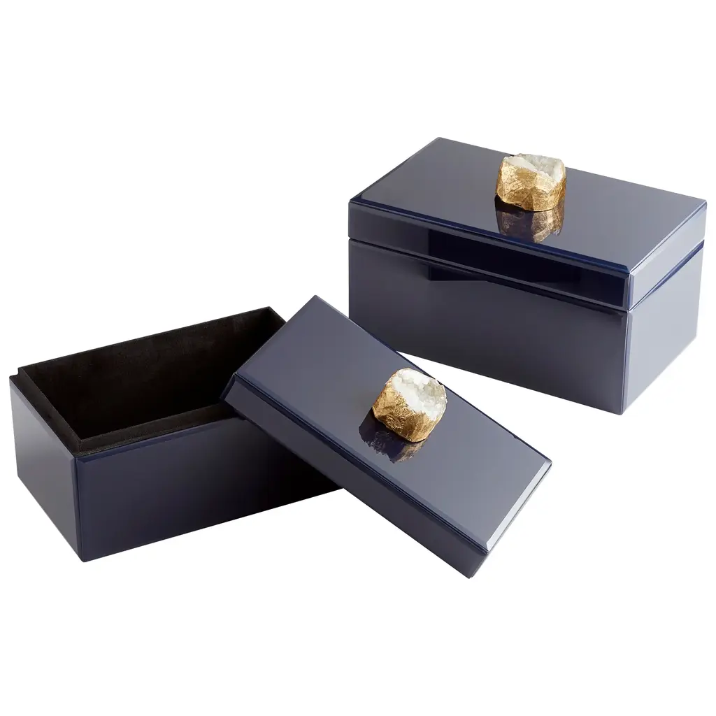 Modern-organic loveliness graces this classic glass container. A sleek, glossy blue finish adorns the exterior of this accent box, topped with a decorative gem stone accent serving as its handle. Store your jewelry, small electronics, trinkets, or any other personal items in the Solitaire container. This tabletop accessory is available in a small and large option for added versatility. Display on a bedroom dresser, powder room counter, or sitting room coffee table to add a natural elegance to your ensemble.