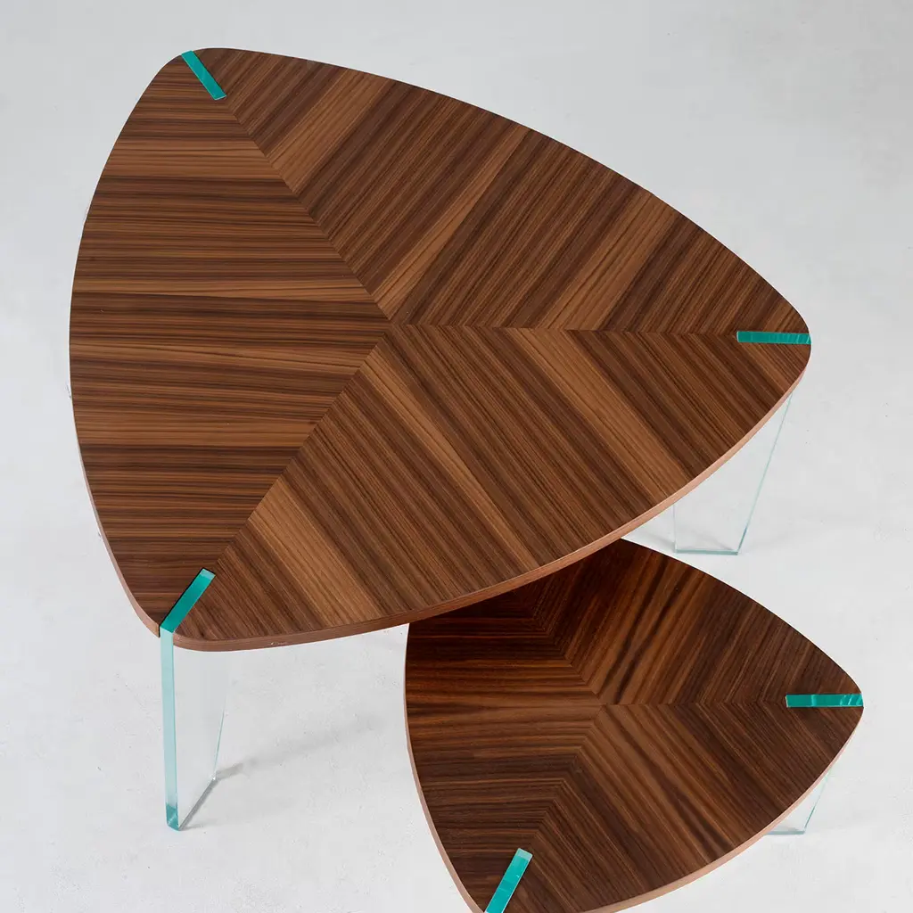 Illusion combines with the substance of traditional solid wood processing. The Sospeso solid wood coffee table is created by the expert hands and vision of our artisans. The linear and formal design of the wooden top worked with inlay technique rests on legs in extra-clear glass with visible joints to convey a floating effect.