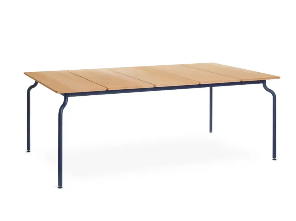 South is a square table. Materials: frame in steel tube, cataphoretically treated and painted in polyester powder. Top in teak. Adjustable and pivoting feet. Suitable for outdoor use.Accuracy is the essence of Konstantin Grcic’s work, and his new collection, South, designed for outdoors but ideal for indoors too, is no different. In cataphoresis-treated and powder-coated steel tube and wire, it is available in a range of colours: orange, bordeaux, light blue and night blue.Sinuous yet minimal, the collection consists of an armchair, a low armchair, a bench and a low bench, all with armrests. It also includes four tables (200x120 cm with top in teak slats, 200x90, 160x90 and 90x90 cm with top in steel sheet) and two coffee tables (120x120 cm with top in either teak slats or in lava stone enamelled with recycled coloured glass and 90x90 cm with top in steel sheet). The collection also features woven mattings for the seats, carpets, baskets and a plaid, all in the same outdoor-friendly fabric.As always, Konstantin Grcic combines formal rigour with a keen sense of design and architecture and demonstrates his passion for technology with careful research into materials and creative yet practical expertise.The South collection’s curved and inviting lines make explicit its direct and unconventional invitation to relax, resulting in dynamic comfort. To make the seats even more comfortable, a full (seat and backrest) woven matting can be secured to the shell with Velcro, offering a chic and practical alternative to classic cushions.