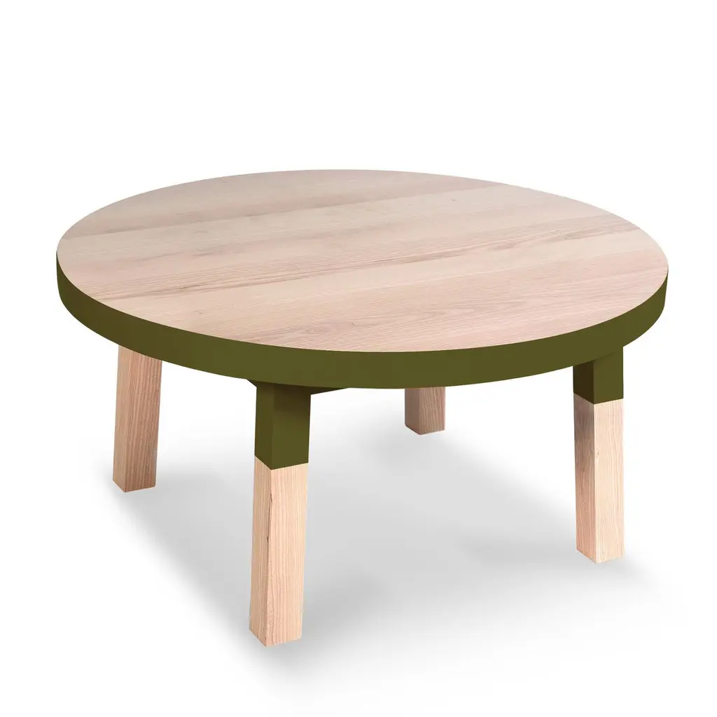 Round coffee table in solid ash wood.This rare "Short Pants" Finish, the colour is only from the Belt to the Knees of the table, is made of whitened natural ash stain and a lovely deep green colour. This piece of furniture is part of the ÉGÉE collection, designed by the Parisian designer Eric Gizard who adopts the refined codes of Scandinavian design combining natural materials, elegance and sobriety of lines by adding very beautiful muted and "trendy" colors.The color on the pictures is a dark green. 10 other colors are available.The manufacture and finishes are of very high quality, carried out in French craft workshops.100% solid ash wood coming from French sustainably managed forests.Mon Petit Meuble Français provides exclusively 100% Made in France furniture.