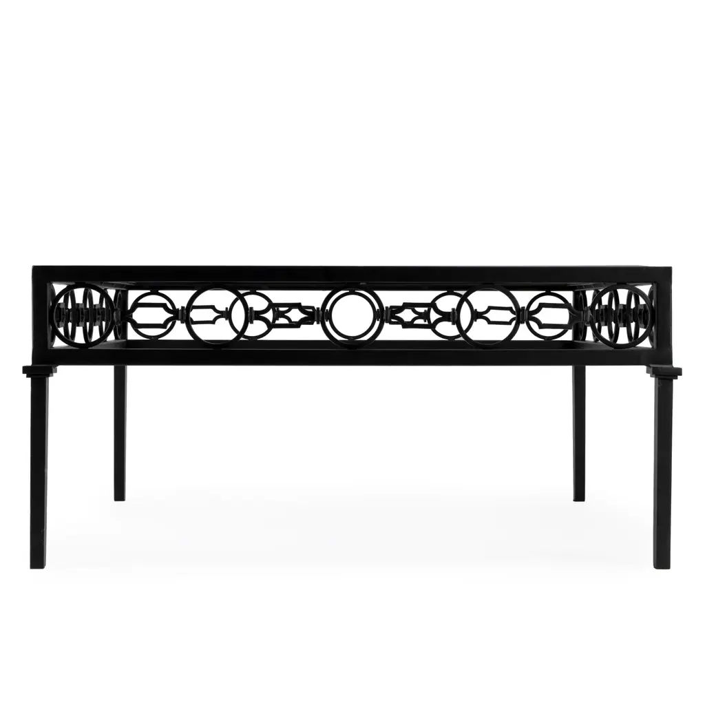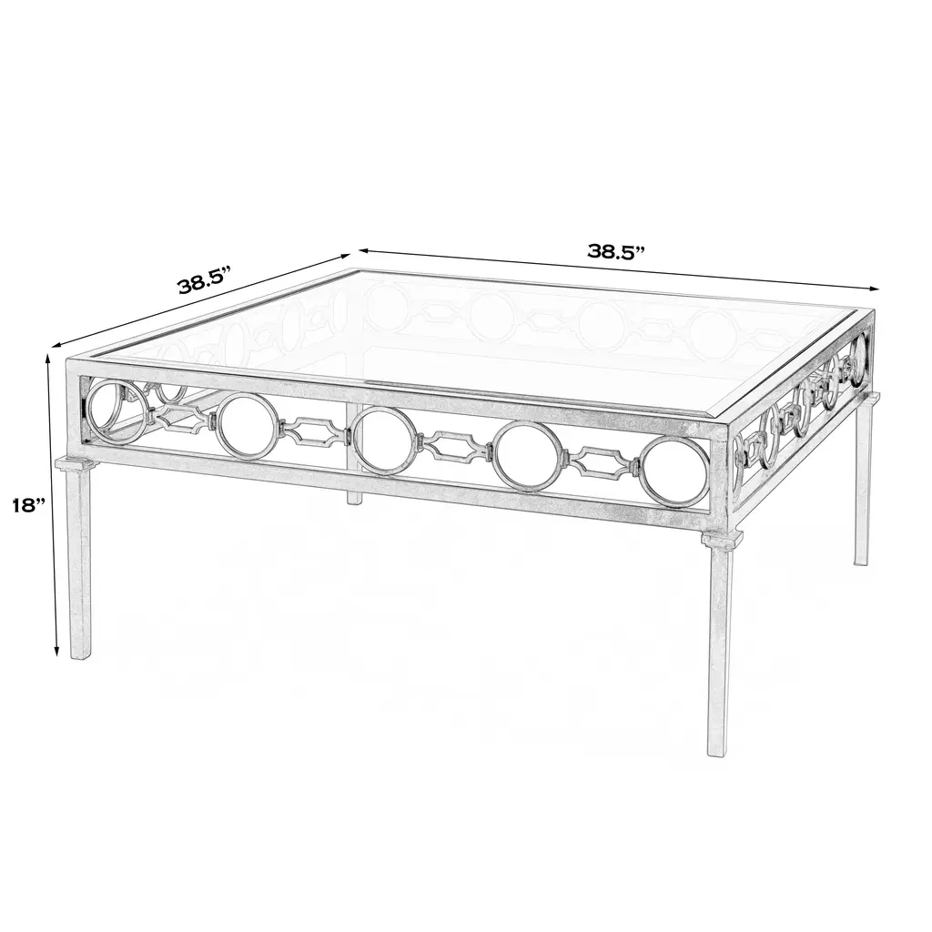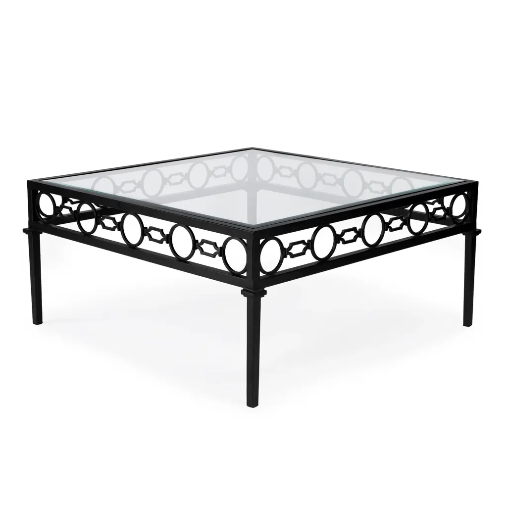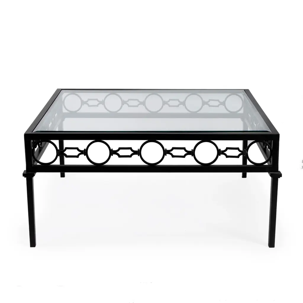 It's 5 o'clock somewhere. Grab a drink and cozy up around the Southport coffee table. Made of a black iron frame and clear glass top, this coffee table is substantial in size measuring 38.5"W x 38.5D x18"H. It's forged geometric pattern. Durably Constructed With: Iron, Clear Glass Product Construction Features: No Natural Variation,No Distressing,Upholstered Product Assembled Measurement & Weight: 18.0" H x 38.5" W x 38.5" D -- 104.0 lbs. 66 lbs. Suggested weight capacity Item Arrives: Assembled This product has been specifically made for you by master craftsmen using age old techniques and tools. The slight aberrations and imperfections as visible are sign of the product being handcrafted. Made in India. Photo may slightly differ from actual item in terms of color/finish due to the lighting during photo shoot or the monitor's display.