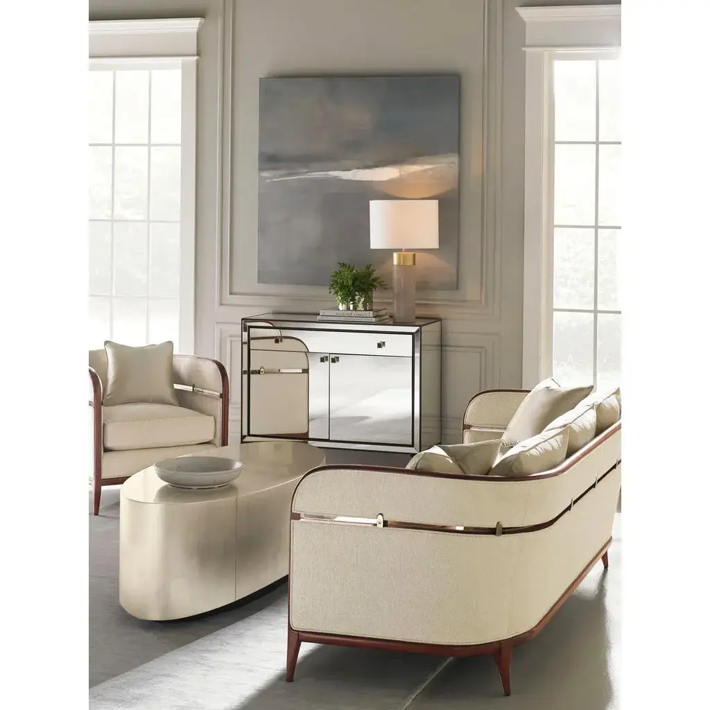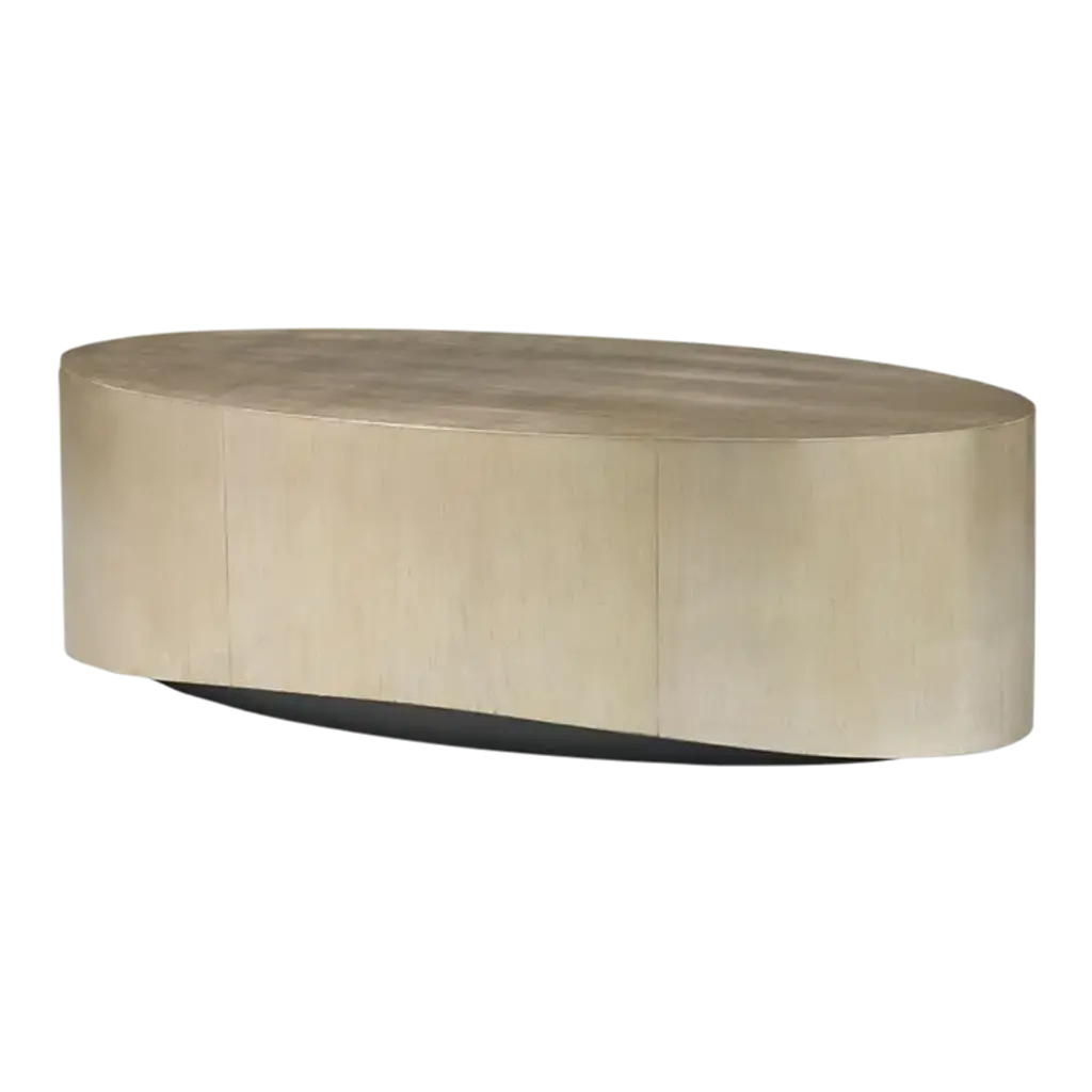 Not only does the oval shape encourage easy movement and flow around a seating area, this clever cocktail table adds such sparkle to a room. Finished in a popular silver and gold leaf finish, and complemented by a rich Charcoal-finished base. A perfect transitional piece – it works in both traditional or contemporary settings. Dimensions: 56.75" W x 26" D x 18.25" H