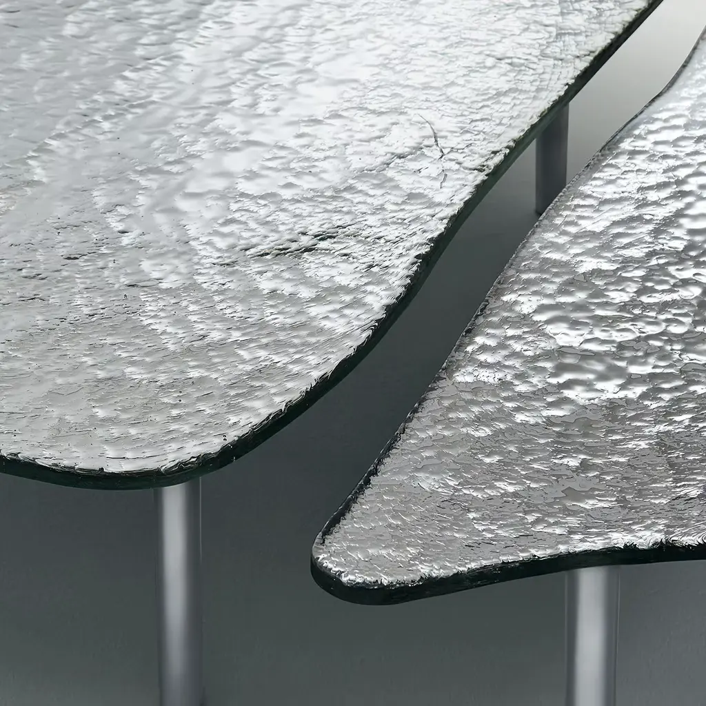 Designed by Massimiliano Locatelli - CLS Architetti, this superb glass coffee table is composed of two pieces made of poured silvered glass tops with an irregular silhouette supported by elegant thin legs in blown glass. The Specchio di Venere collection includes a wide choice of tops in several shapes made of extra-light, tempered glass in different finishes available separately to create personalized compositions. This version includes two tables, both 38 cm-high, that measure (in cm) L 124 x W 149 and L 132 x W 67. Please contact the Concierge for more details.