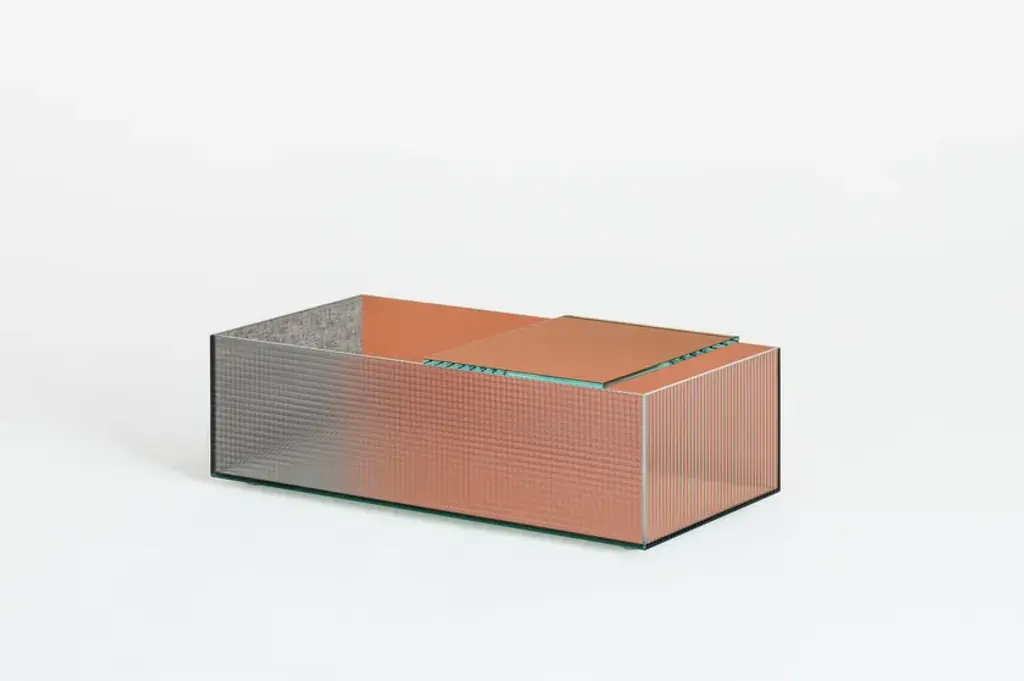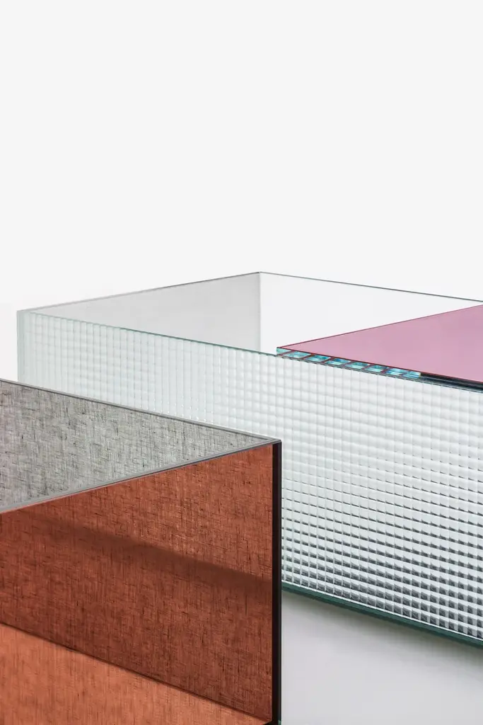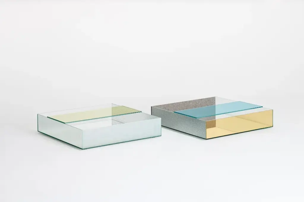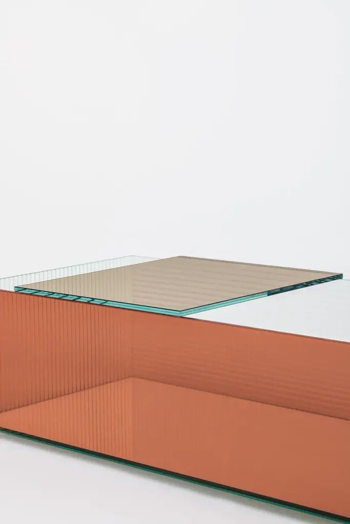Sophisticated composite low table in shape of a tub, made by bonding 45 ° laminated glass slabs, different in quality and finish.The bottom is mirrored, whilst the four sides are made of the following materials: Flutes printed glass, Quadretti printed glass, glass with Masaccio or Botticelli fabric (by choice), transparent colored glass (choice of 12 colors), extralight transparent glass.The coffee table is then completed with a support surface, that can be positioned as desired, in transparent extralight or transparent colored glass (choice of 12 colors).
