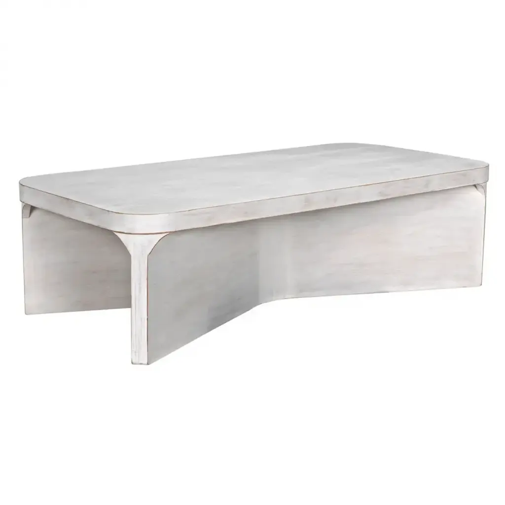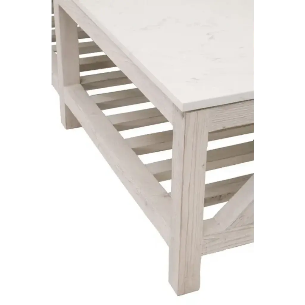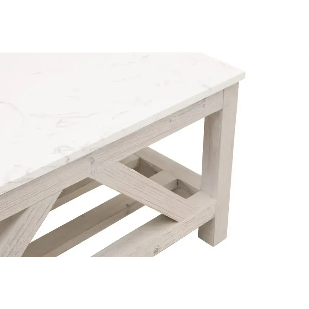 This stunning quartz-topped coffee table is an eye-catching transitional piece with a touch of farmhouse style. It is constructed with a solid quartz top designed to resemble white and gray marble and a solid wood base with a white-wash finish. The trestle base with gray wood grain adds rustic charm to this modern-looking table. Its light color palette and simple design will pair nicely with many different colors and transitional or farmhouse furniture pieces.