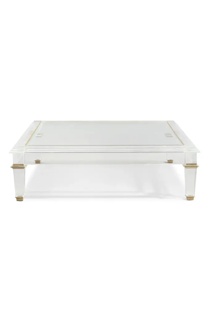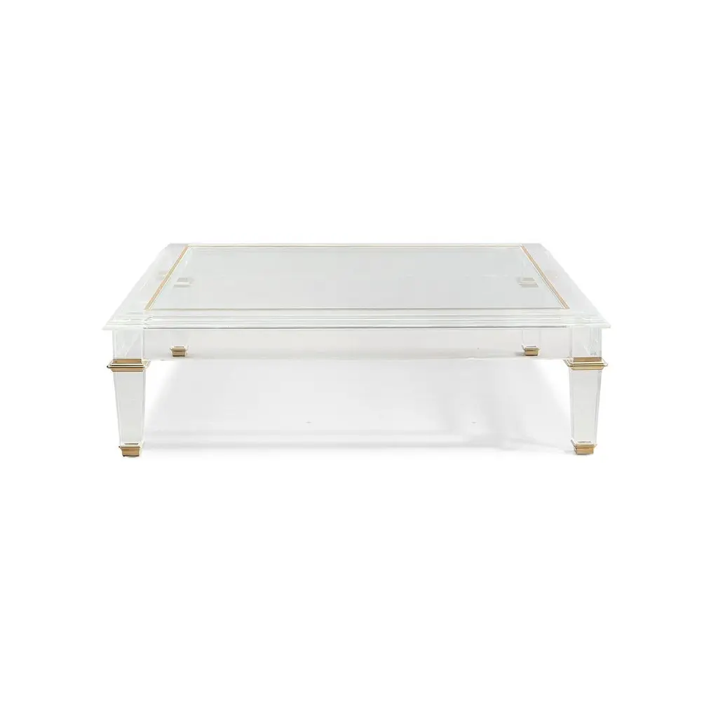 French Neo Classic 18th-century inspired design with clean and classic lines, this cocktail table comes to life in crisp acrylic.The table’s surface features a glass top and the tapered acrylic legs are accentuated with polished brass collars and ferrules.Dimensions: 55" W x 55" D x 16" H