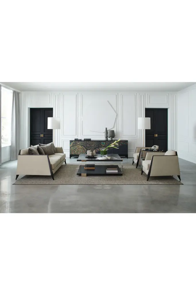 Instantly elevating, this square cocktail table brings a beautiful balance of linear forms and light. Its Tuxedo Black tabletop and shelf appear to float within clear acrylic posts, for a look that stirs interest, without imposing. Whisper of Gold metal accents create shimmer and moments for reflection. Centers a room, and offers ample space to style books and decor, above and beneath.