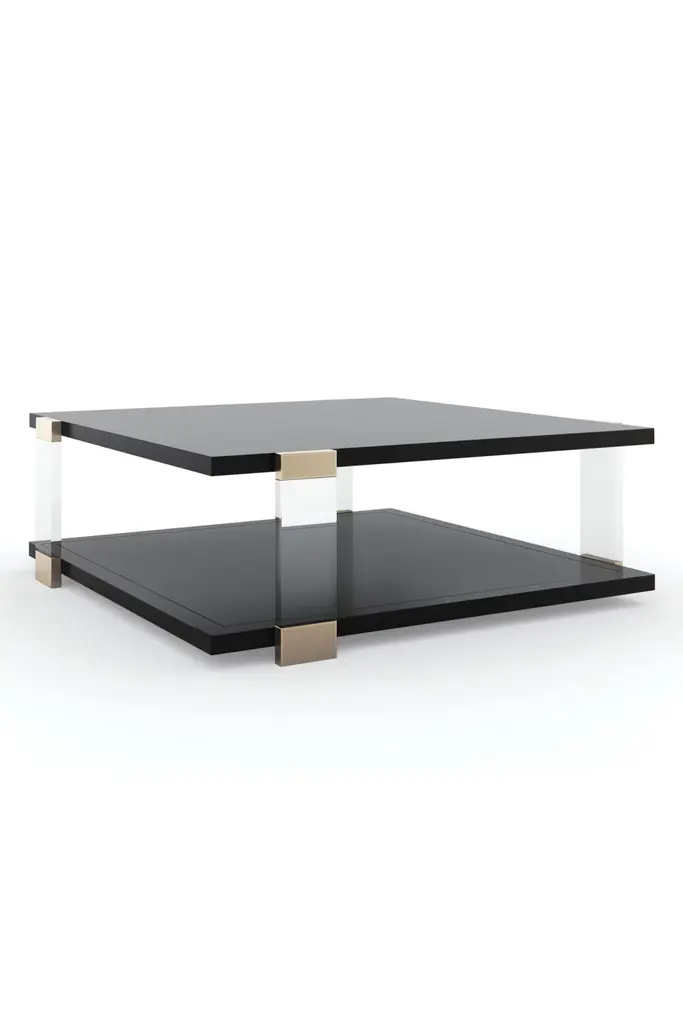 Instantly elevating, this square cocktail table brings a beautiful balance of linear forms and light. Its Tuxedo Black tabletop and shelf appear to float within clear acrylic posts, for a look that stirs interest, without imposing. Whisper of Gold metal accents create shimmer and moments for reflection. Centers a room, and offers ample space to style books and decor, above and beneath.