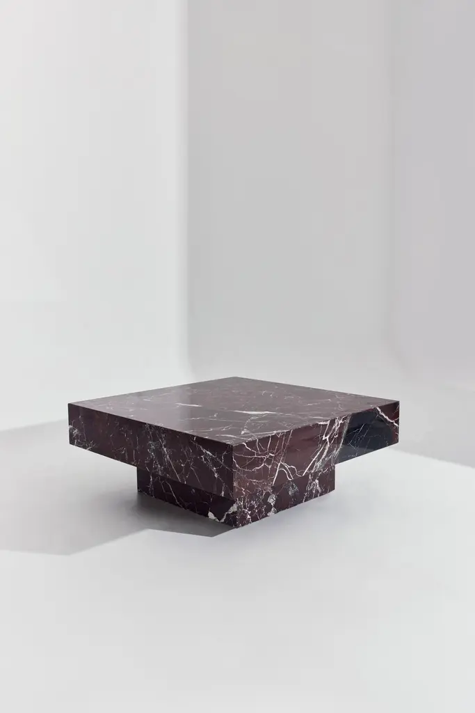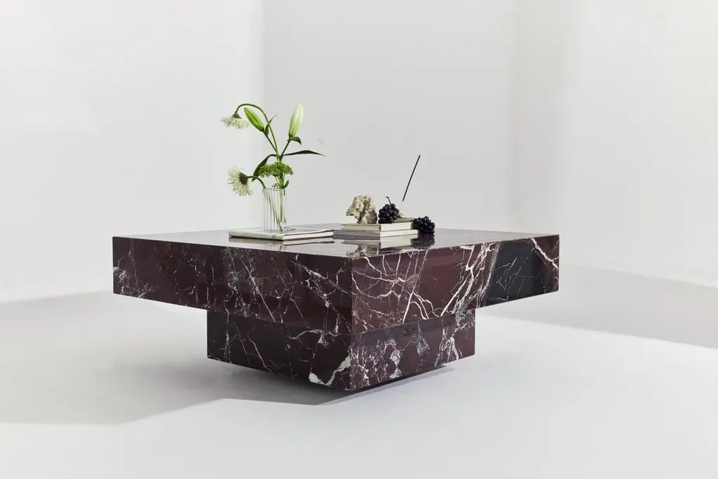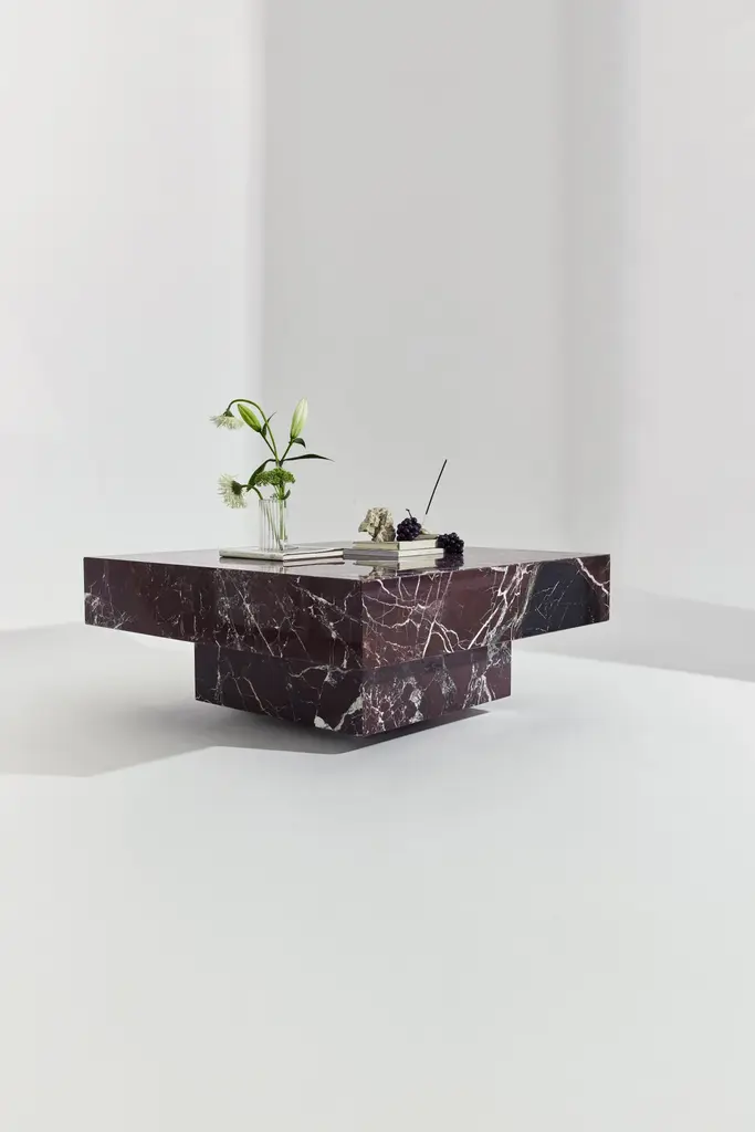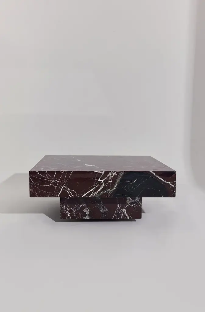 Square Block White Veining And Dark Red Marble Coffee Table By Raffinato