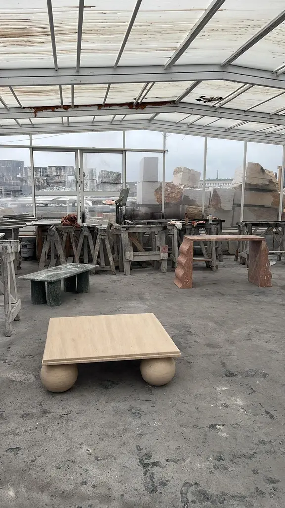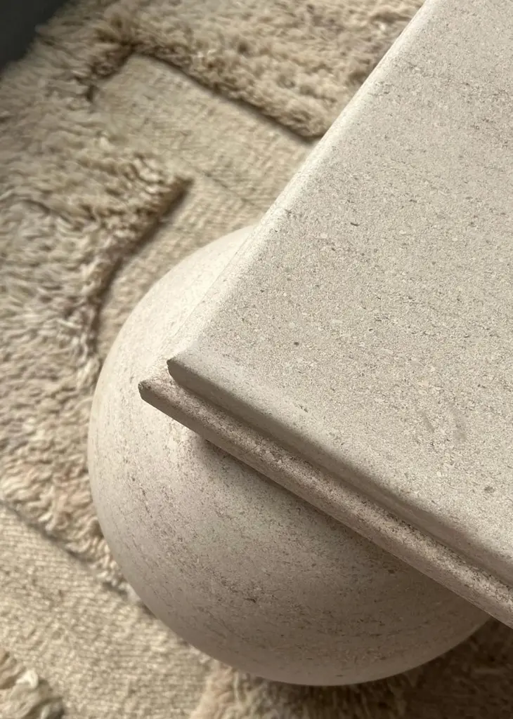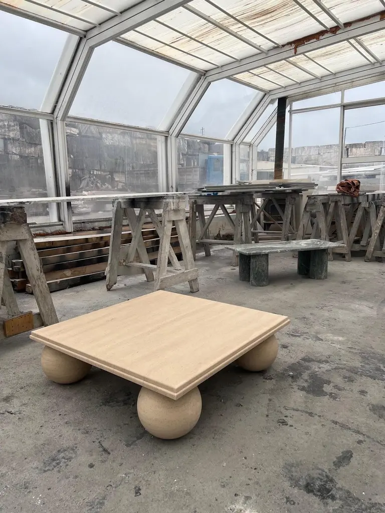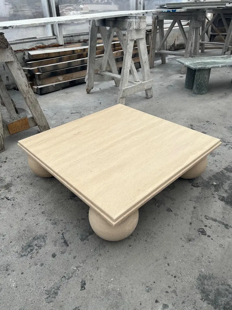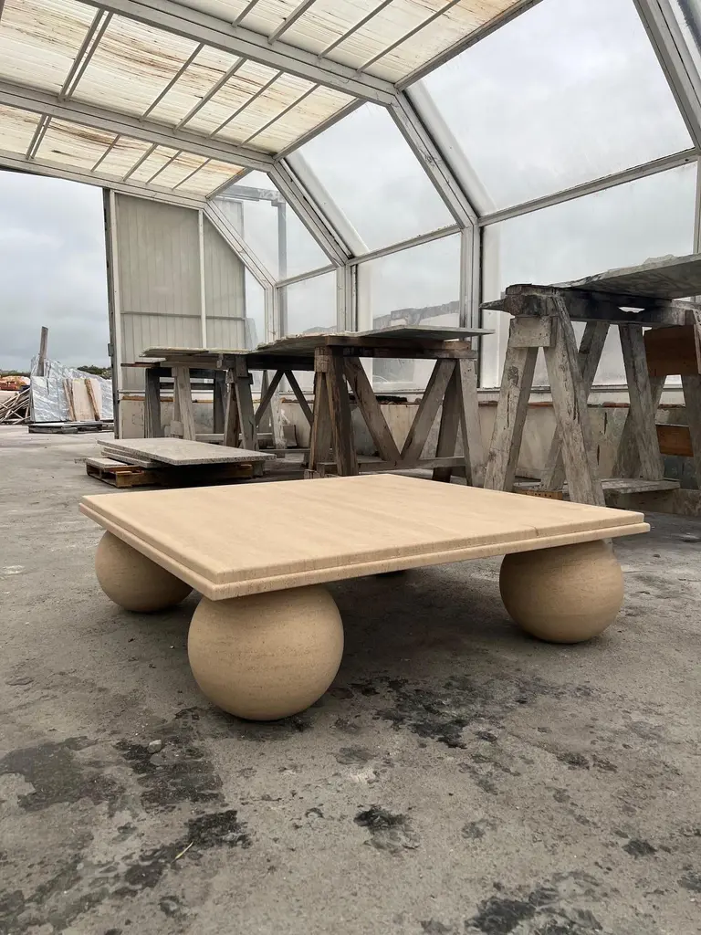 Square stone coffee table with ball sphere base in cream Portuguese TravertineA sculptural four-sphered base coffee table with a double-layered lipped top. It is made from solid stone with a honed finish that enhances the richness of the beautiful natural limestone. Carved from solid stone, the sculptural ball feet and subtle edging details of the table top resemble a postmodern coffee table with a warm and elegant feeling. The honed finish is durable and enhances the richness of the beautiful cream stone. The craftsmanship here is unique, working with blocks of stone (vs. slabs), allowing these solid and sculptural forms to come to life. This item is also available made-to-order in custom dimensions or various natural stones. The legball’s can be placed freely under the top and arranged as you desire for ultimate functional use. The top and legs are packed separately for ease of transport and installation.Custom ideas: also available with a round top. See other listings for additional stones and shapes.