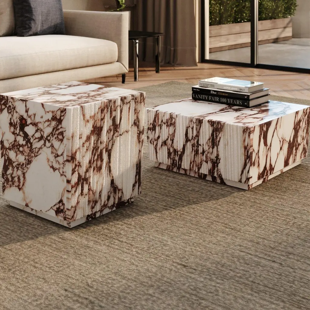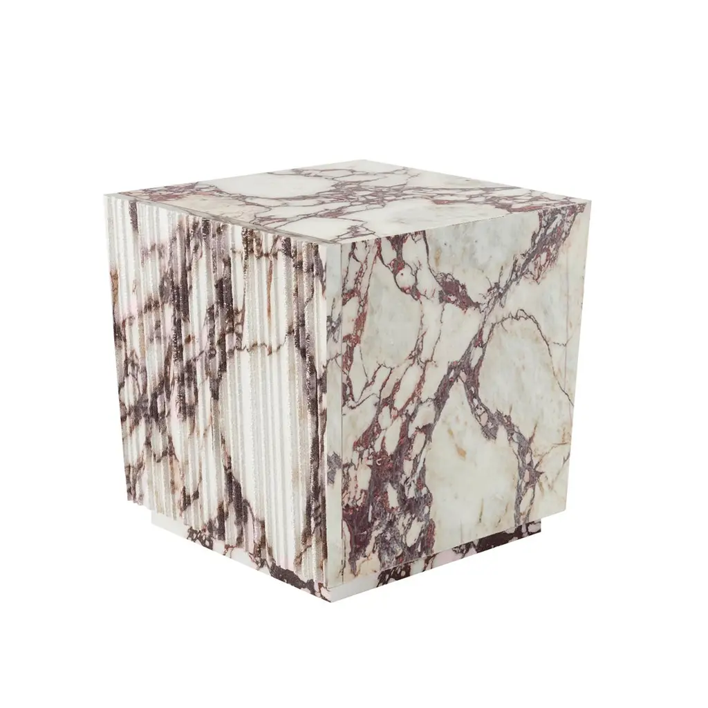 Coffee table in Calacata Viola marbleVersatile and naturally beautiful, this table was inspired by the Japanese stone gardens and the calm they can provide. Their texture refers to the wave effect of seawater. Still, bring to your home, minimalist aesthetic with detail and function. They can be used in combination or separately. Different sizes and textures generate the possibility to create a space for unique and calm use and contemplation.Calacatta ViolaMeasures: 56 x 56 x 27 cm 57 kgAvailable as a side table and a dining table as well please see last pictures.