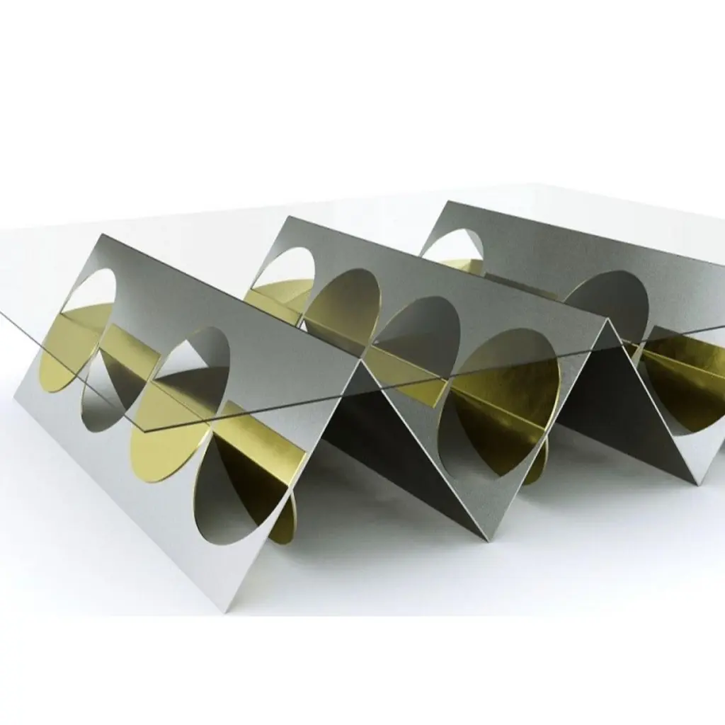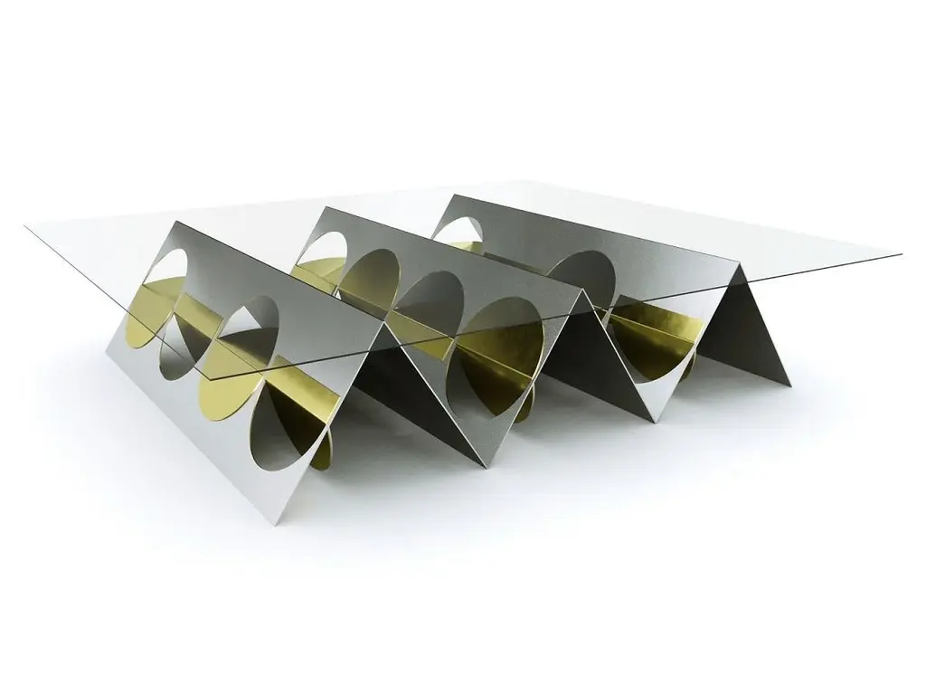 Stainless steel inverted pyramid coffee table by Ana Volante StudioThe Moon CollectionDimensions: L 160 x W 50 x H 42 cmMaterials: Stainless steel, brass, glass on topAna Volante, founder of Ana Volante Studio, is a Venezuelan designer specialized in interior environments, furniture design and art proposals.Ana grew up admiring her grandfather’s painting and architectural career which irradiated in her a profound passion for design. She completed her studies at the Instituto de Diseño de Caracas and then moved to Milano to upscale her knowledge. In 2005 she returned to her native country to work for several architecture firms until presenting her own Studio.Ana’s creative process emphasis on client communication and seeks for an emotional connection with the space. Her model encourages to go beyond limits and explore new concepts to pursue an exceptional result.Ana has completed residential and commercial projects in Latin America, Europe and the United States, exposing her personal firm and Mezzcla (the interior design studio and concept store owned with 2 venezuelan partners).THE MOON COLLECTION, her first furniture collection is inspired by the brutalism movement, evoking raw, geometric and clean forms. Her work in wood and metalsharkens back to the 1960s and 1970s with her focus on the circle, in all of its views, angles and sections becomes the vocabulary to express form and function.