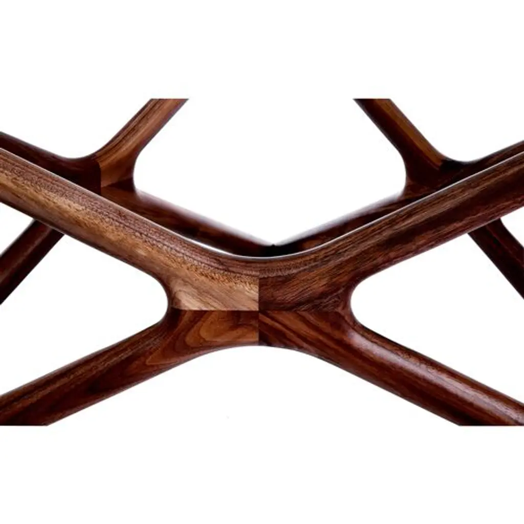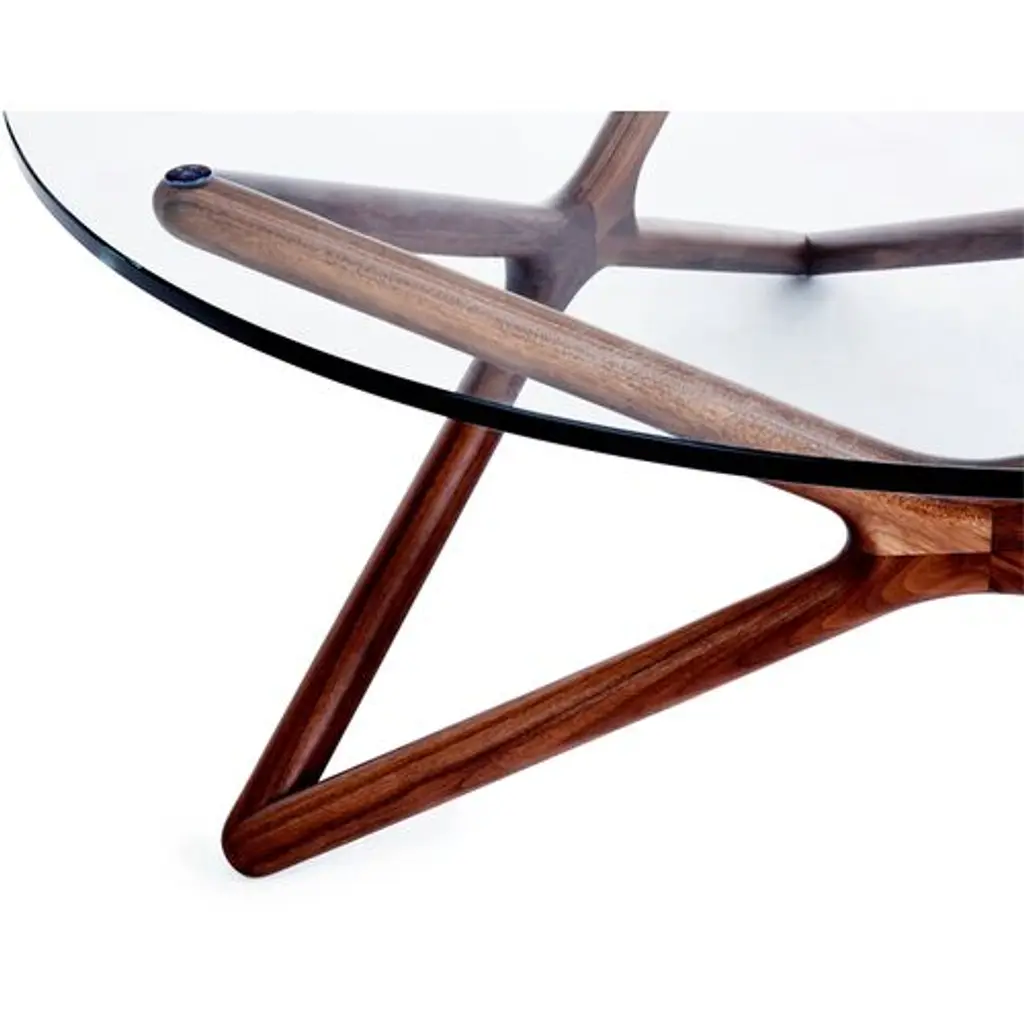 The transparent half-inch-thick glass top ensures that the wooden star that makes up this coffee table's base is visible from every angle.