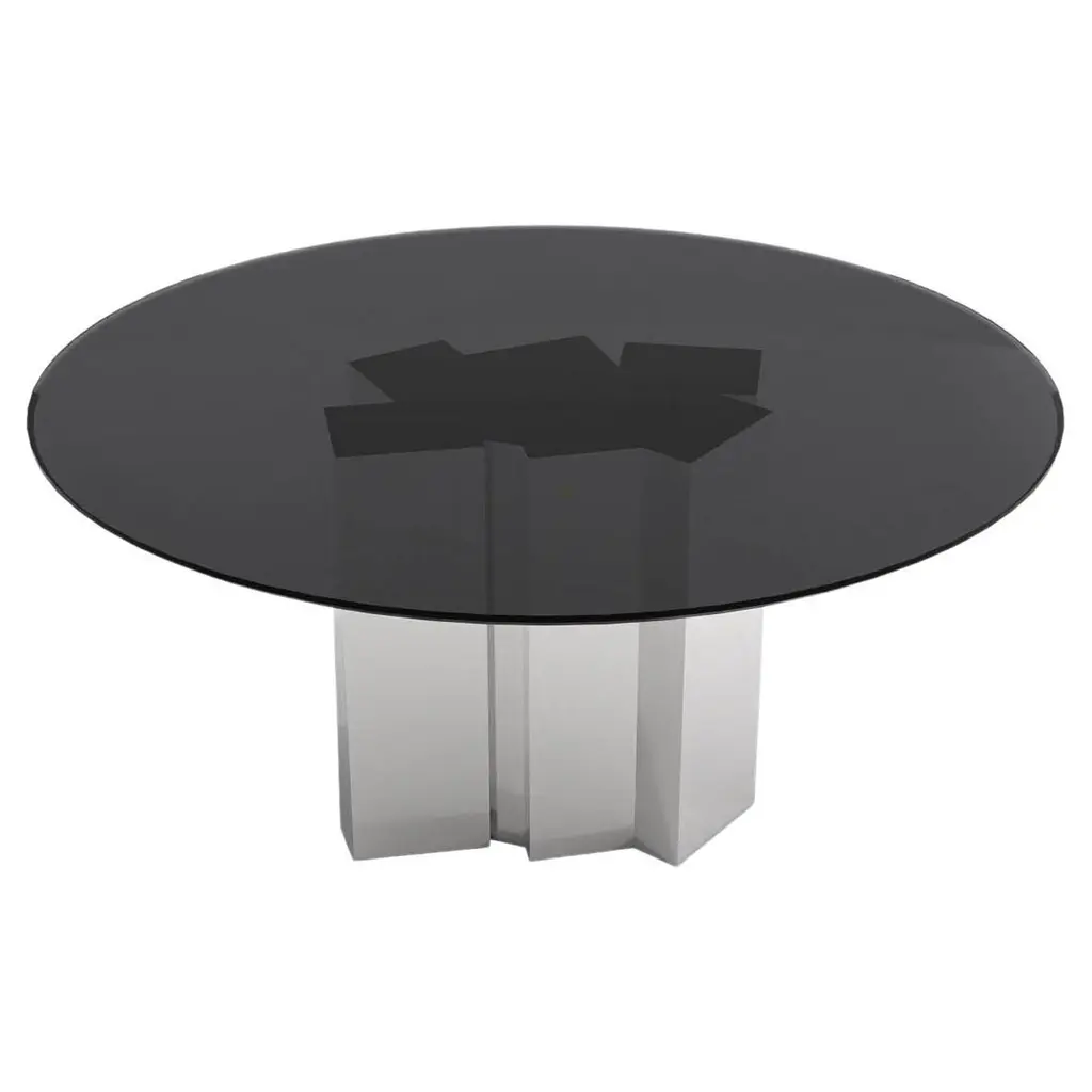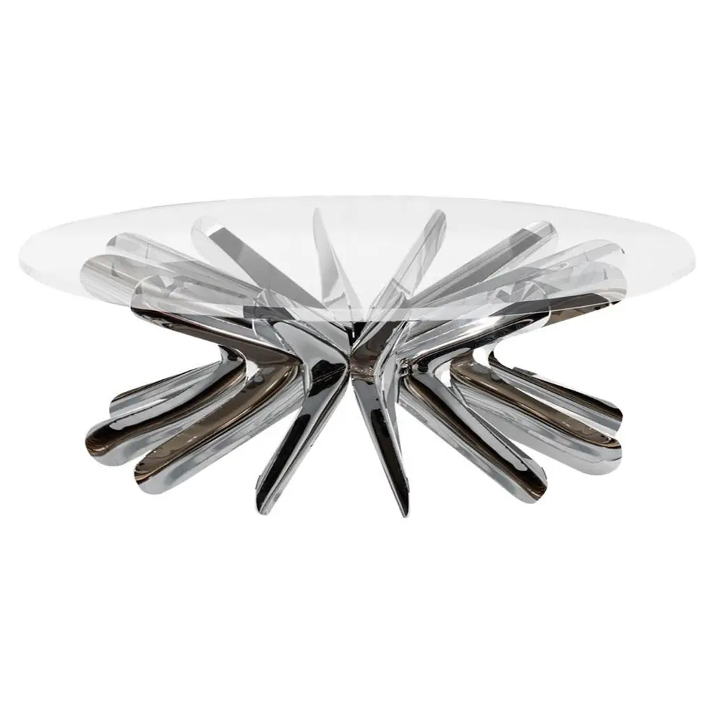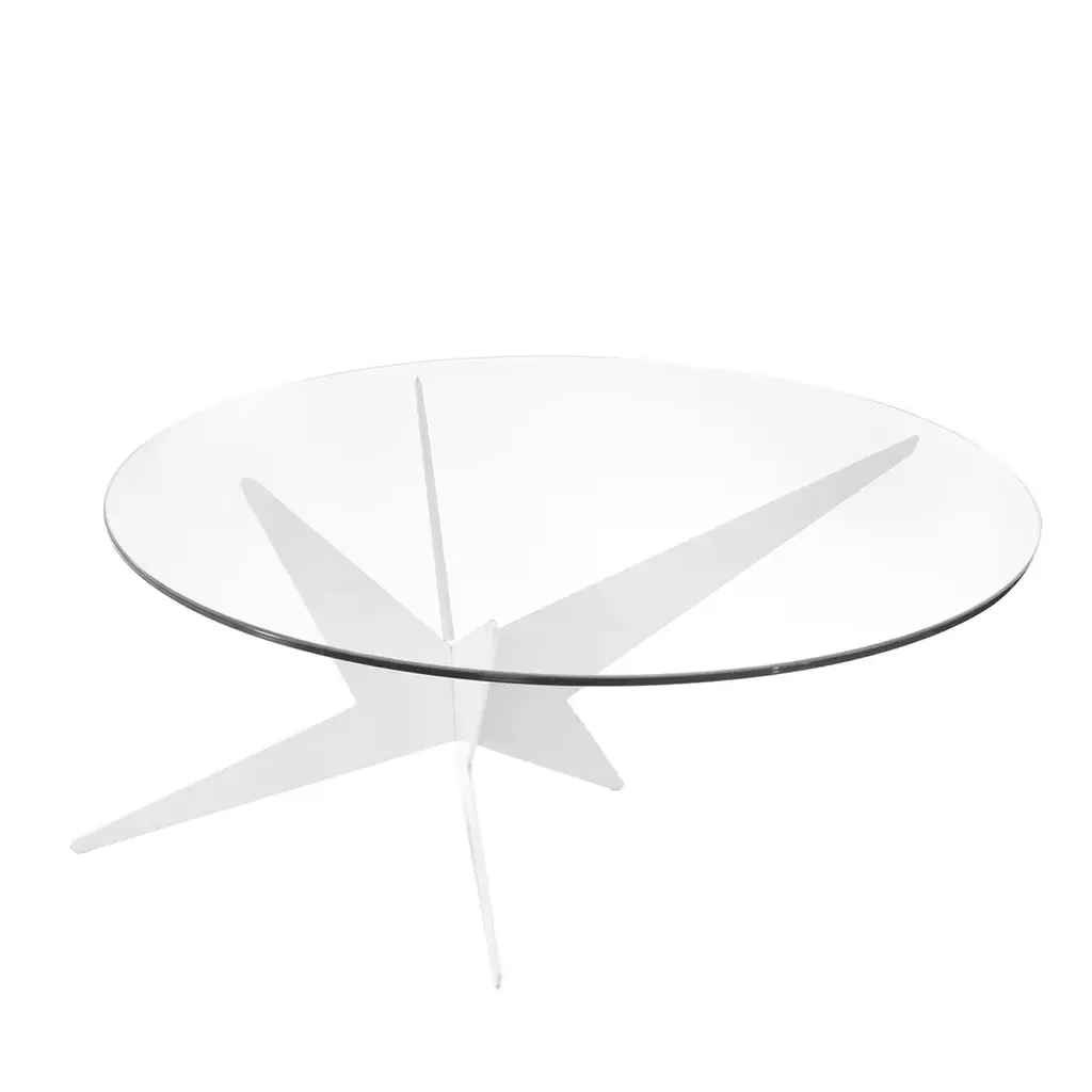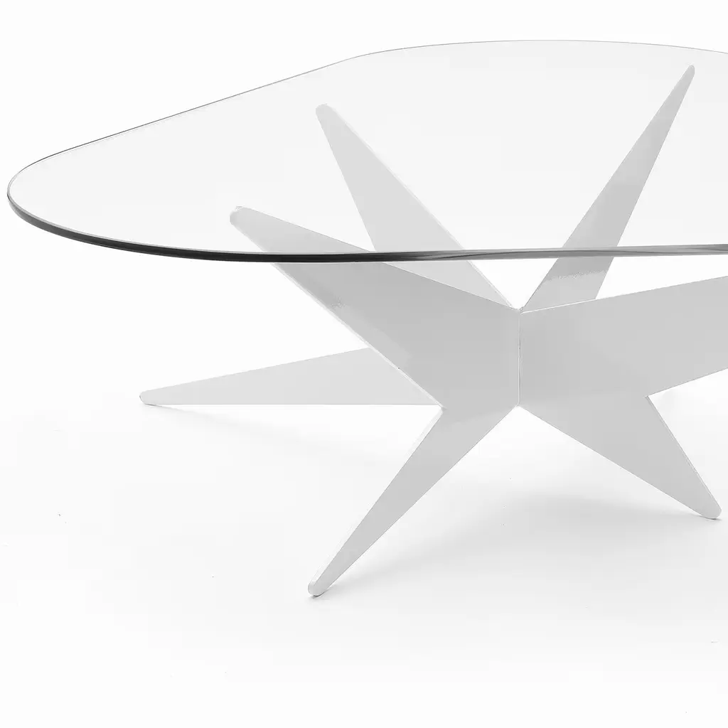 Inspired by the timeless elegance of the stars, this coffee table designed by Antonio Pio Saracino features a satin-finished aluminum base holding a triangular glass tabletop. The three-dimensional, starburst shape boasts eight rays radiating from the center in a stunning visual effect fully revealed through the glass top.