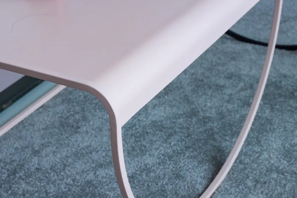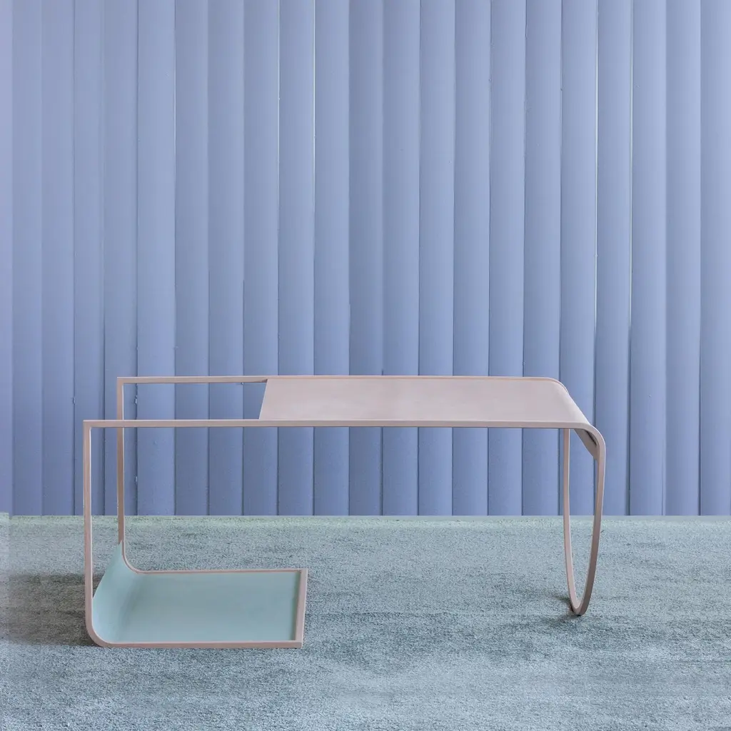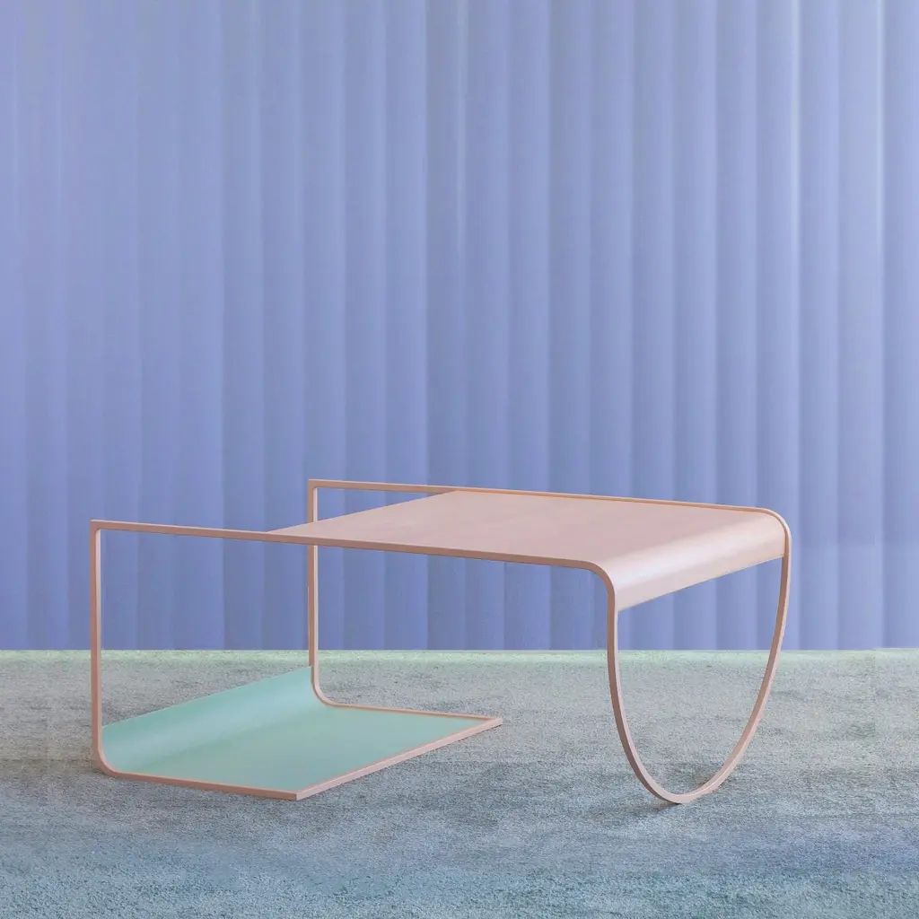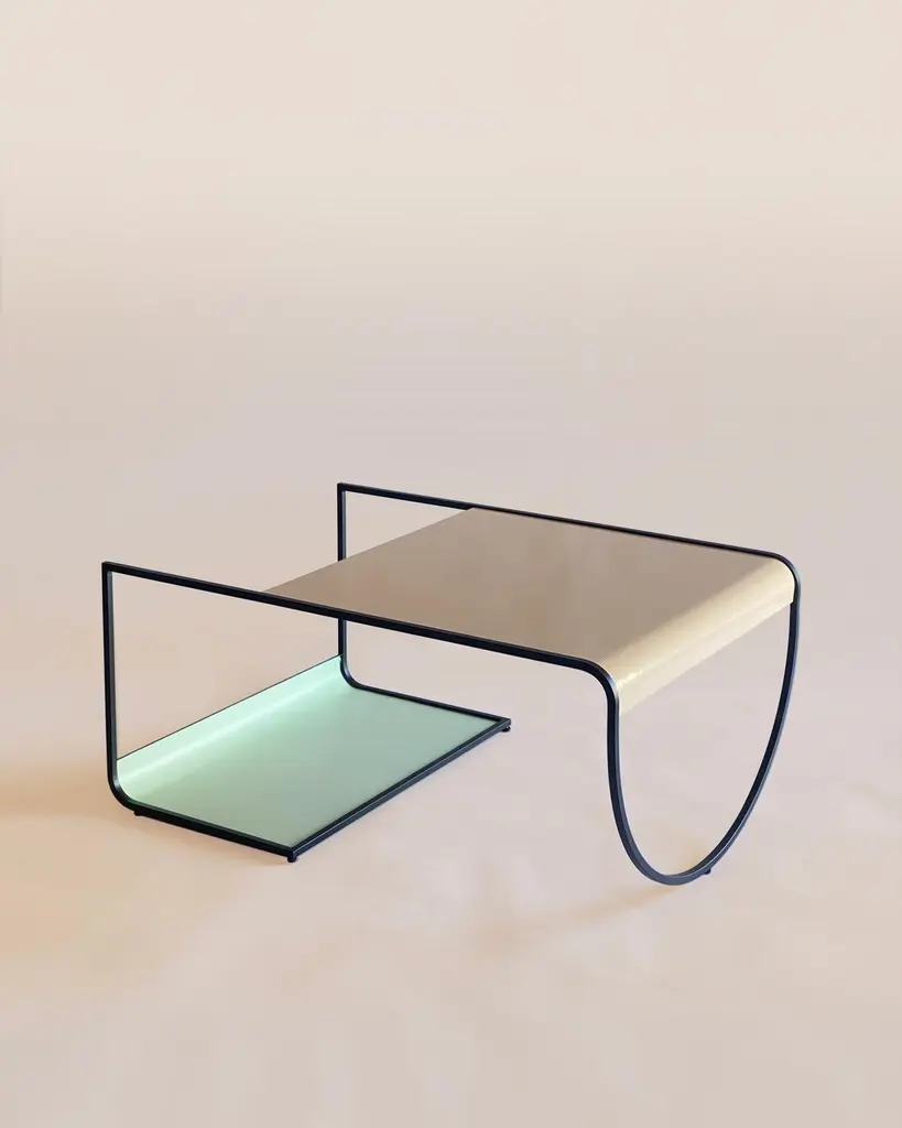 SW coffee table by Soft-geometryMaterials: SteelDimensions: 36 x 24.5 x 17” HSimple, playful geometries form the light and fluid sw geometric coffee table in powder coated steel. Perched on an arched-belly base on one side and a rolled rack for storage on the other, the table offers moments of surprise in its subtle reveals of form and color. The geometric coffee table effortlessly brings back a Bauhaus style play of elements that makes the most of its minimal form. Soft-geometry is an Indian design studio creating collectible furniture and home objects around a central theme of softness. Inspired by the rich, diverse object culture and craft-traditions of India, their objects are predominantly hand-made, bridging traditional and modern ways of making and seeing. Based in Kochi, India. "Softness is a degree, almost anything can be plotted along a soft-hard axis. There are soft materials - soft velvet, fur, felt, hair, wool and any others that are soft to touch. There are visual associations - pastel colors, billowy clouds, things without edges and the soft light of dawn or dusk. There are soft sounds - whispers, melodies, the rustle of leaves; and soft scents - the smell of rain, wet ground or faint perfume. More interestingly still, softness can be abstract - it is malleability, a willingness to learn or change, fluidity, humility, empathy, slowness, childlike innocence or imperfection."