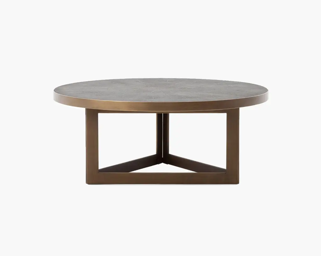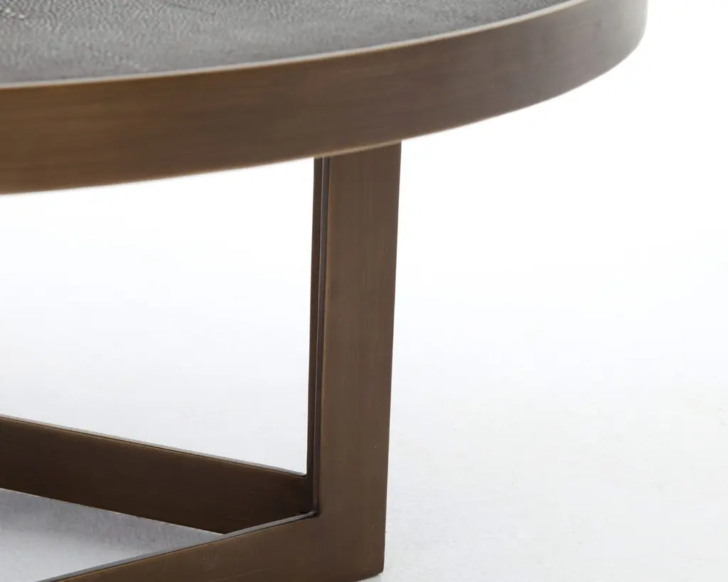 Mid-century shaping takes on modern intrigue in faux shagreen. The round top floats over a triangular iron base with an antique brass finish. Dimensions: 38" W x 38" D x 16" H Shipping box: 42" W x 42" D x 8.5" H, 112.5lbs. Receives White Glove delivery.