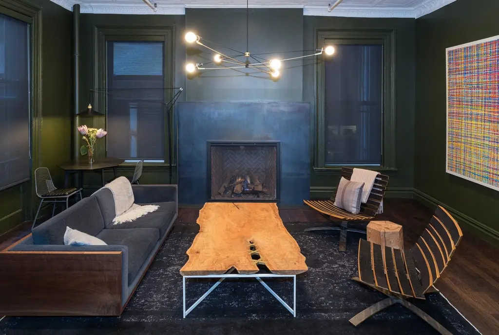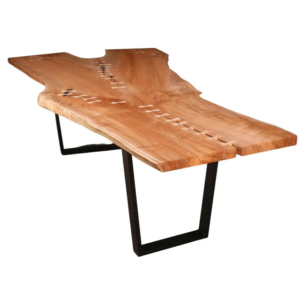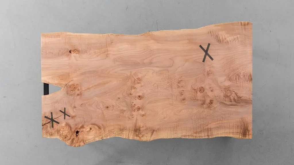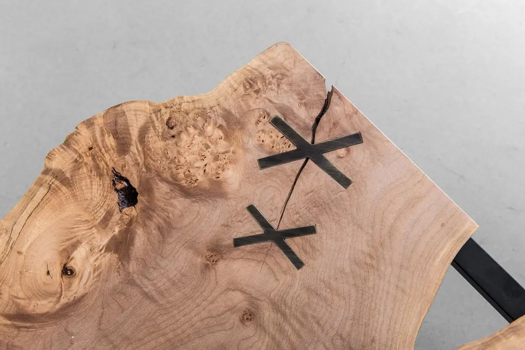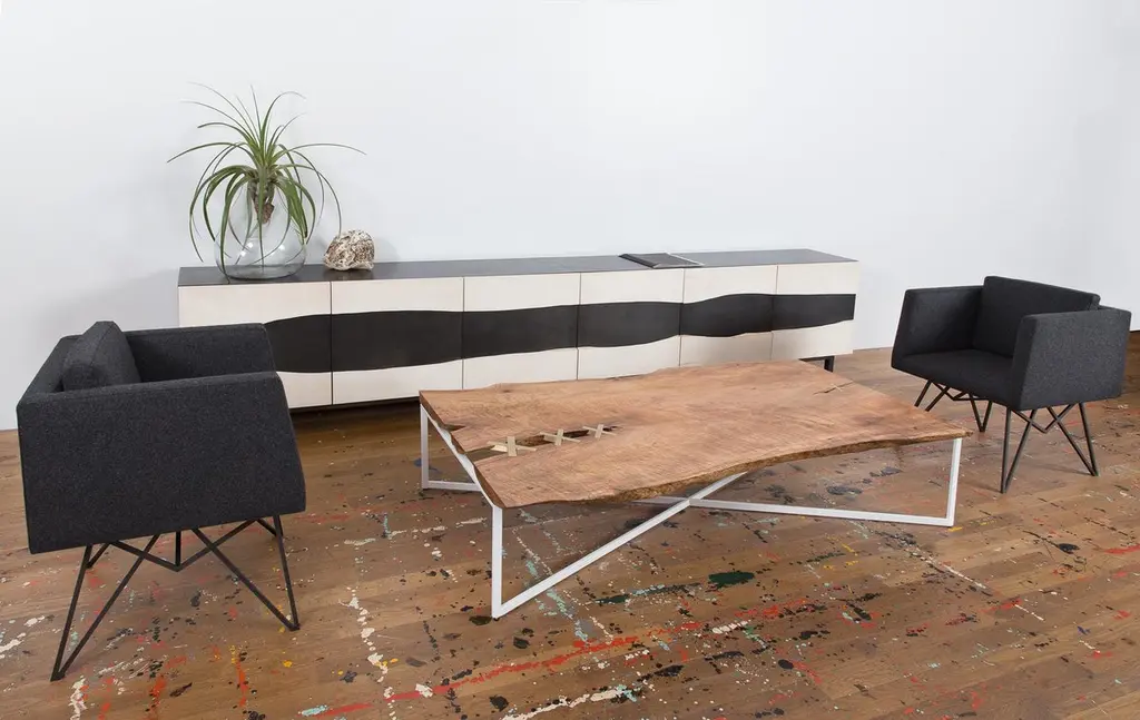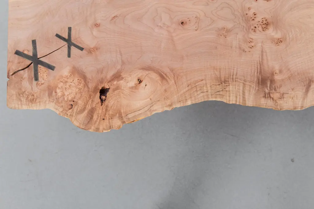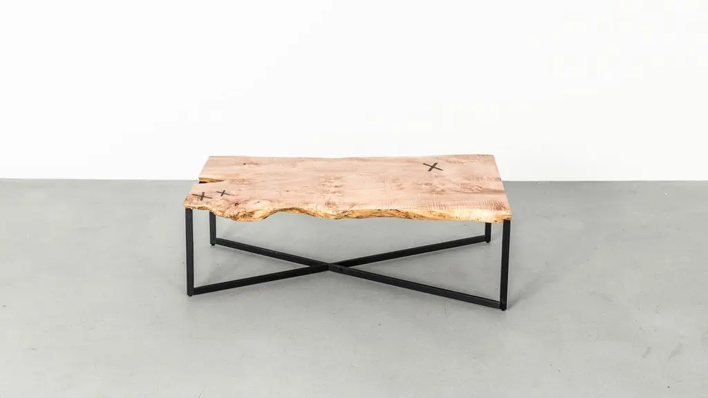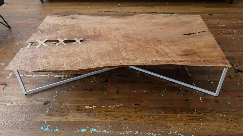 The Stitch coffee table showcases the rich grain of gorgeous Big Leaf Maple slab. Each coffee table embraces walnut's naturally occurring checks, which are reinforced with X-shaped brass stitches. The inset stitches beautifully contrast the tones of the maple, highlighting the natural beauty of the wood and the functionality of the stitches. The slab is elegantly braced by an X-frame in powder coated steel for a minimal yet stunning appeal.Our slabs are locally milled, dried, and come from sustainably harvested trees. Grain, color and natural characteristics vary from slab to slab, making each Stitch coffee table a unique work of art. Listing pricing reflects table dimensions of 40"W x 70"L x 15"H.Tables are one of a kind, and made to order in our PA studio. Customizations are available in dimension, slab, metal base finish/color, brass stitch finish, and more. Inquire for details.