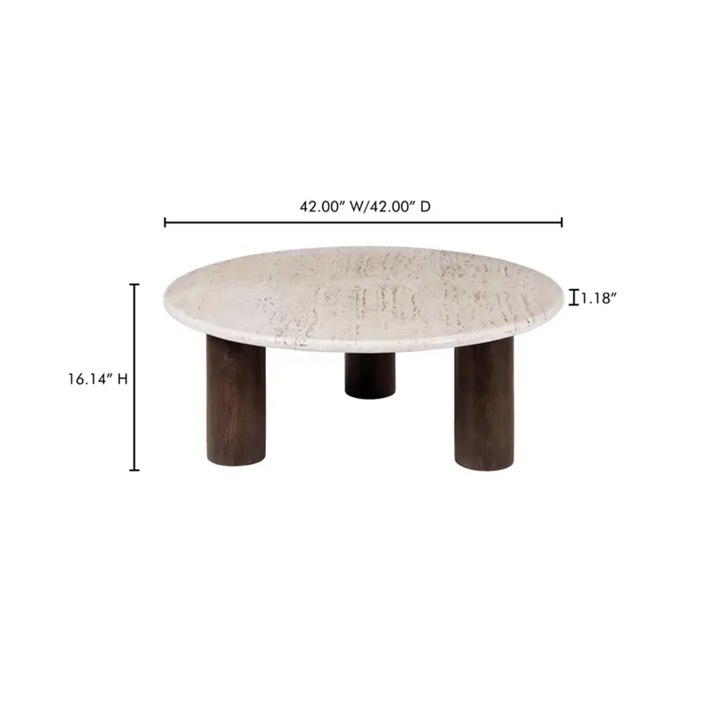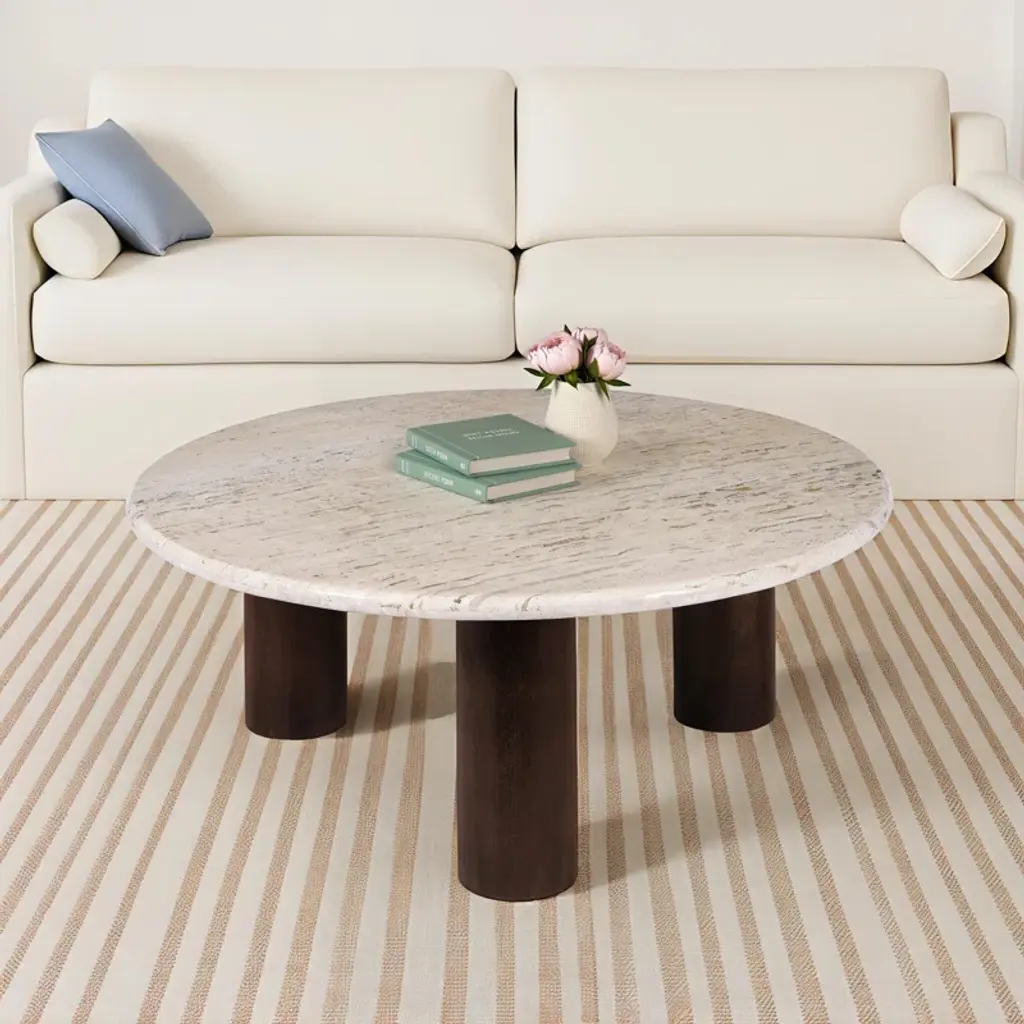 The Feuily coffee table encapsulates design and proportion, crafted with a generous 30mm-thick Turkish travertine tabletop and a mango wood base stained in a rich, dark hue. The rounded tabletop edge gives the travertine a soft feeling, while the darkly stained mango wood base adds warmth to the hardened material. Note that no two tables are alike, showcasing their own color and veining variation.