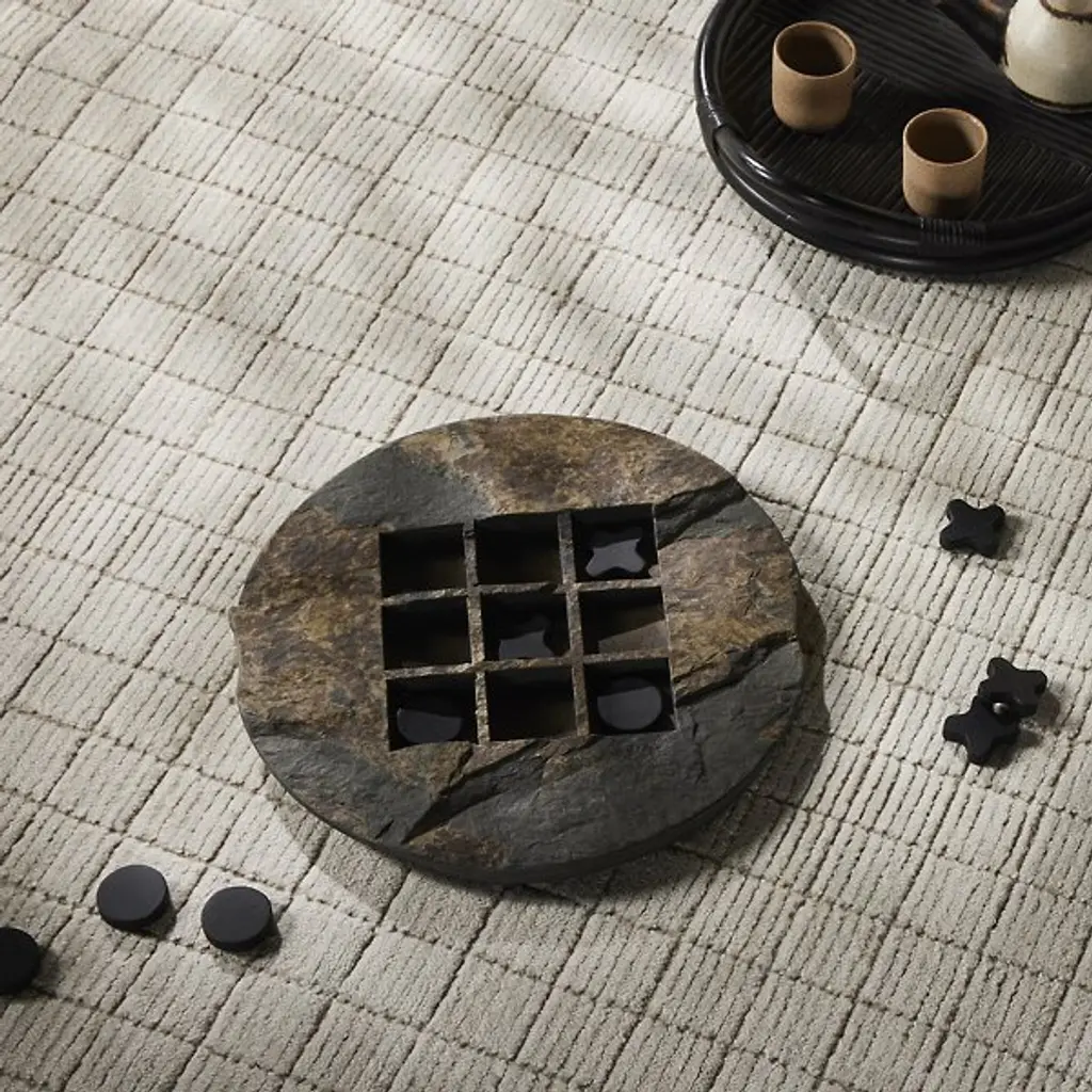 The Stone Tic Tac Toe from Four Hands brings a natural touch to an age-old game. Each board is unique, made from Laja flagstone, featuring individual variations in texture and patterning. Reclaimed wood playing pieces add warmth, while a cork base keeps the board in place during play. This set is decorative and functional, perfect for coffee tables, game rooms, or as a tasteful, tactile conversation starter. Complete with ten playing pieces; it matches rustic charm with contemporary simplicity for casual entertainment with an organic feel.