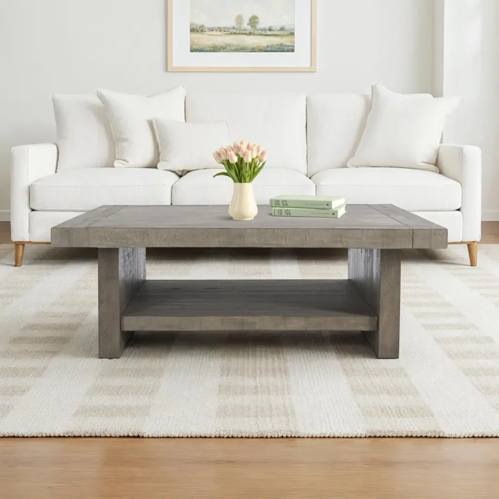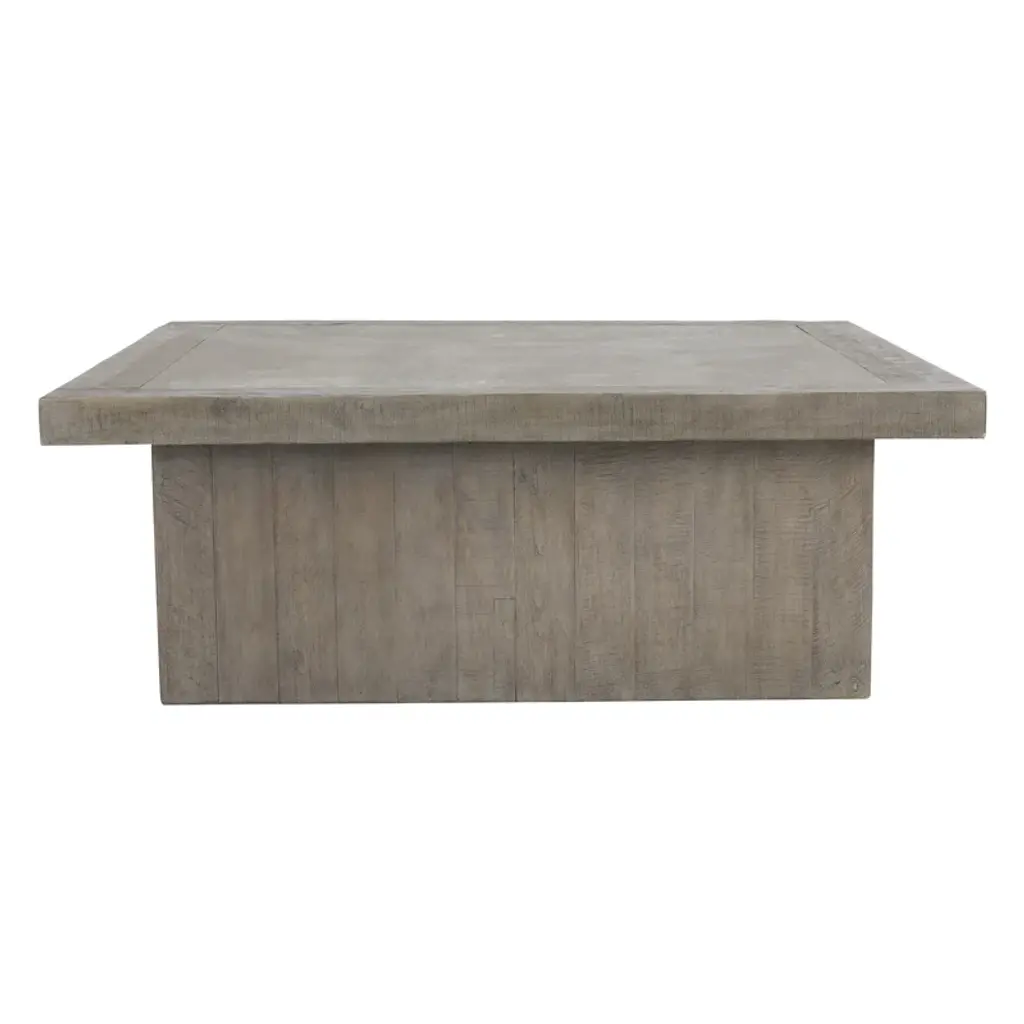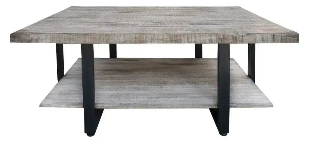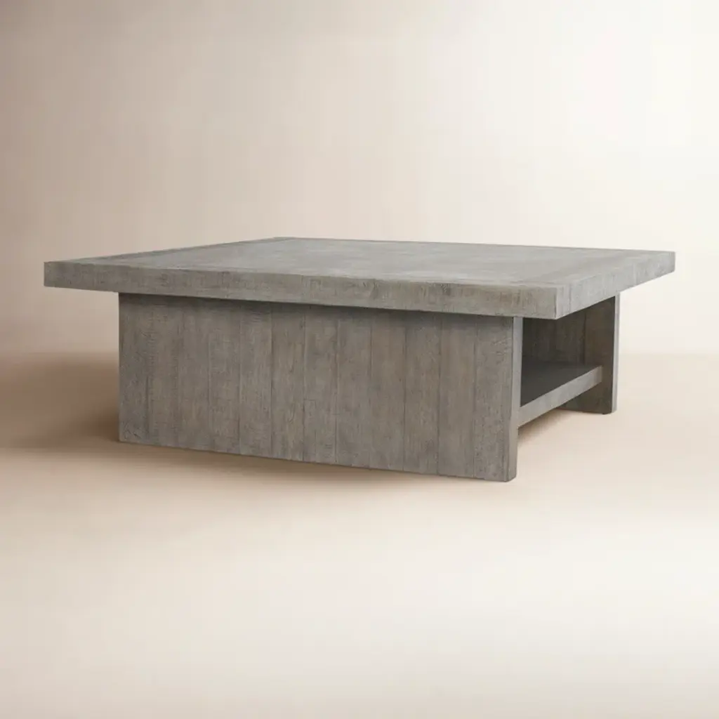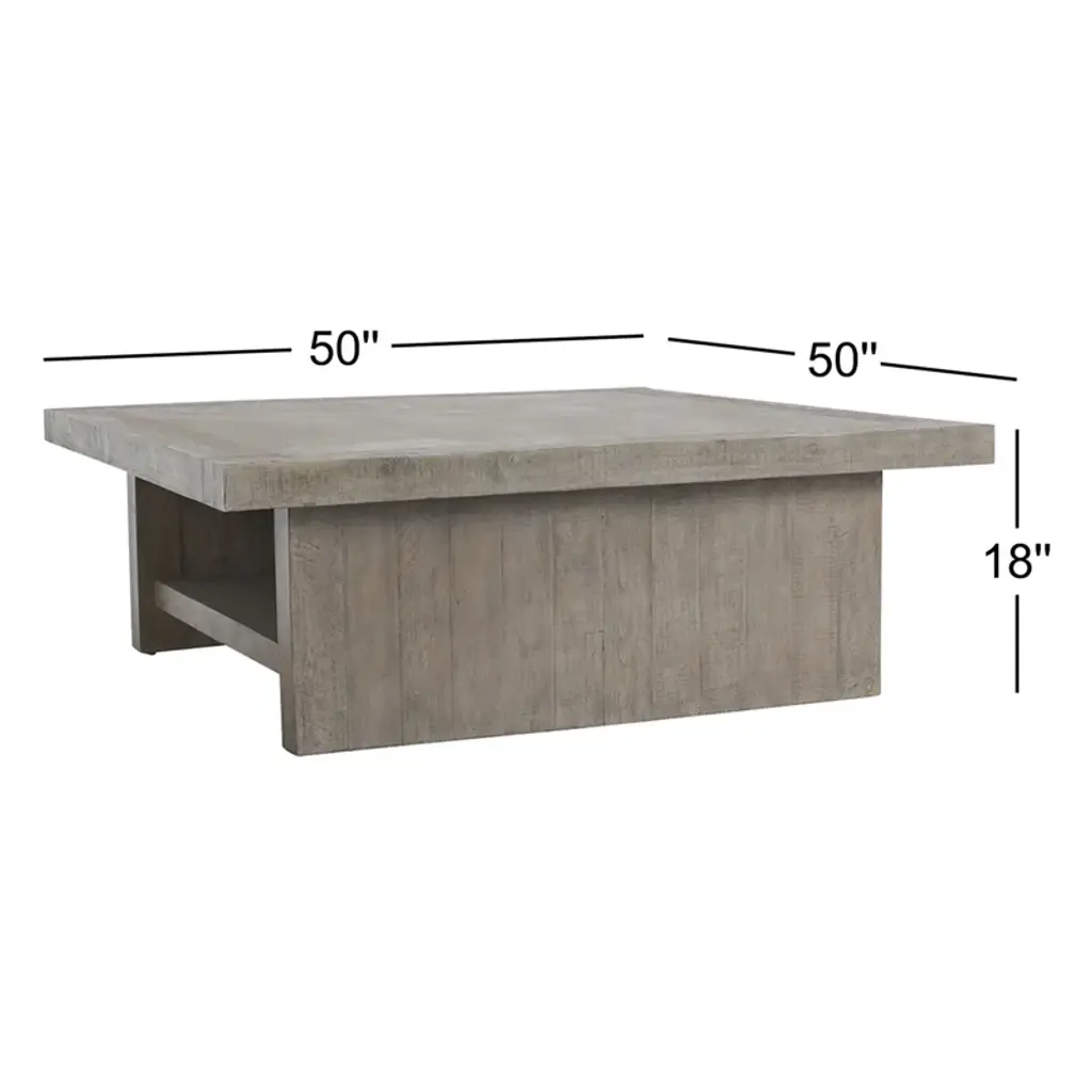 Discover a fresh take on mixed materials with this square coffee table, featuring a concrete laminate top inset on a solid wood base. The distressed gray base offers a touch of rustic charm, while the cut-out shelf provides added storage for your favorite books or decorative items. Measuring 18'' H x 50'' L x 50'' W, this table is a versatile addition to your living room, making it the perfect spot to gather around for game nights or cozy conversations. Some assembly is required.