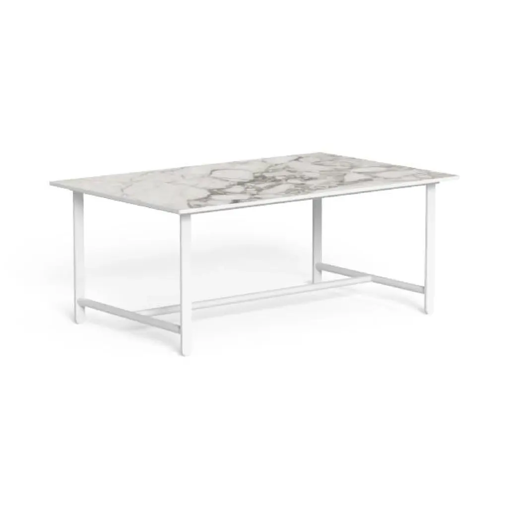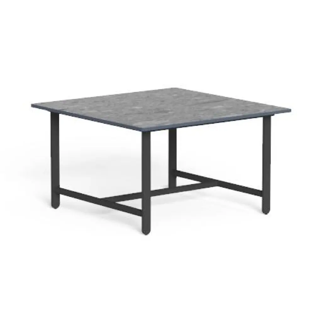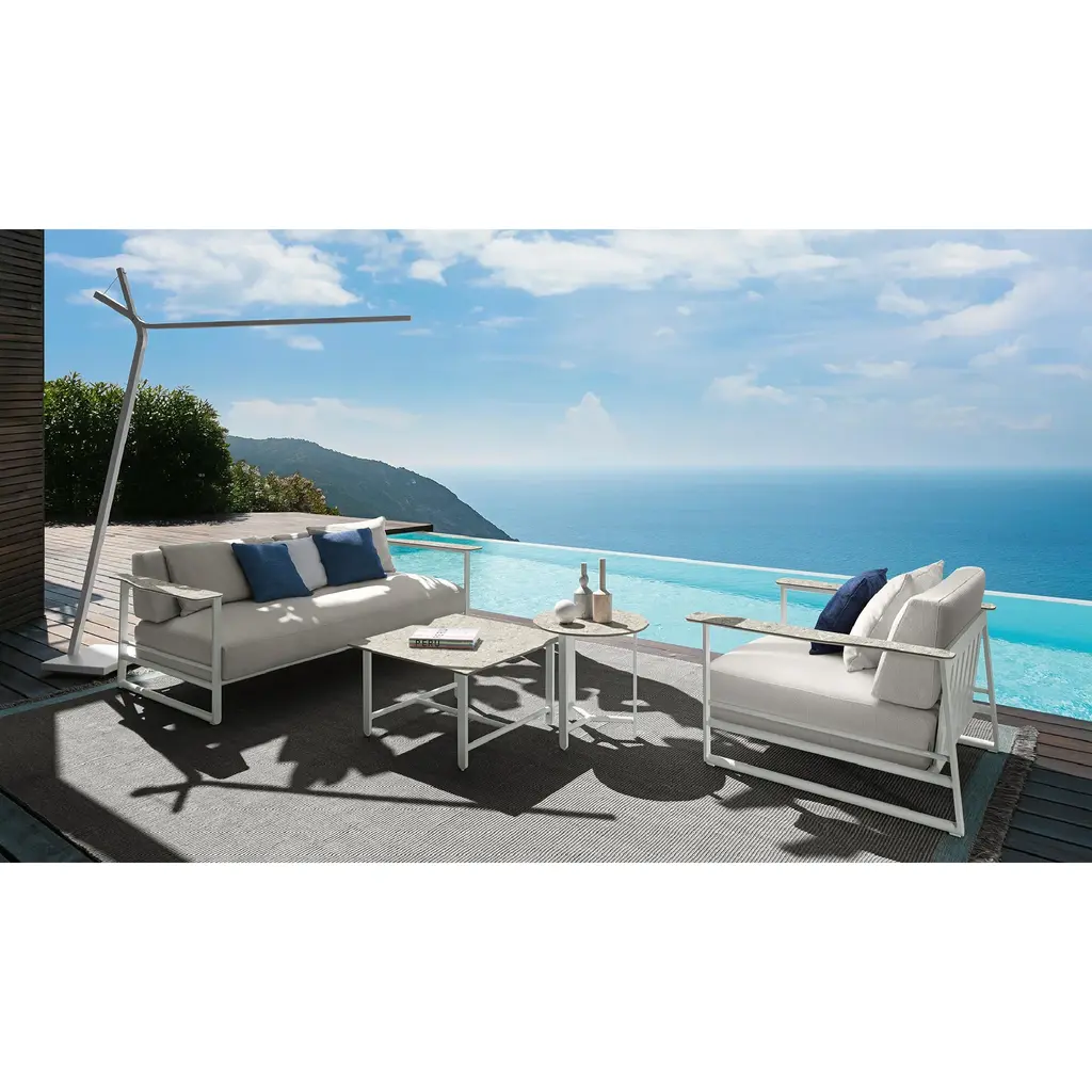 The coffee table is characterized by the same taste that dominate the entire collection. Its style recalls the armrests of the two-seater sofa and of the living armchair. The gres top conveys a refined touch to the simple and linear aluminum structure. Perfect for outdoor, this table land itself to create a wide range of outdoor decor.