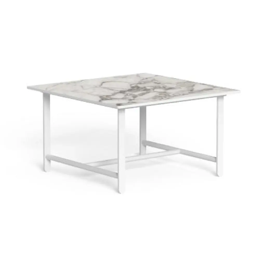 The coffee table is characterized by the same taste that dominate the entire collection. Its style recalls the armrests of the two-seater sofa and of the living armchair. The gres top conveys a refined touch to the simple and linear aluminum structure. Perfect for outdoor, this table land itself to create a wide range of outdoor decor.
