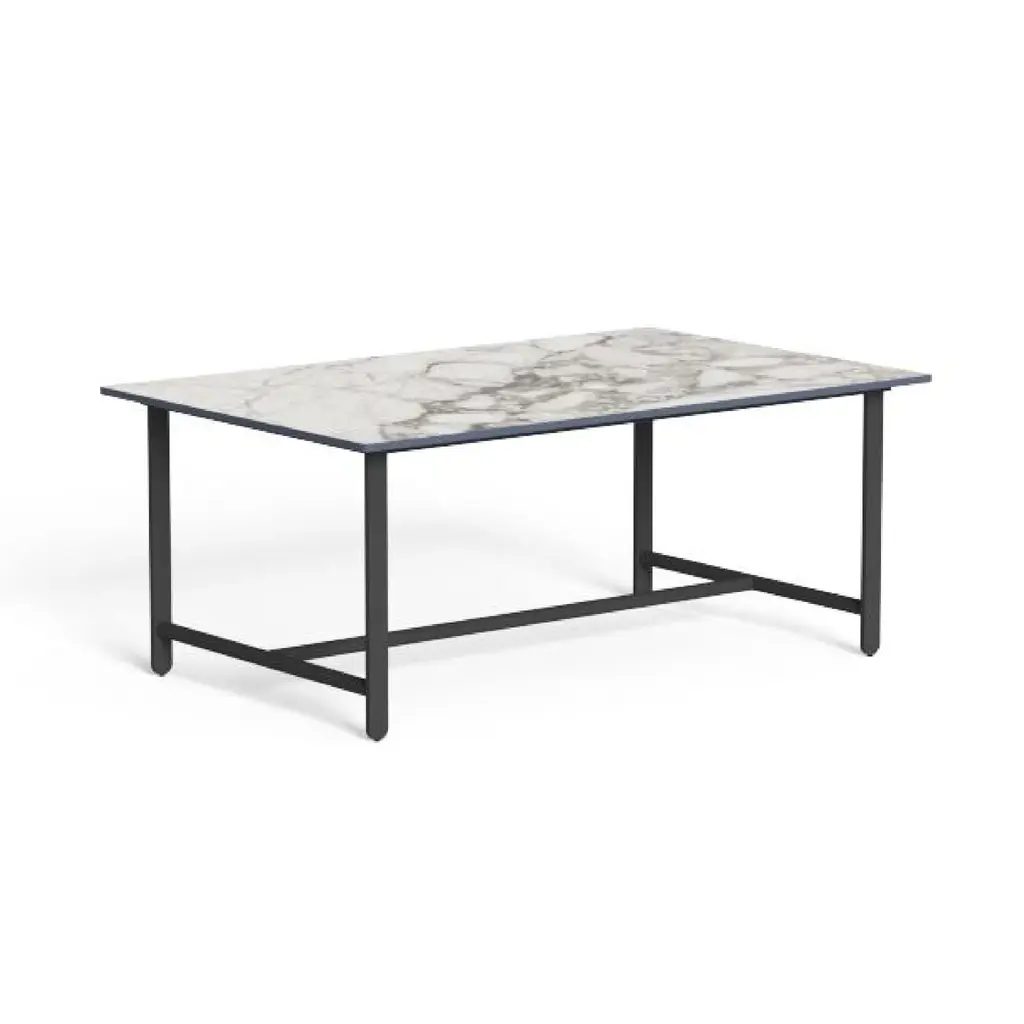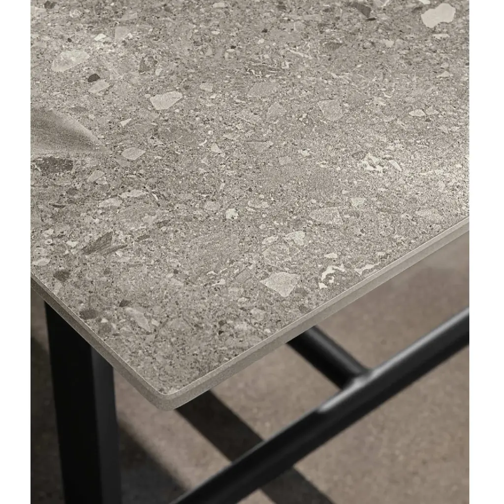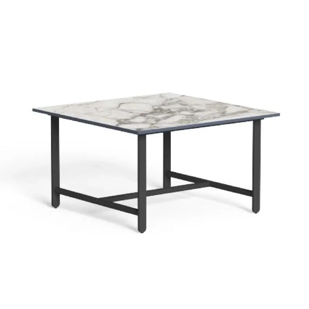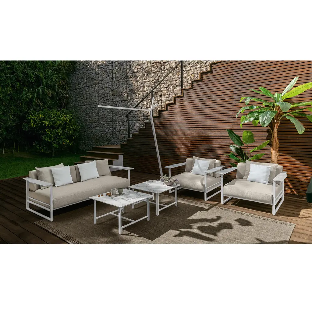 The coffee table is characterized by the same taste that dominate the entire collection. Its style recalls the armrests of the two-seater sofa and of the living armchair. The gres top conveys a refined touch to the simple and linear aluminum structure. Perfect for outdoor, this table land itself to create a wide range of outdoor decor.