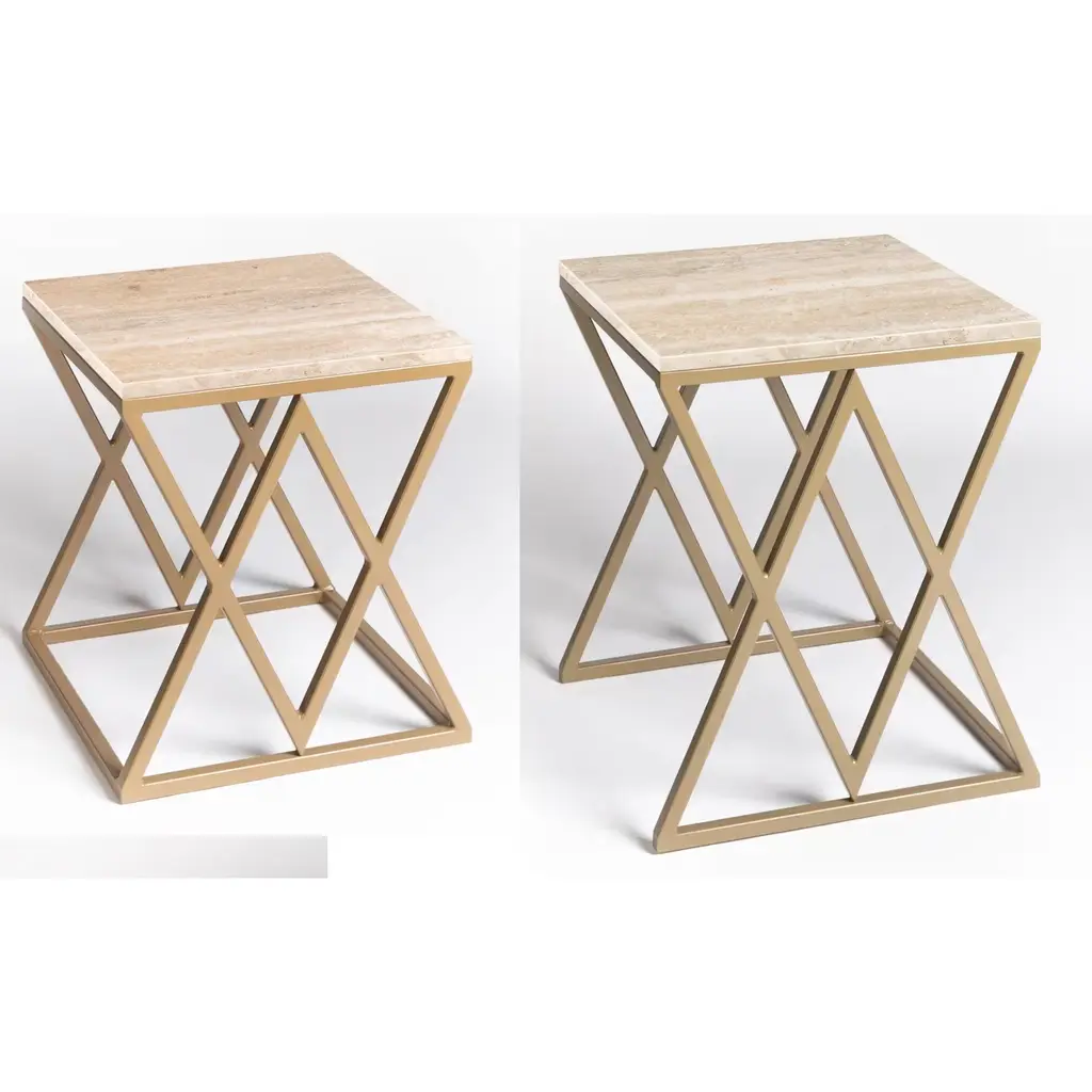 An elegant and delicate combination of hues, this magnificent set of two coffee tables will infuse timeless sophistication in a contemporary interior. Resting on a highly geometrical structure made of gold-lacquered iron, each piece is completed with a pink travertine marble top. The two tables measure: 45x45x50 cm and 50x50x60cm, and are customizable in metal finish and marble type. Please ask the Concierge for options.