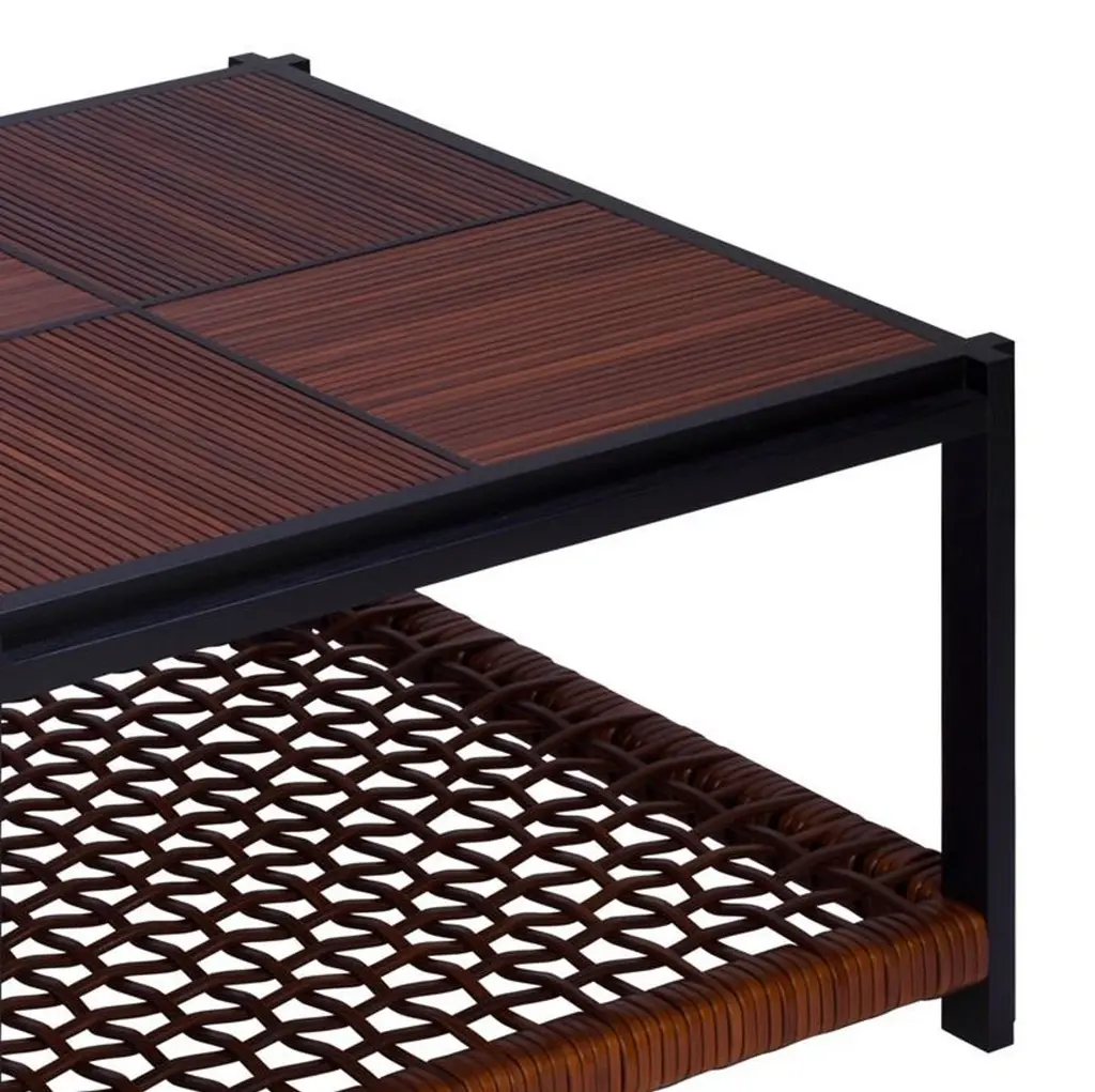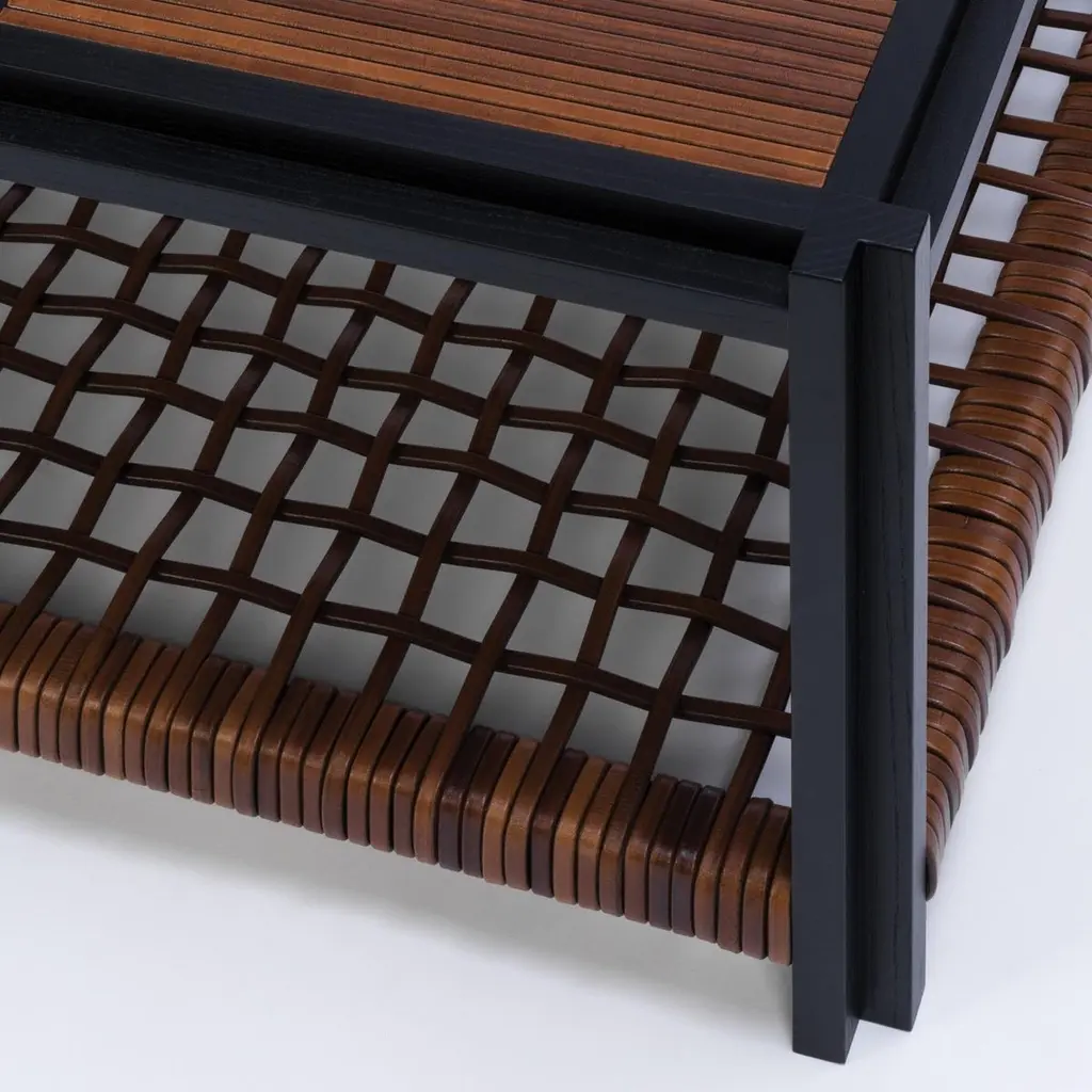 Part of the Structura collection, this versatile and precious coffee table will splendidly adorn a rustic-chic or contemporary interior, while also providing two shelves to hold and showcase books, plants, lights, or collectibles. The wooden structure with a walnut finish boasts legs in L-shaped cross section supporting bottom and top shelves elegantly made of interlaced brown leather strips. Also available in black leather with wenge-finished structure.