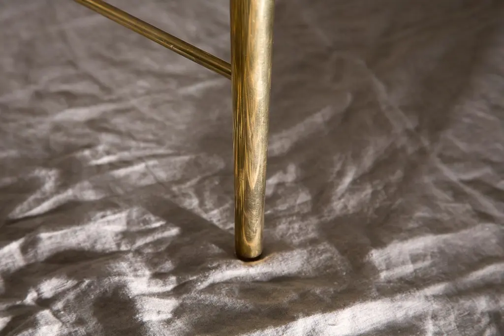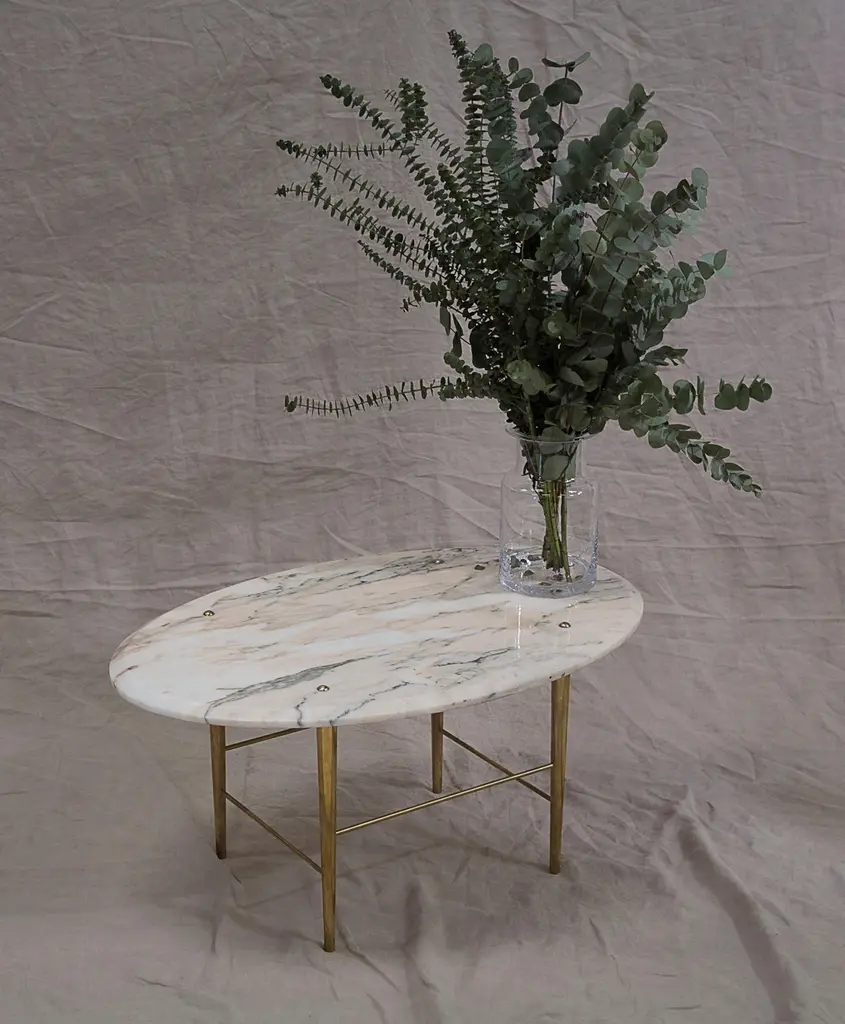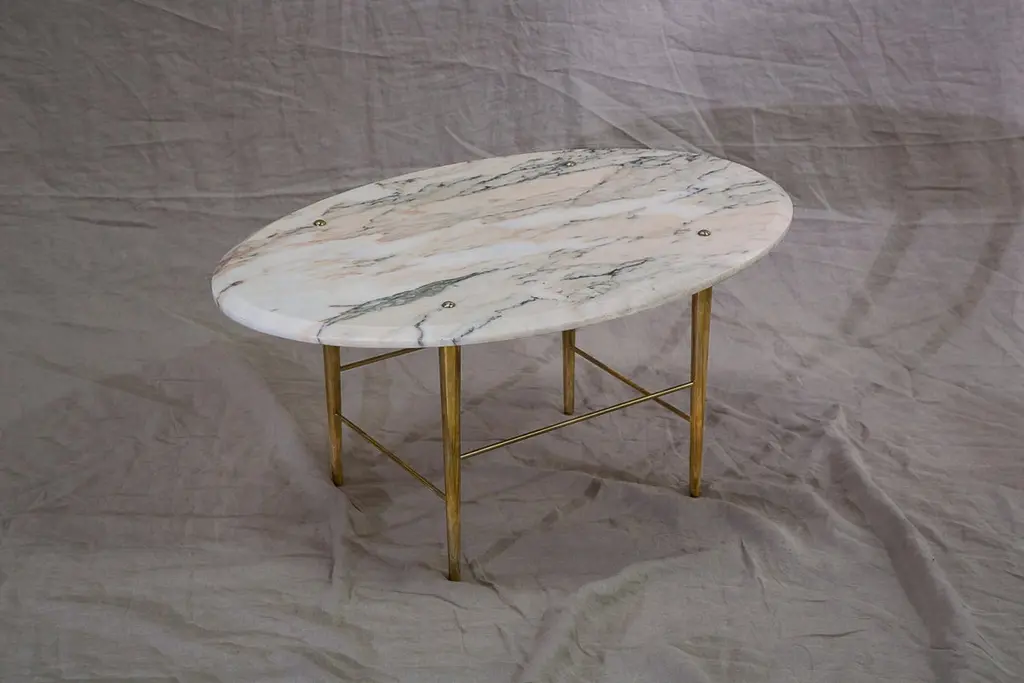 A coffee table in Portuguese marble and polished brass. Handcrafted to order in Northern England.Measures: 800 mm (L) x 500 mm (W) x 400 mm (H)Bespoke sizes and finishes available.
